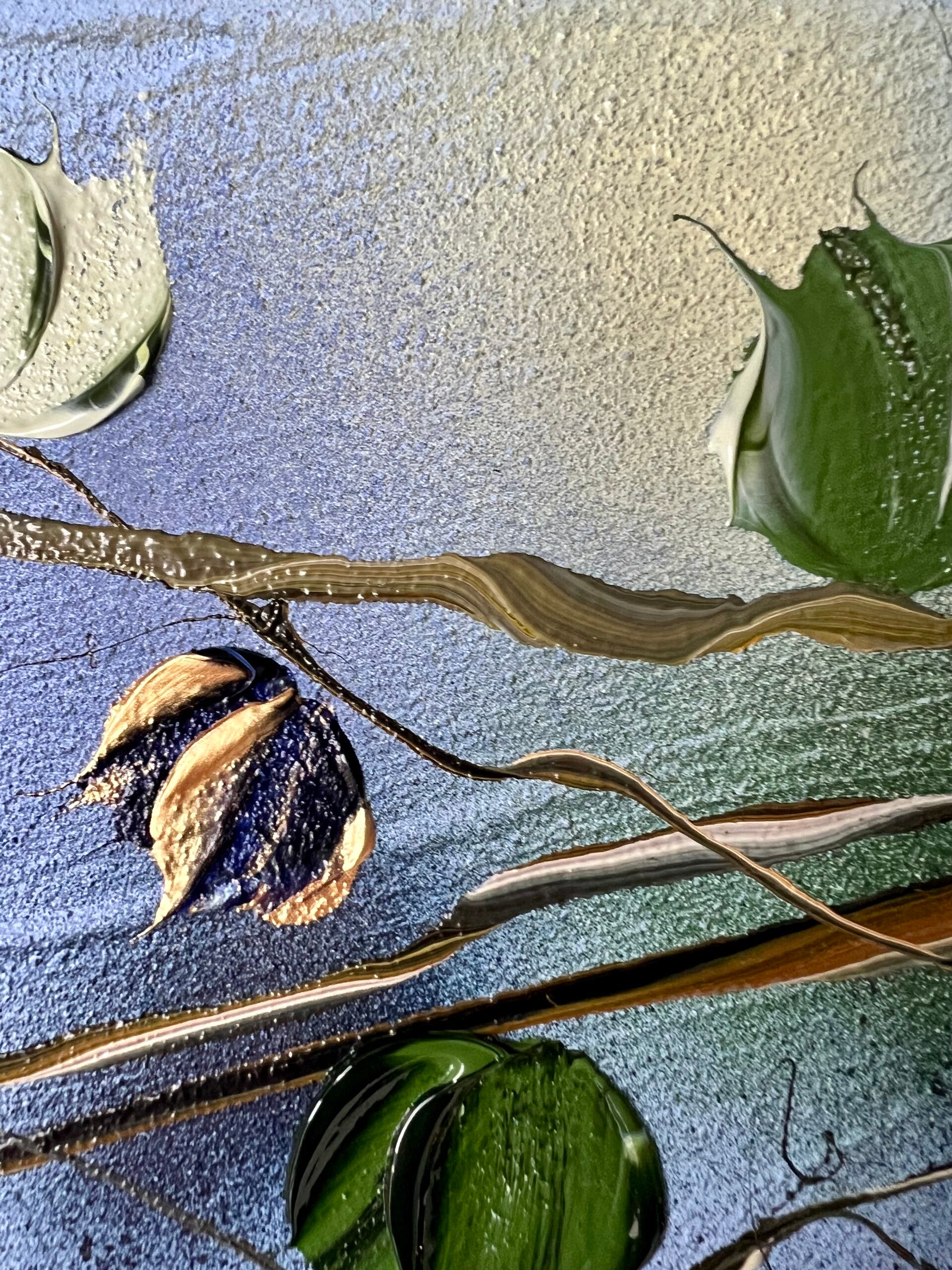 Style: My technique exhibits influences from abstract expressionism and modern art. I employ original mixed media, utilizing undiluted acrylic paint, ink, gel medium, and structure paste applied to the canvas. I enjoy creating impasto abstract paintings using spatulas, writing tubes, and even ordinary fruit knives to construct three-dimensional flowers and surfaces in my artworks. I incorporate transparent paint in some areas to emphasize the airiness and lightness inherent in nature.