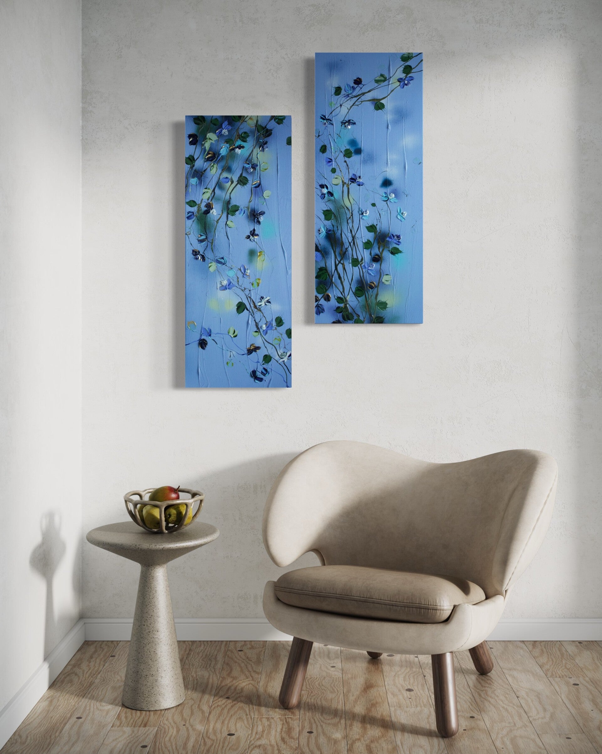 "Blue Spring" embodies a unique characteristic that sets it apart from other paintings. It can be experienced both individually and in conjunction with another piece from the series, allowing for both vertical and horizontal arrangements.