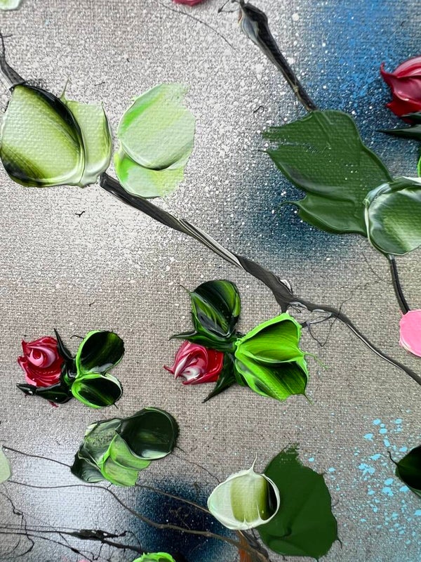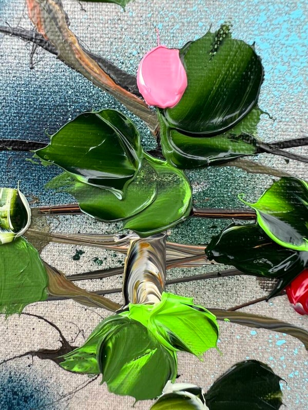 This painting features a serene composition of red and pink roses, capturing the essence of tranquility and self-contentment. The delicate roses, with their vibrant hues, are set against the texture of natural linen, creating a harmonious blend of color and form.