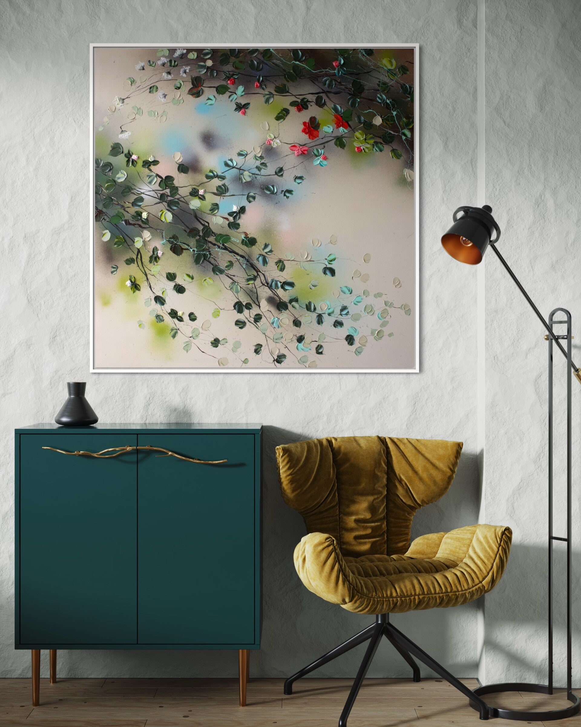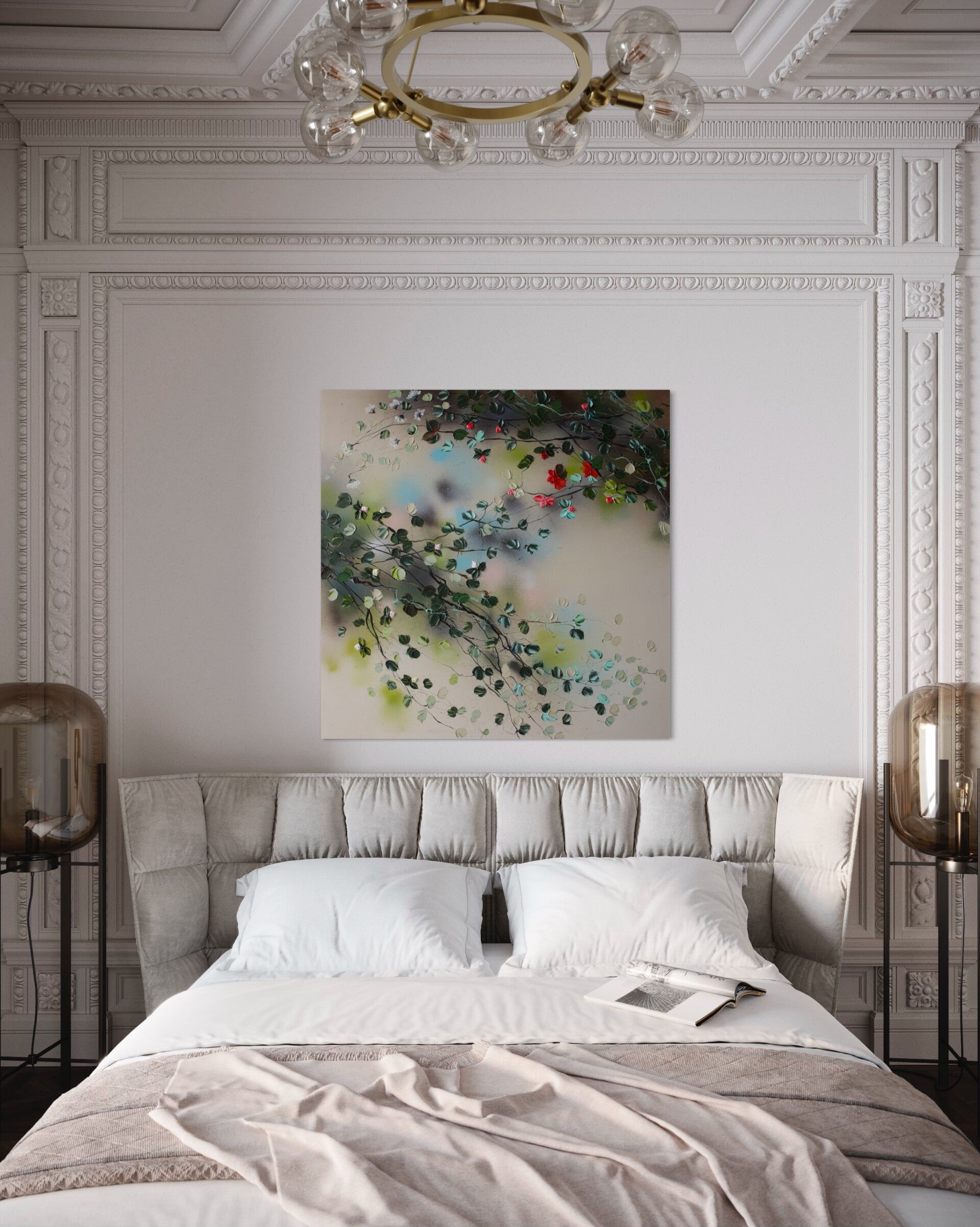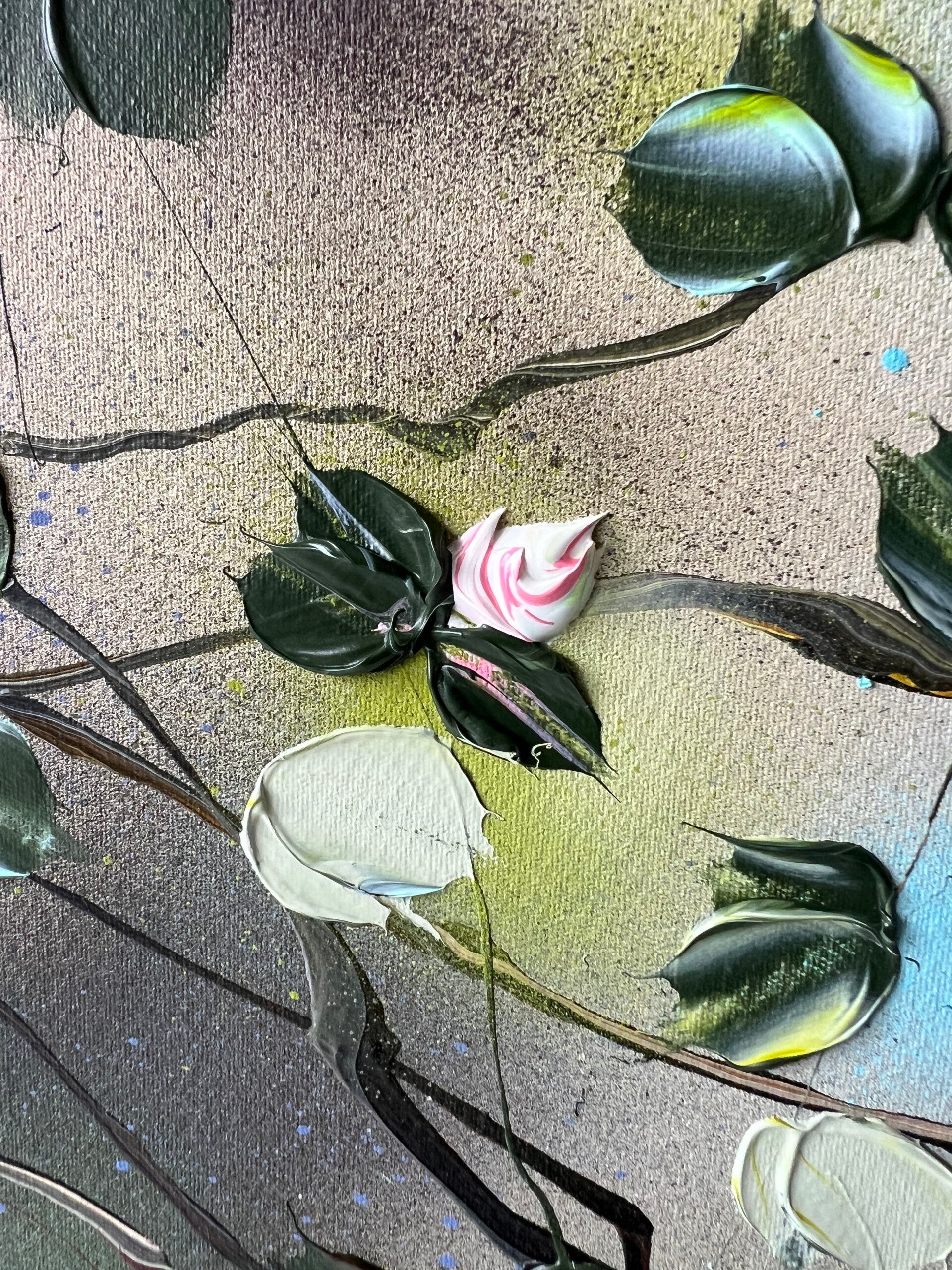 Capturing delicacy through floral imagery, the meticulous strokes and carefully chosen colors create a subtle and harmonious atmosphere, allowing one to sense the fragrance through the visual representation. Executed with acrylics and delicate sprays, the artwork embodies an intricate exploration of subtlety.