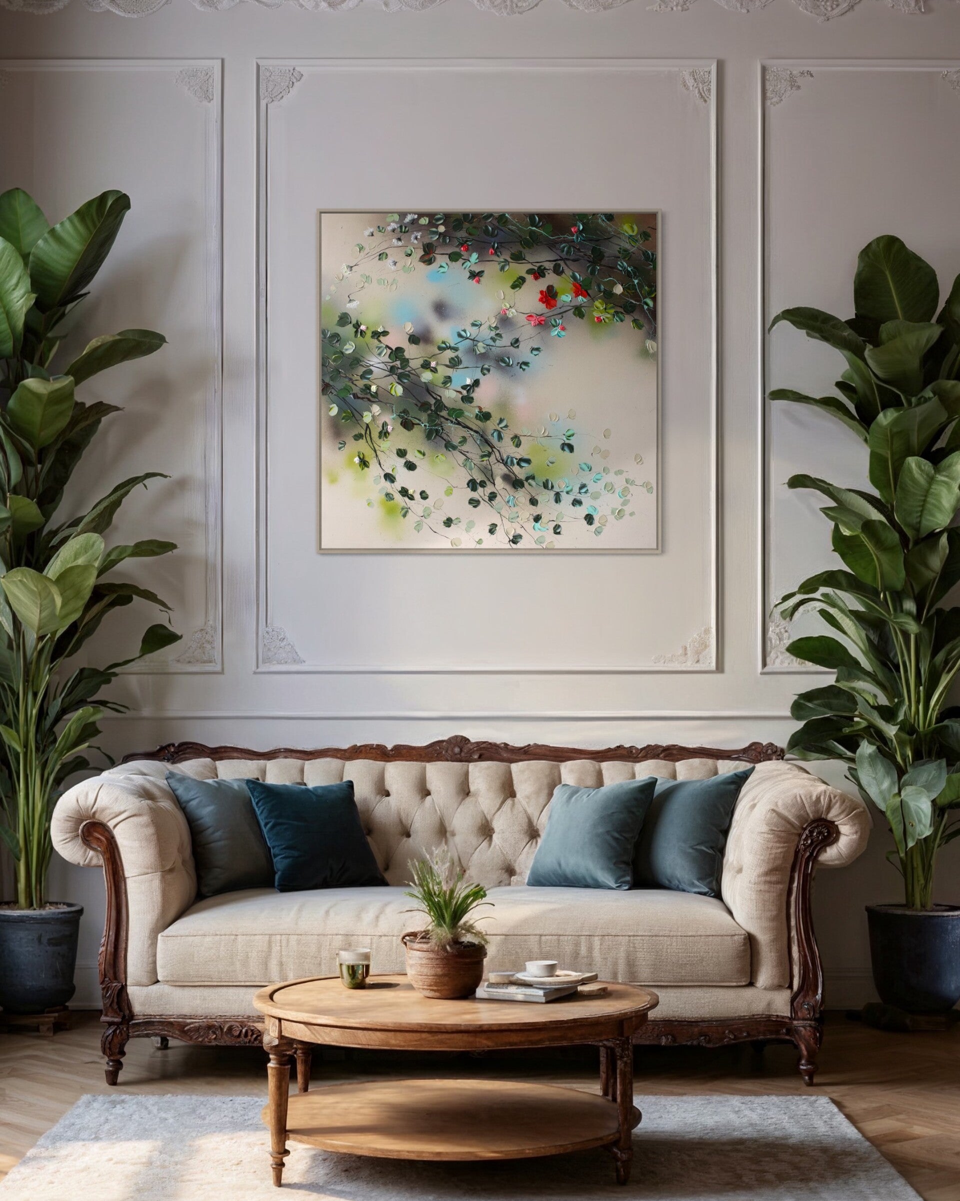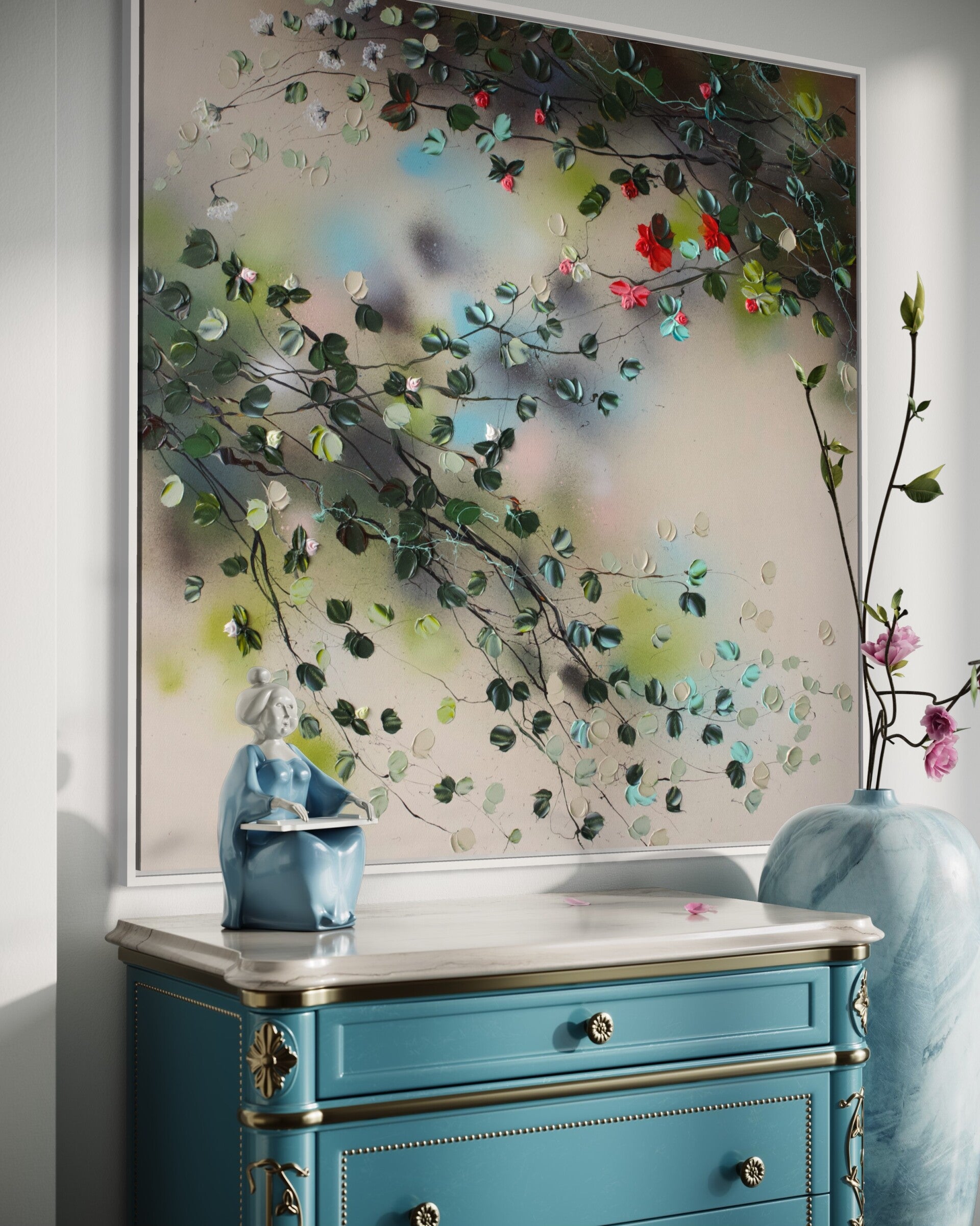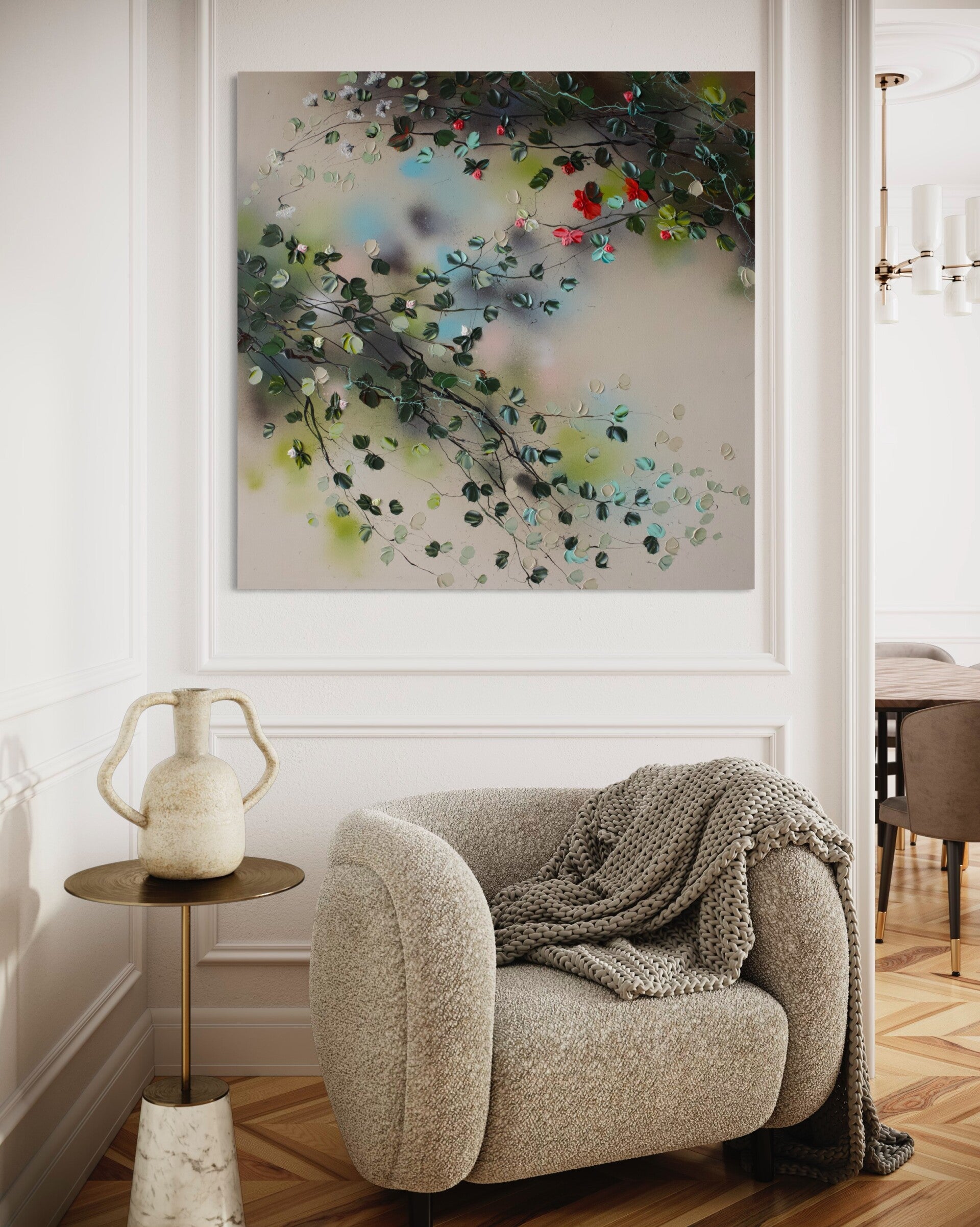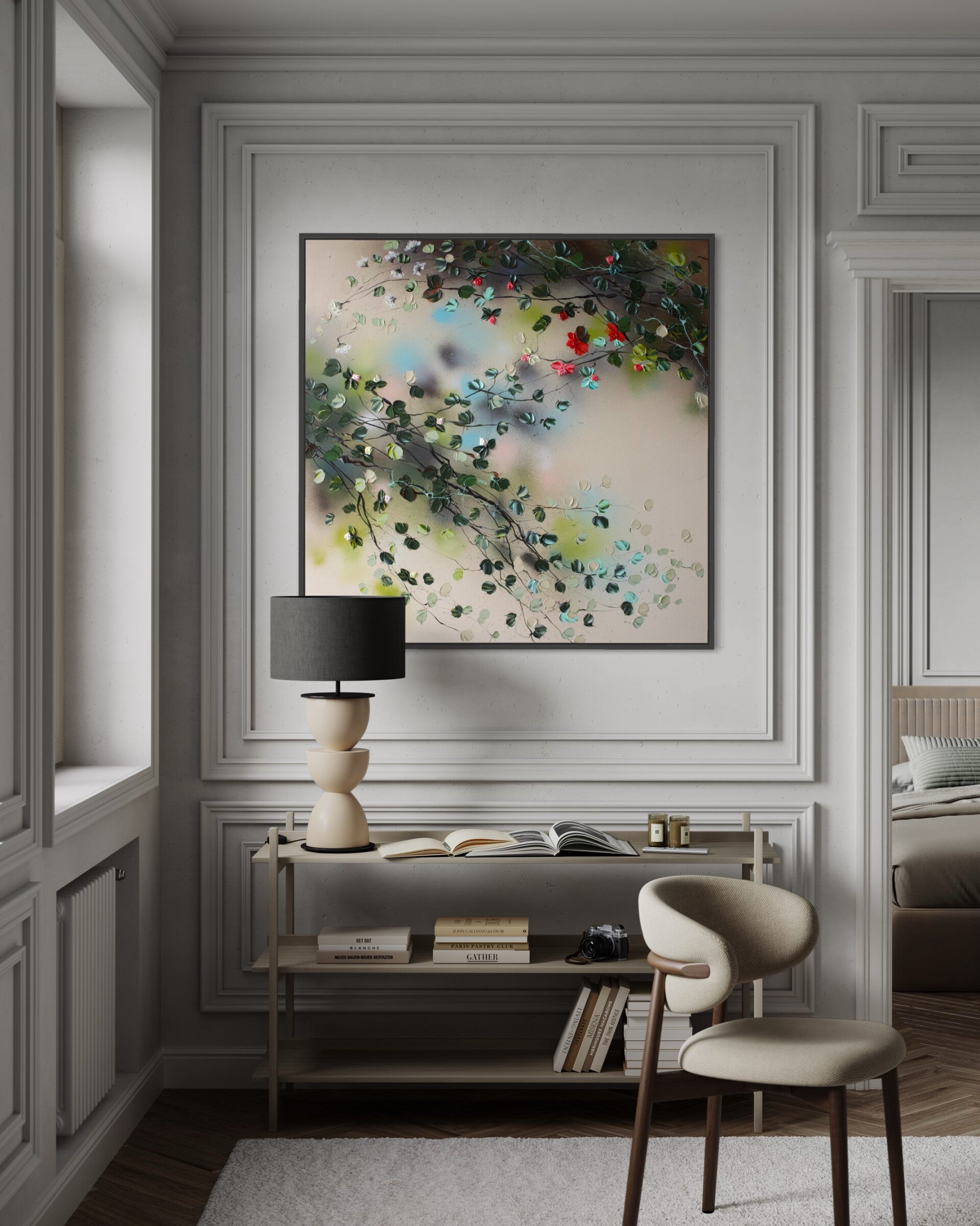 Capturing delicacy through floral imagery, the meticulous strokes and carefully chosen colors create a subtle and harmonious atmosphere, allowing one to sense the fragrance through the visual representation. Executed with acrylics and delicate sprays, the artwork embodies an intricate exploration of subtlety.