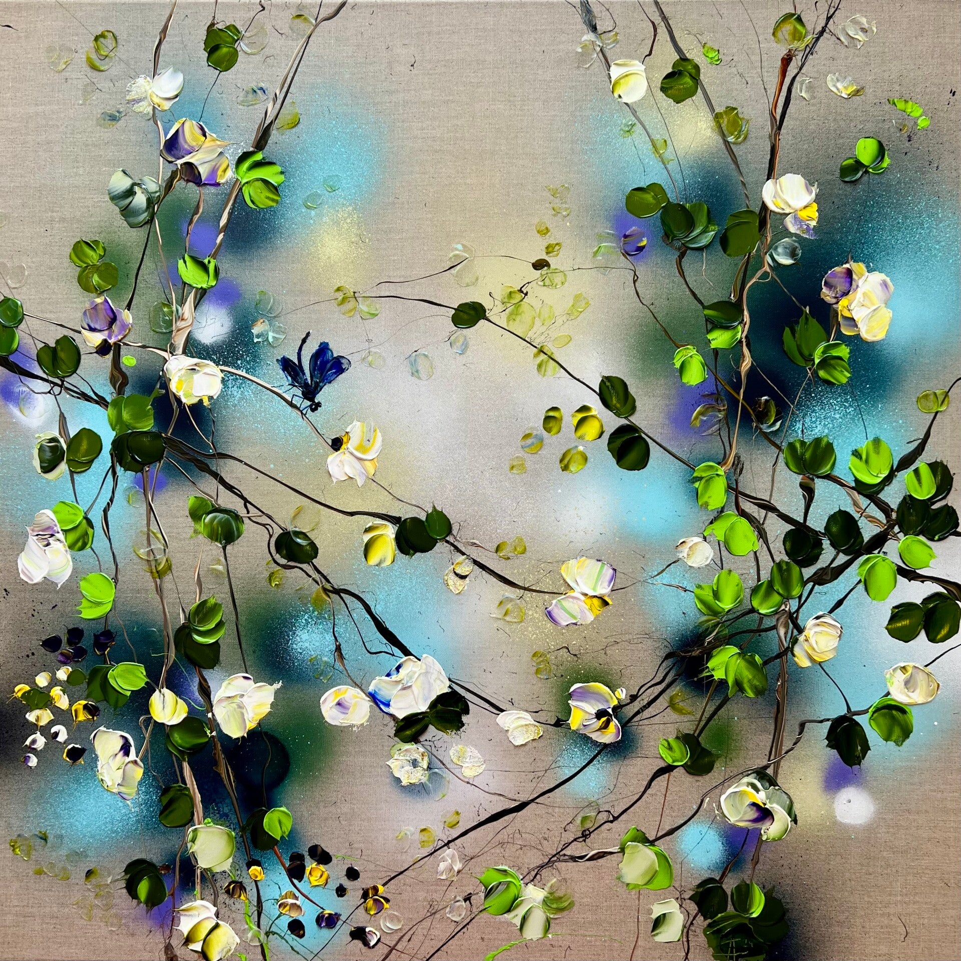 "White Flowers" colorful artwork on linen, 80x80cm