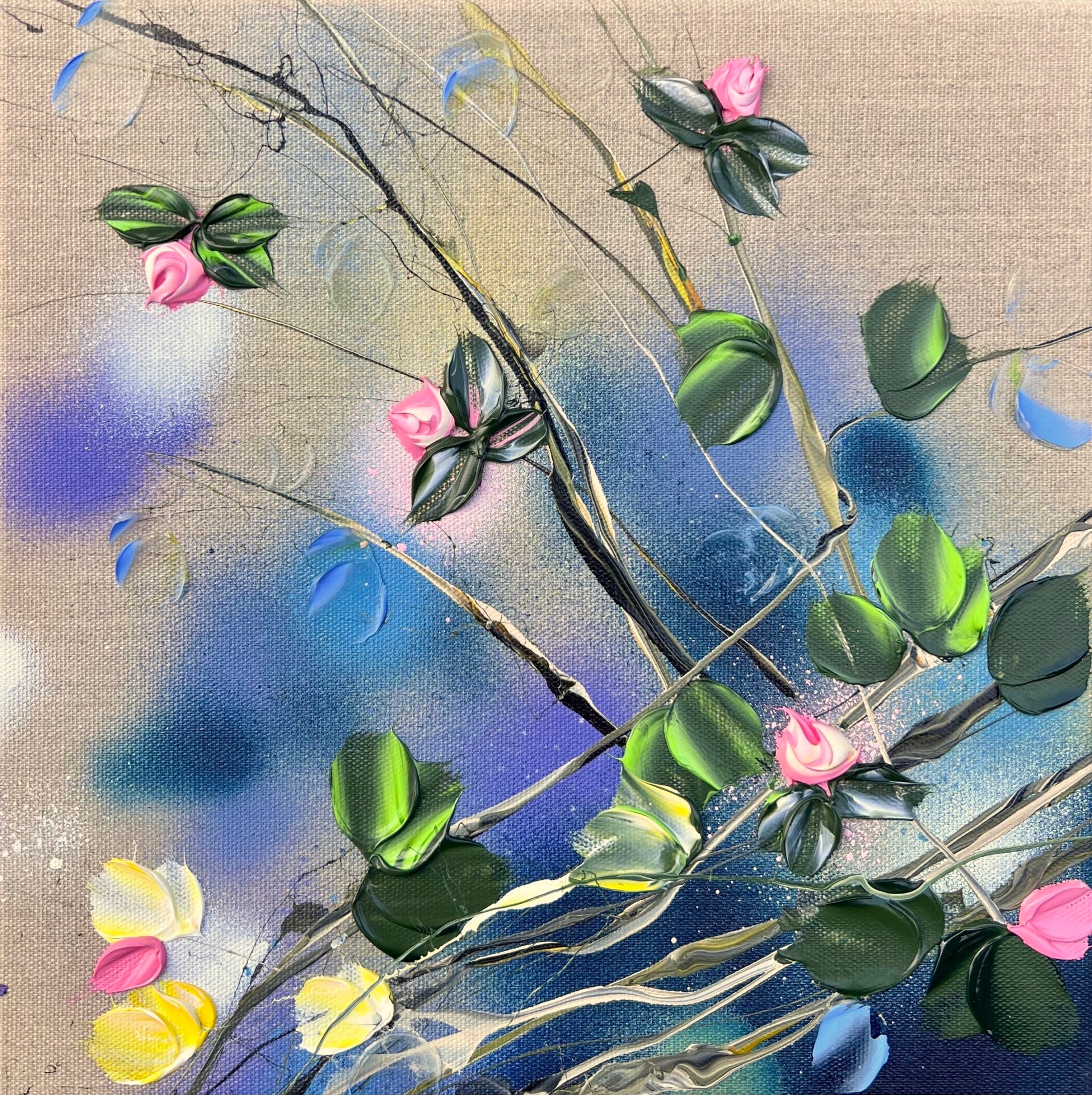 "A Piece of Garden" pink roses on linen canvas, 30x30x4 cm