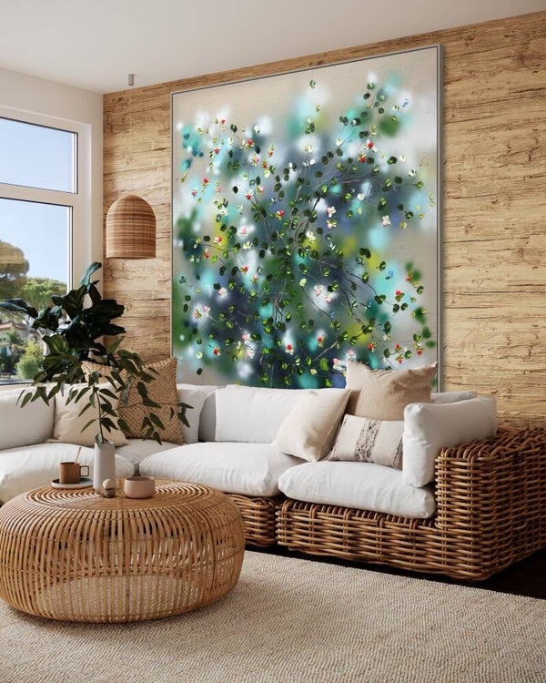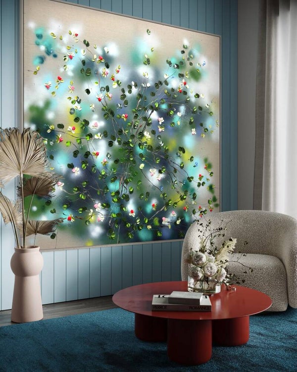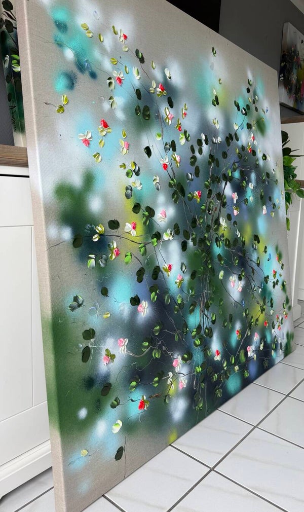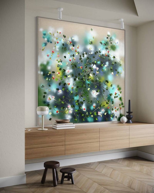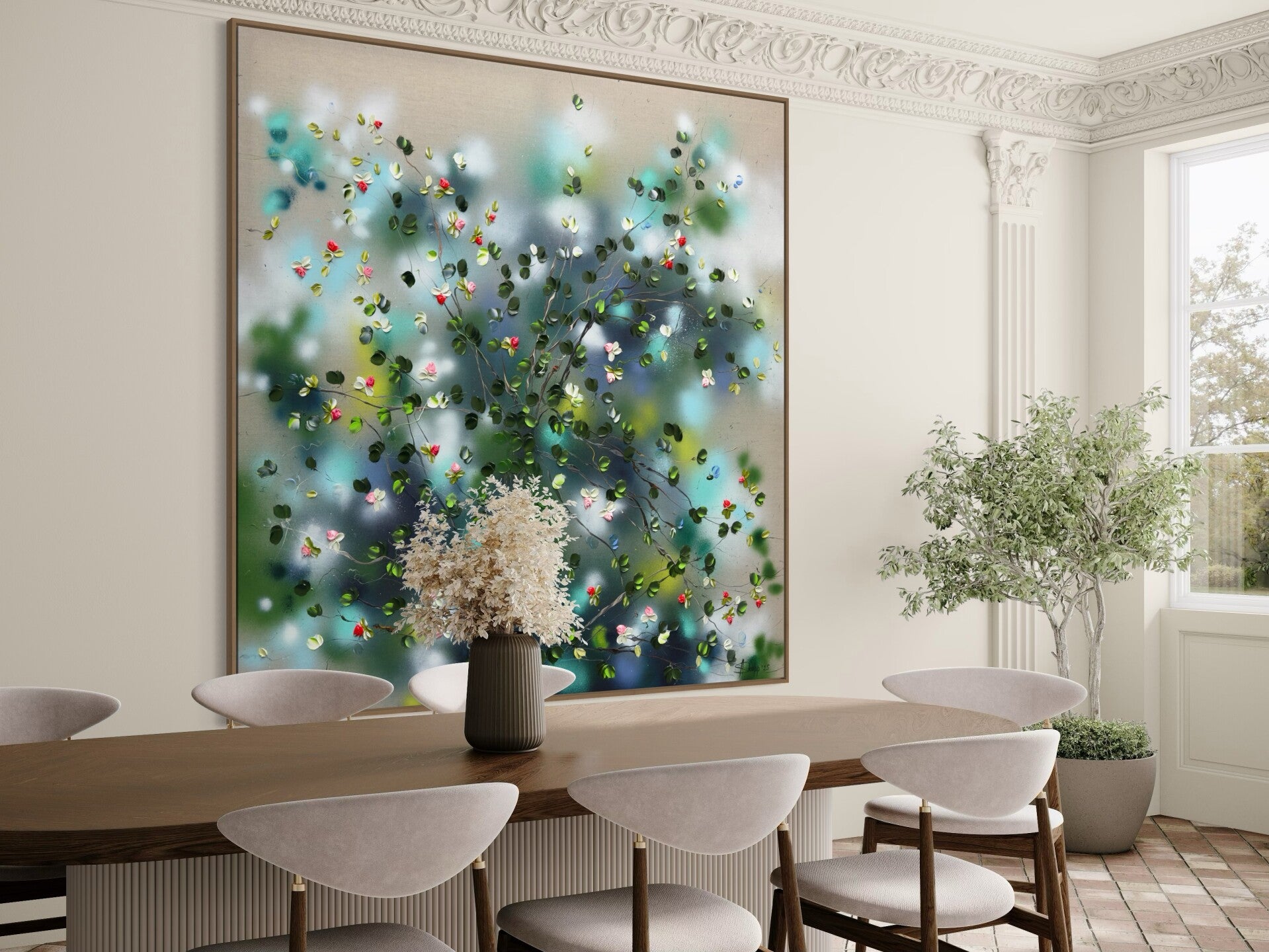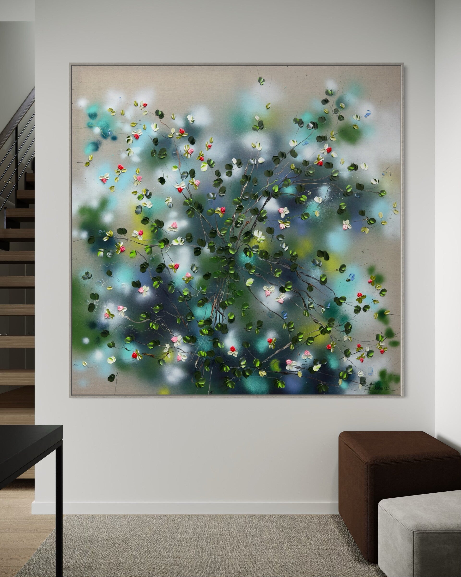 Immerse yourself in the serene world of vibrant abstraction with my oversized linen canvas, measuring 155x155 cm /61x61 inches (on the stretcher 145x145 cm/57x57 inches). Inspired by the teachings of Eckhart Tolle, my art reflects the profound wisdom of living in the present moment, symbolized by the timeless beauty of flowers.