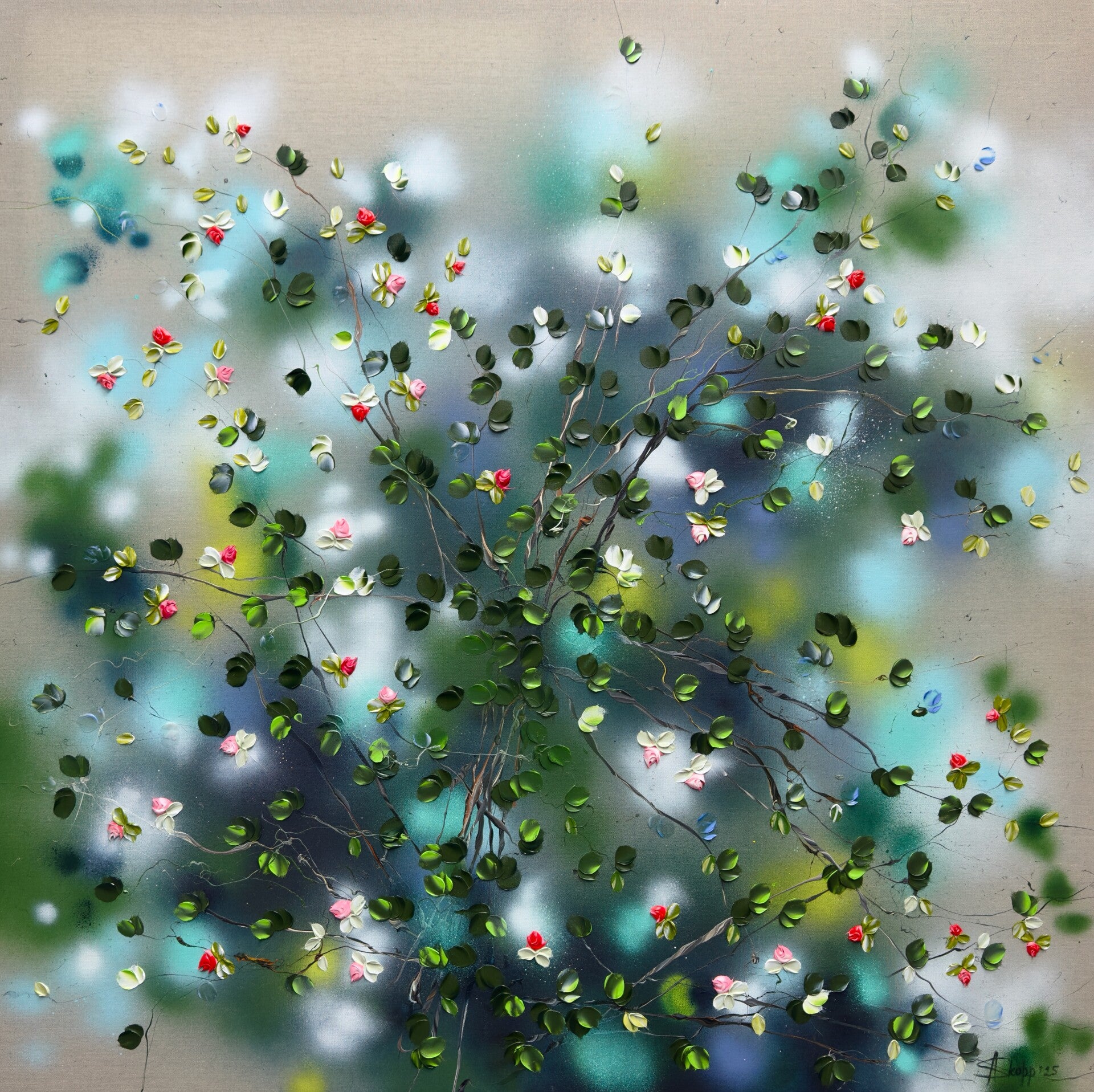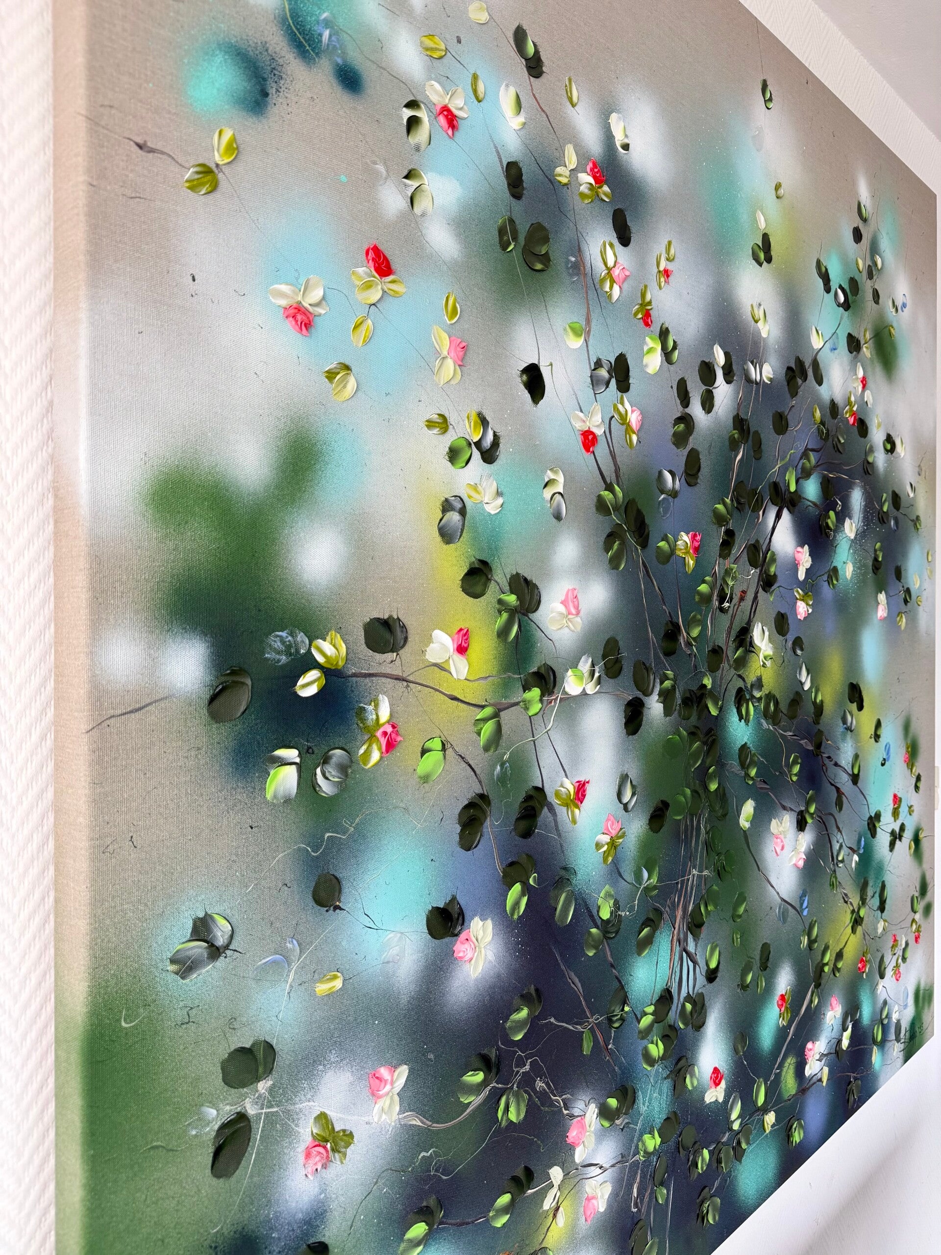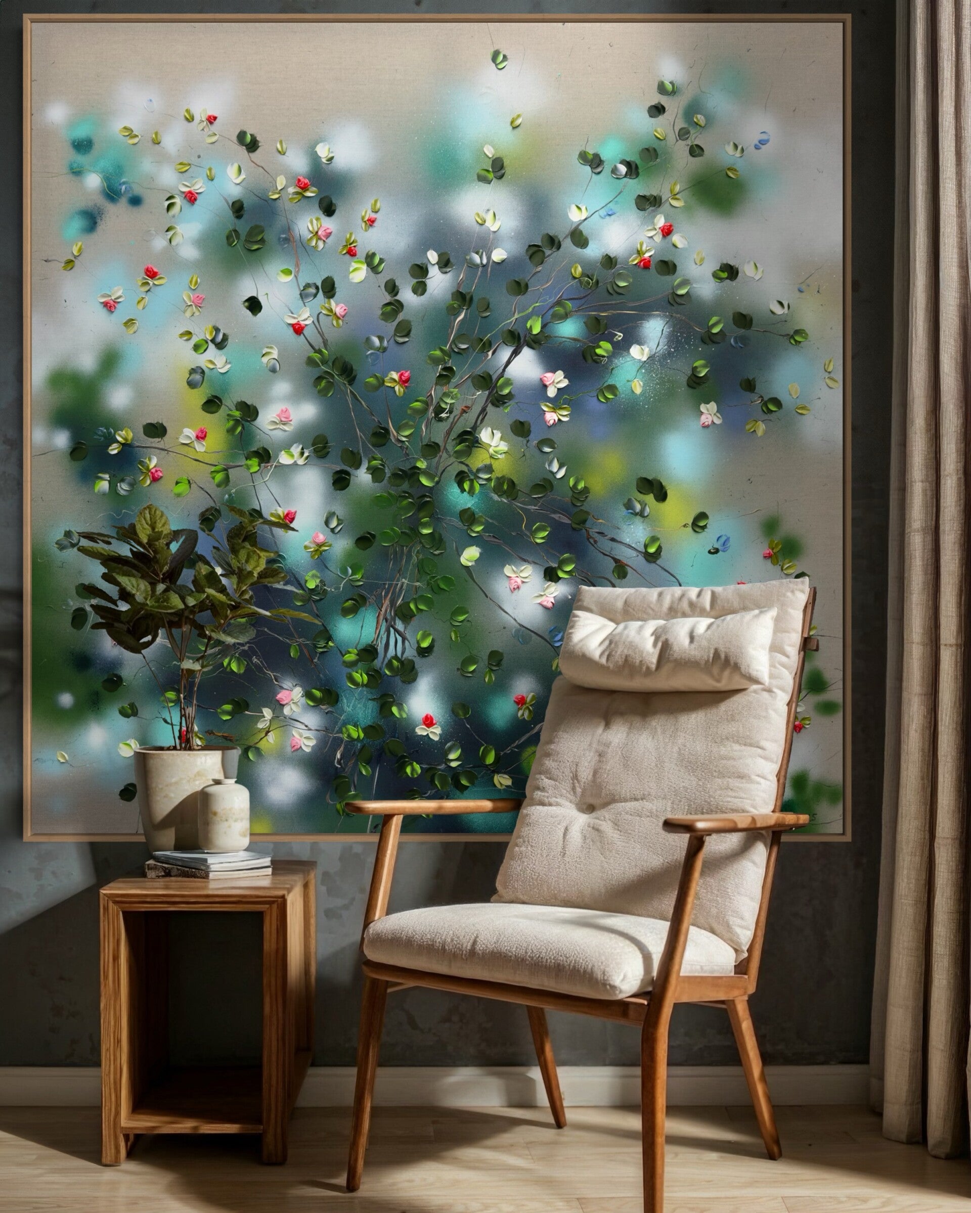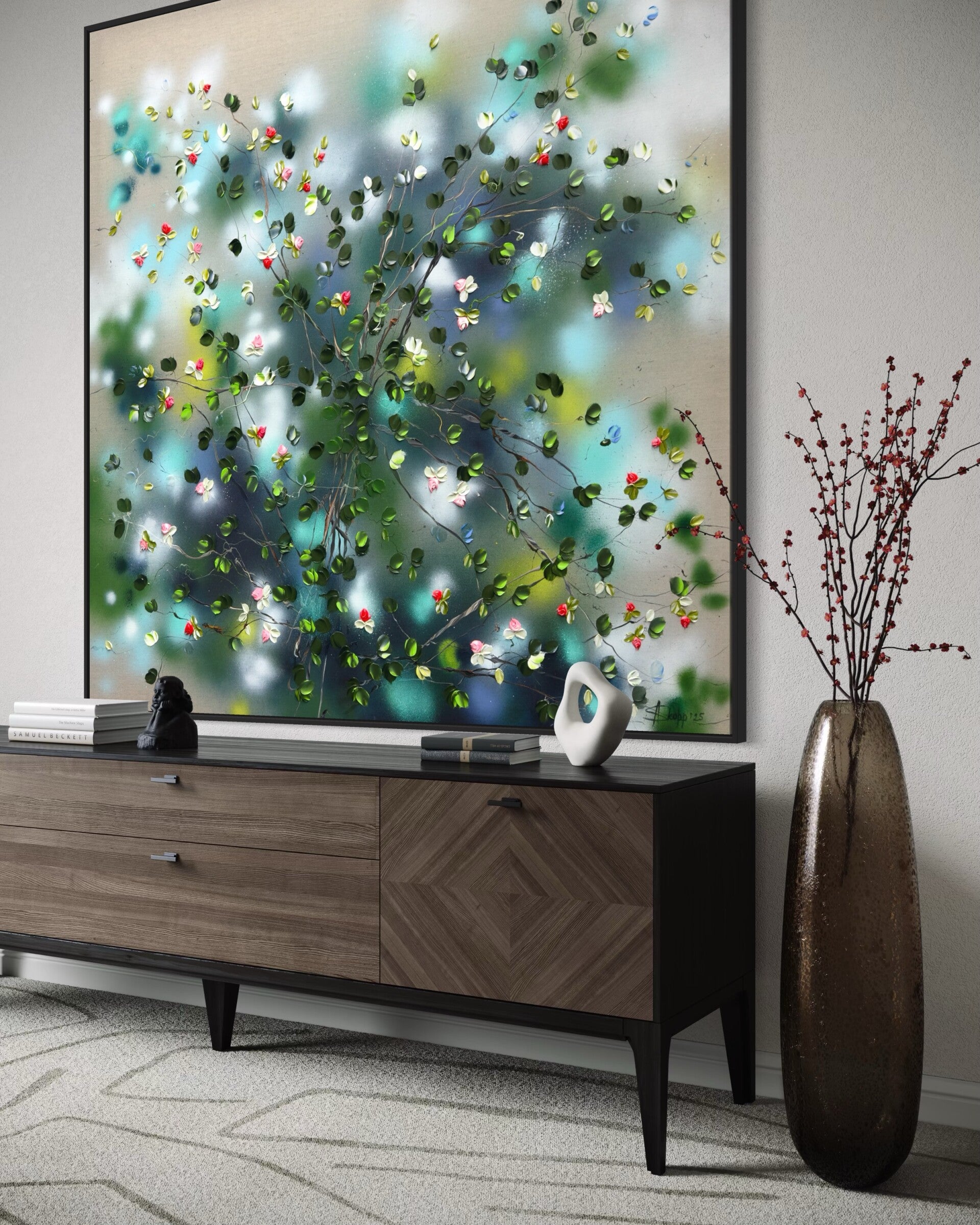 Immerse yourself in the serene world of vibrant abstraction with my oversized linen canvas, measuring 155x155 cm /61x61 inches (on the stretcher 145x145 cm/57x57 inches). Inspired by the teachings of Eckhart Tolle, my art reflects the profound wisdom of living in the present moment, symbolized by the timeless beauty of flowers.