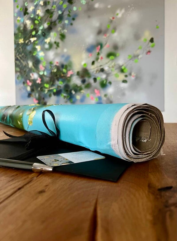 The artwork is signed, dated and titled on the reverse and ships in a tube. This method is particularly safe for oversized works and ensures lower transport costs. Rolled works may be easily stretched upon arrival (placed on wooden stretchers for canvases) and/or framed by a local framer.