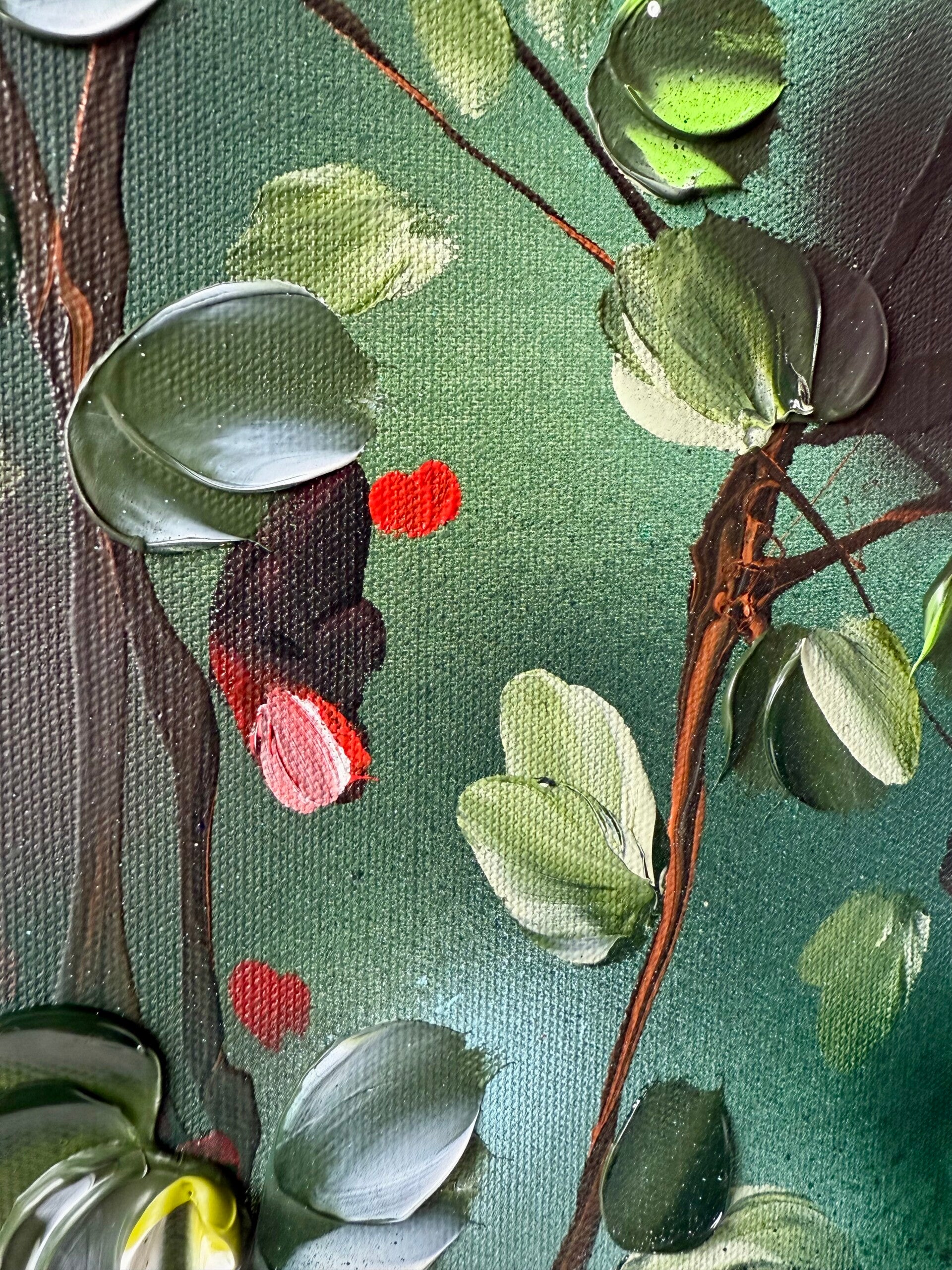 The flowers are painted using a combination of palette knife and brushwork, blending expressive impasto texture with light, airy gestures. Some petals rise from the canvas in sculptural form, while others are softly swept on, creating a rich interplay of depth and detail.