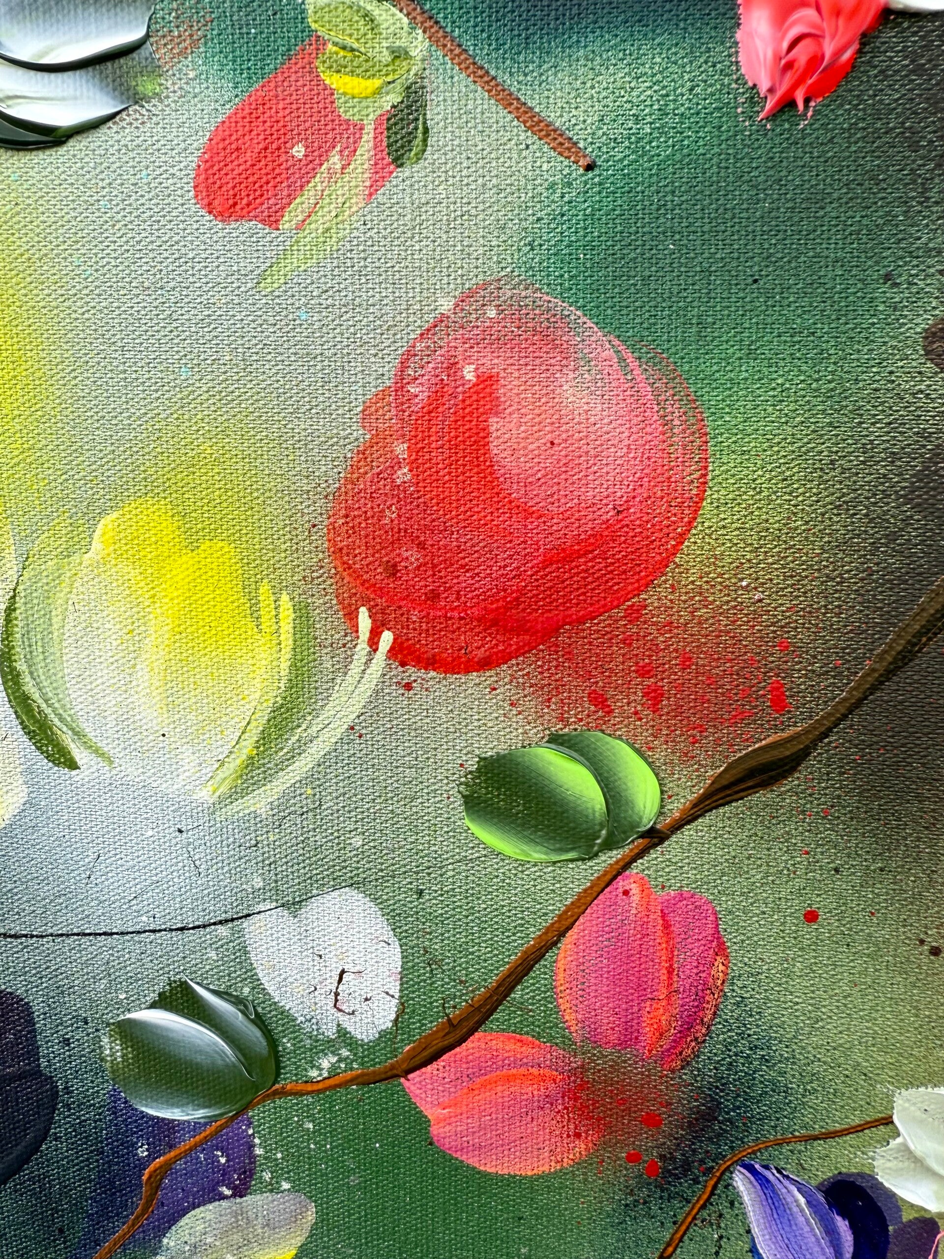 Let your gaze rest on the vibrant colors of this abstract floral artwork, where each brushstroke captures the essence of nature's quiet beauty. Inspired by the stillness and serenity found in the natural world, this painting invites you to pause and connect with the present moment.