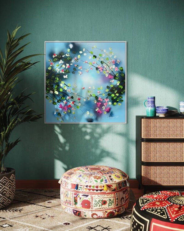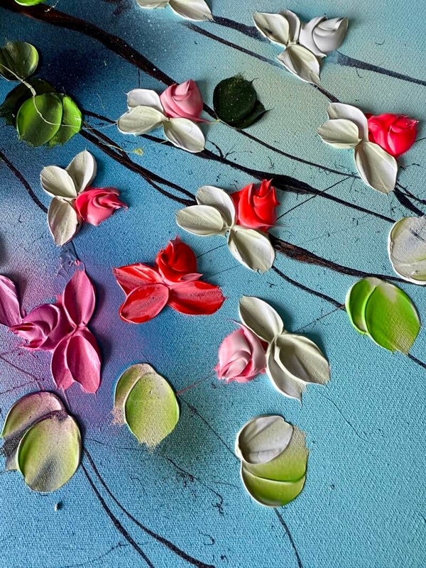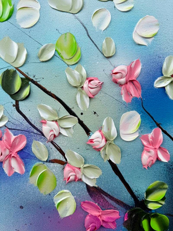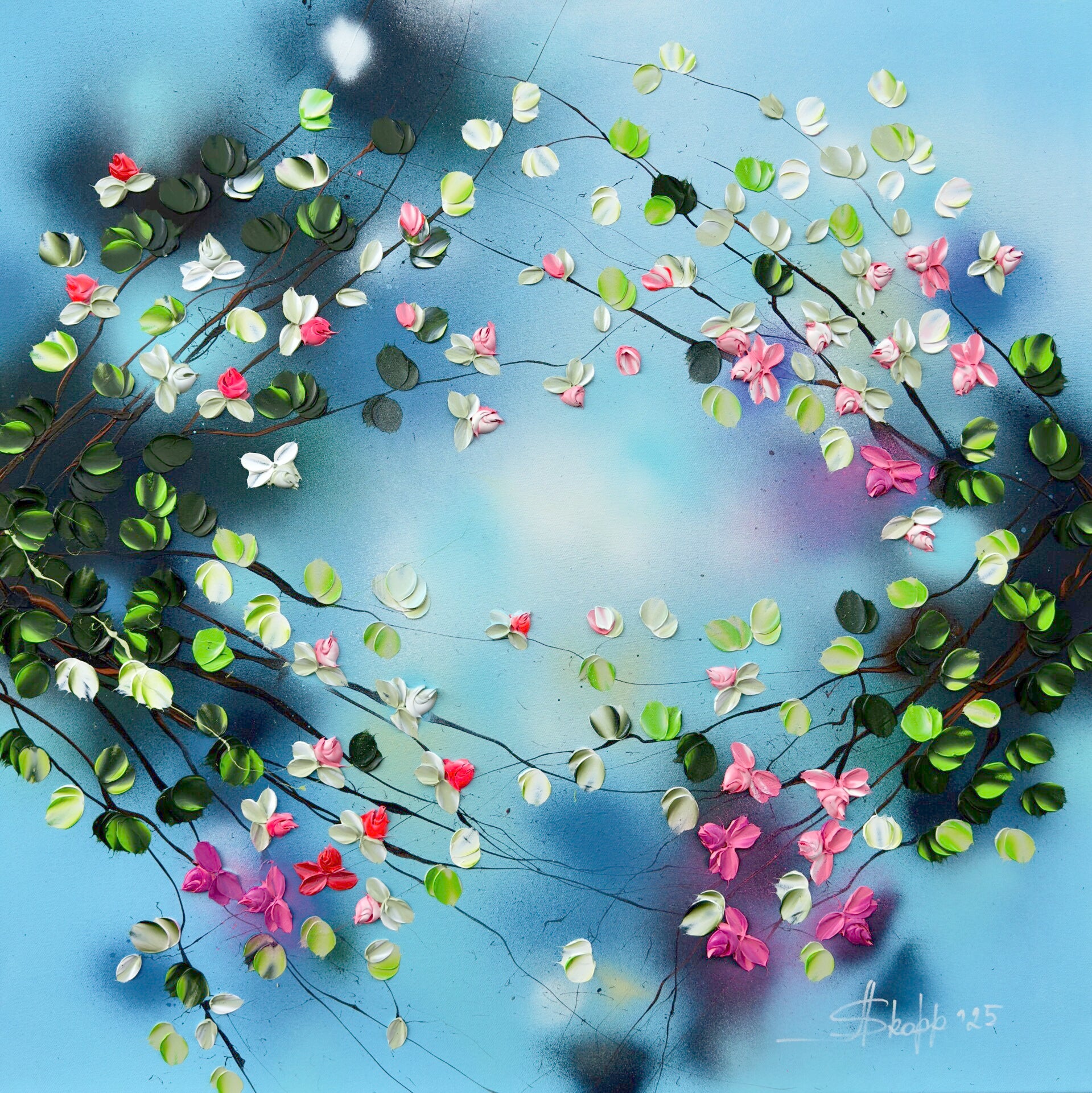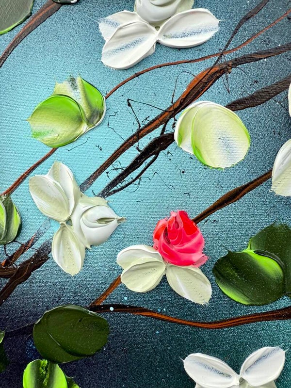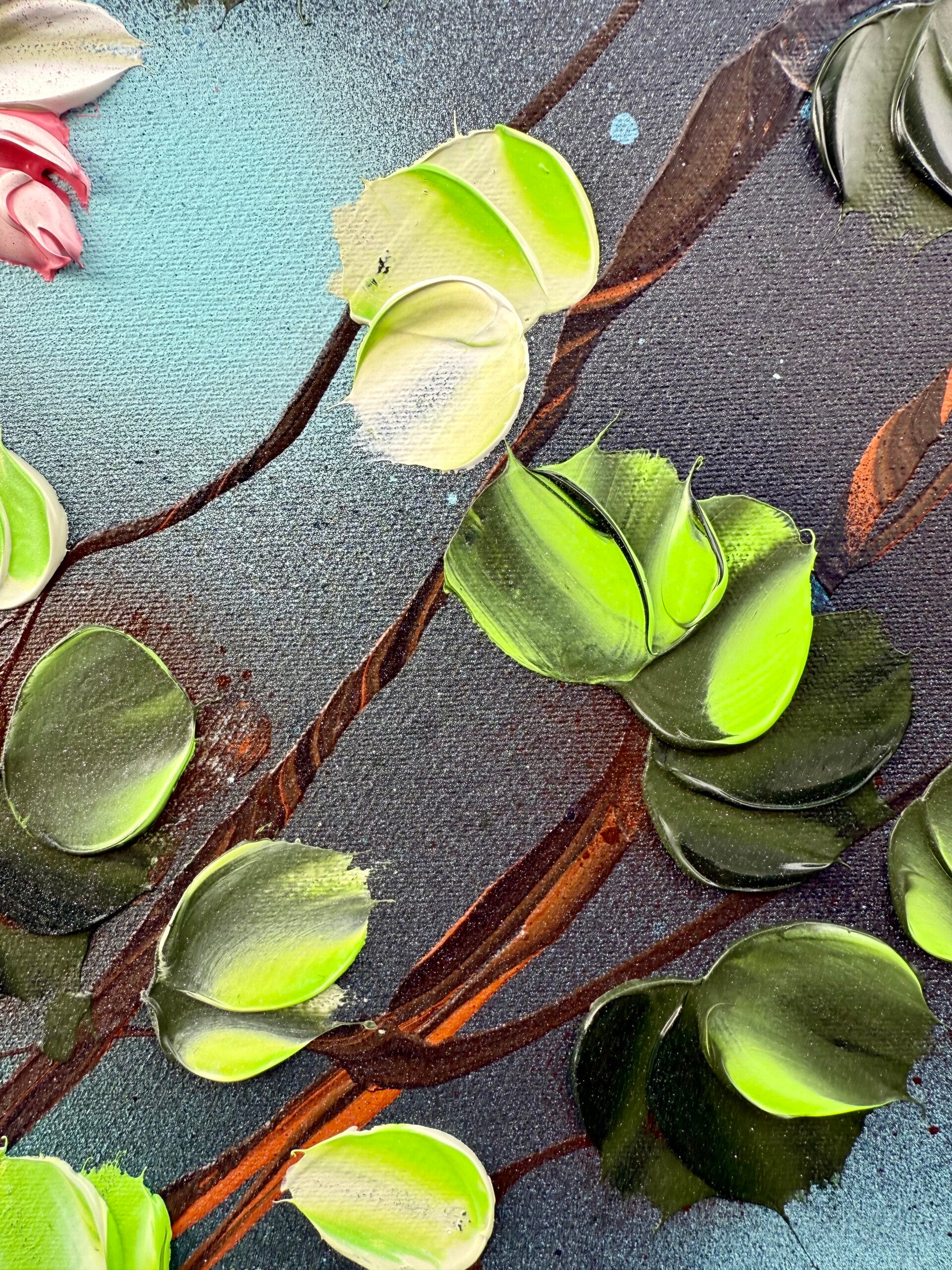 Romantic Moment I features a circular composition of delicate blossoms in shades of white, pink, and red, unfolding against a soft, atmospheric blue background. The leaves, painted in a vibrant spectrum of green tones, create a flowing rhythm that guides the viewer’s gaze across the canvas. The palette knife technique adds sculptural texture and dimensionality to the petals and foliage.