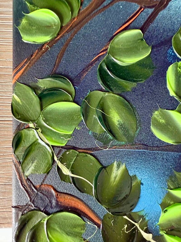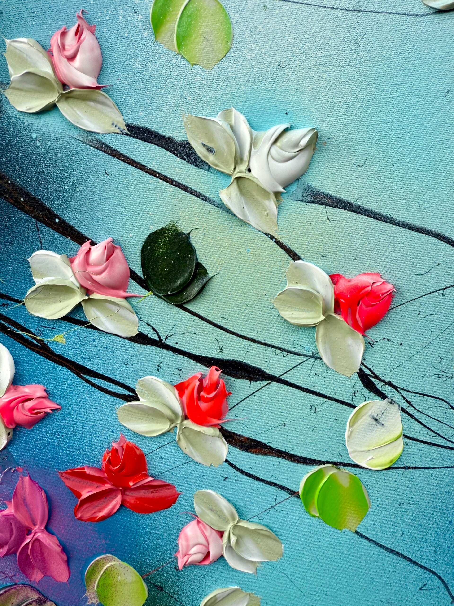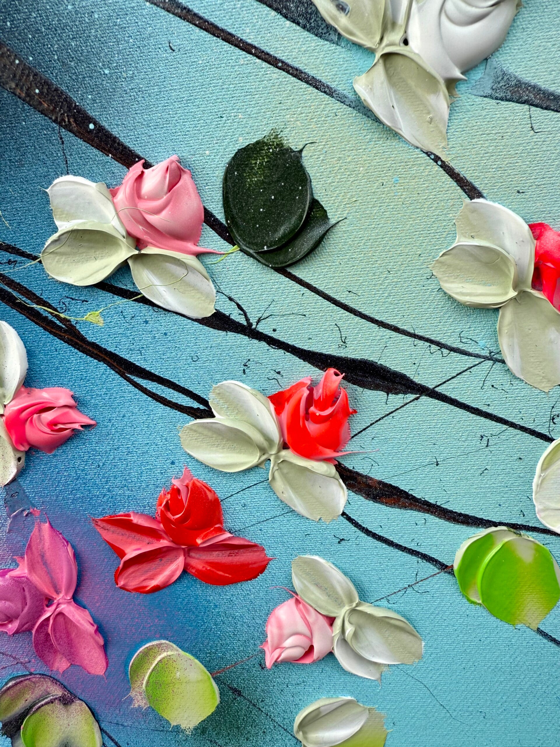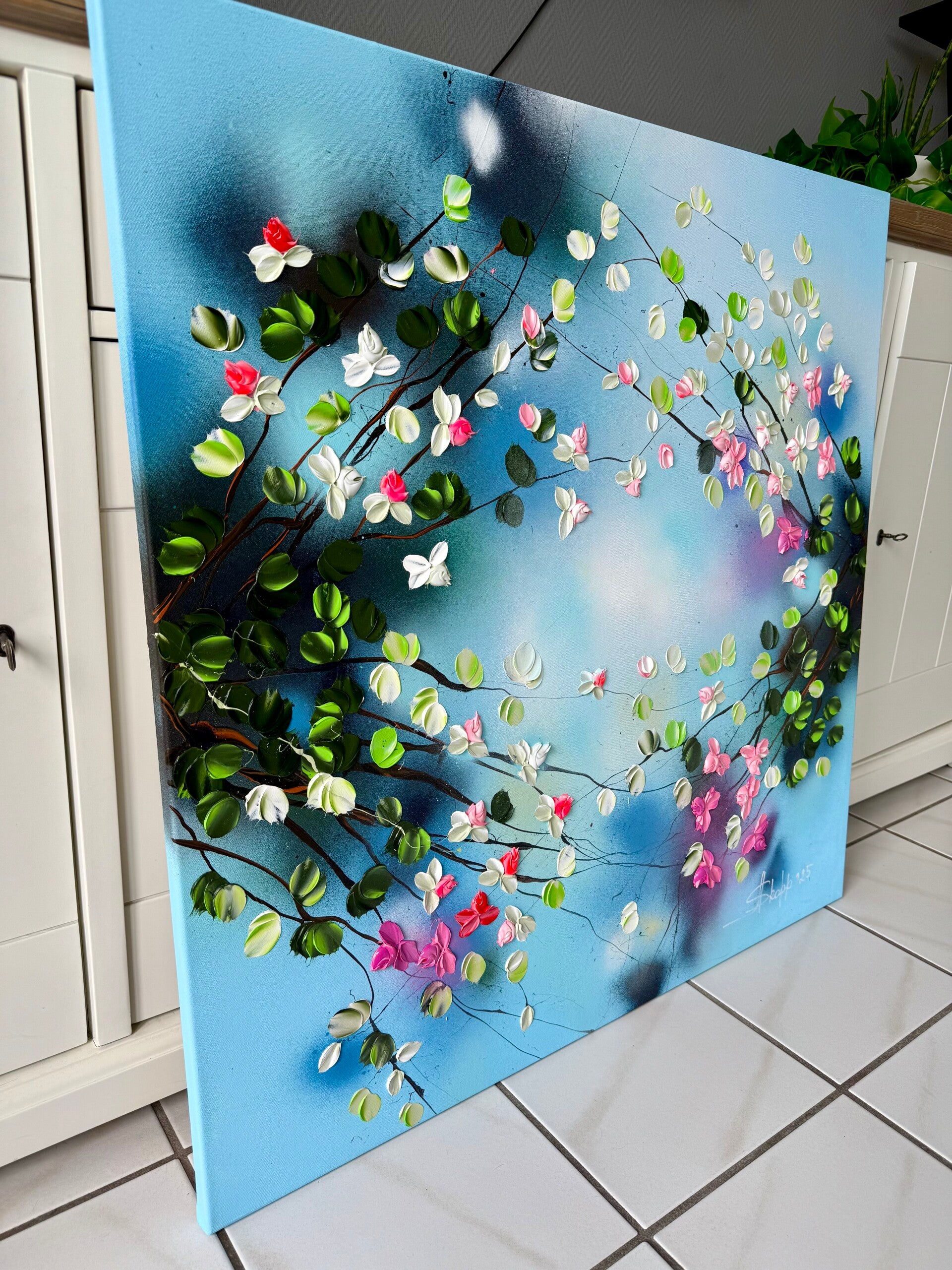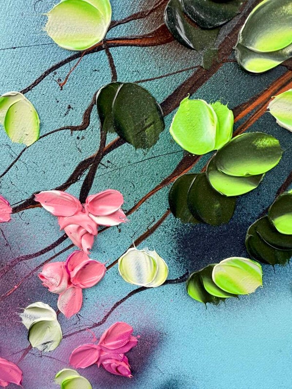 Romantic Moment I features a circular composition of delicate blossoms in shades of white, pink, and red, unfolding against a soft, atmospheric blue background. The leaves, painted in a vibrant spectrum of green tones, create a flowing rhythm that guides the viewer’s gaze across the canvas. The palette knife technique adds sculptural texture and dimensionality to the petals and foliage.