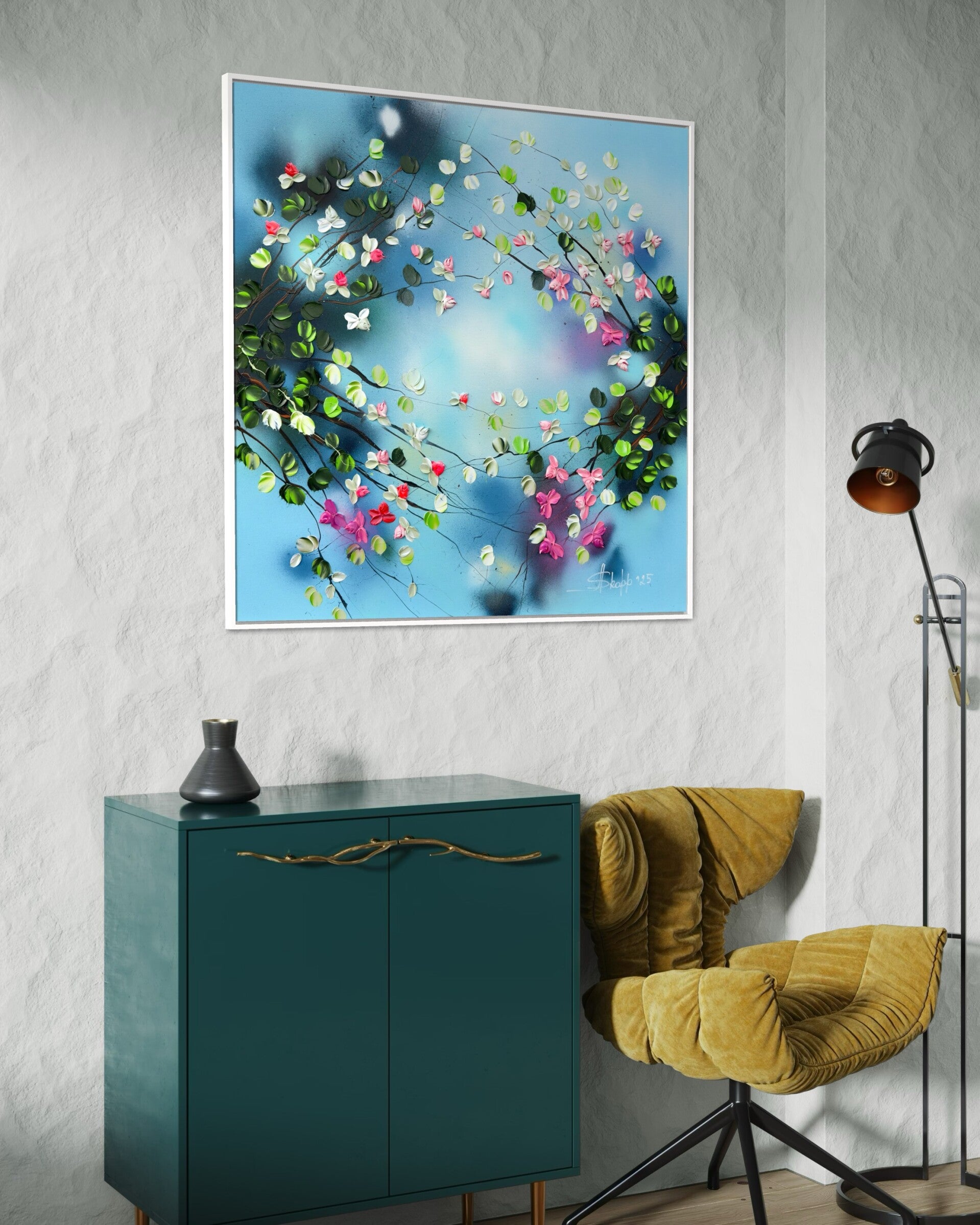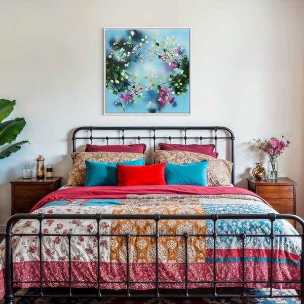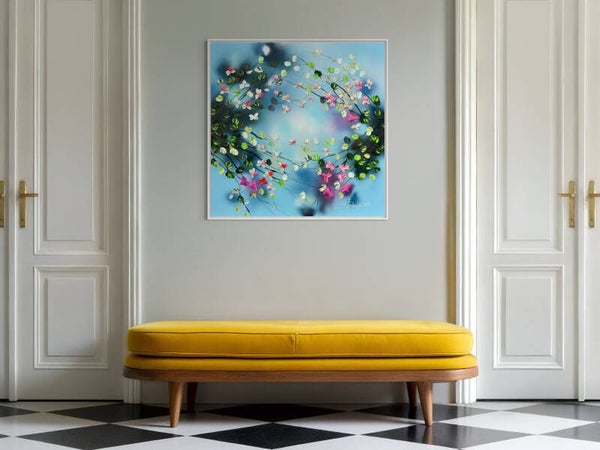 Romantic Moment I -90 × 90 × 2 cm /35,4x35x4x0,8 in, blue pink floral textured art