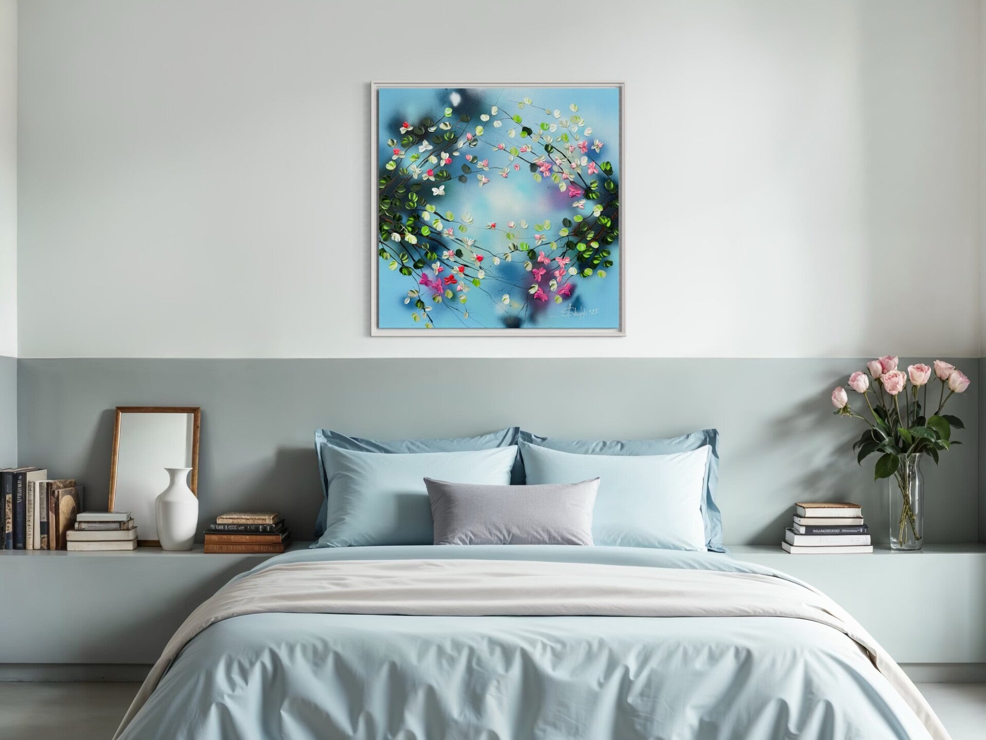 The subtly blended backdrop evokes a sense of serene light and open sky, adding a quiet depth to the piece. The floral elements appear to drift weightlessly, suggesting a fleeting moment in nature – tranquil, tender, and ephemeral.