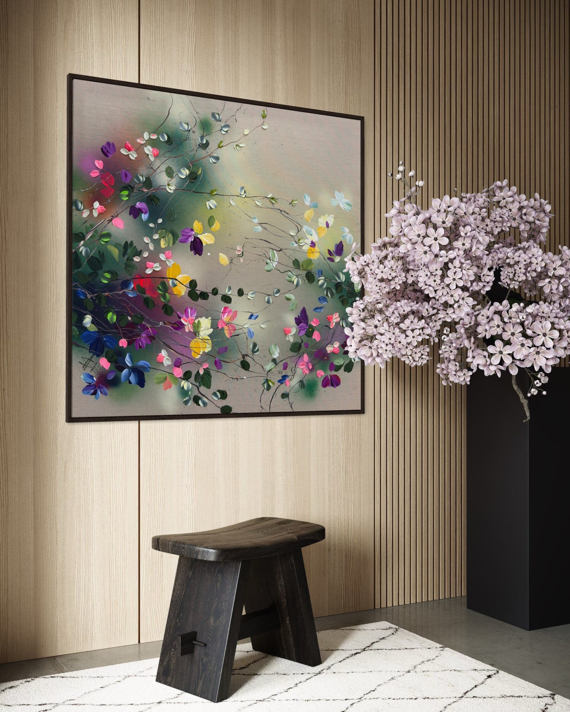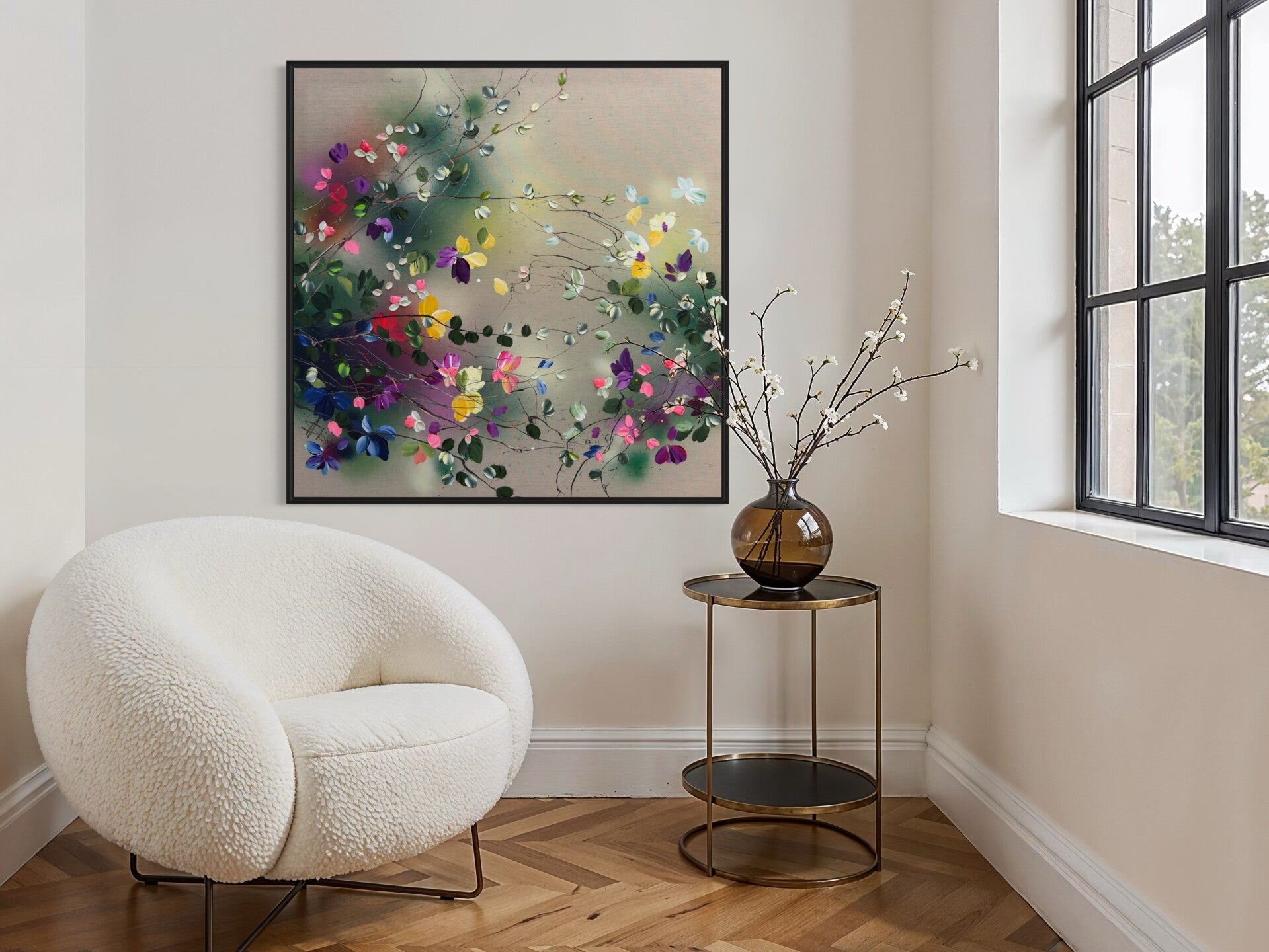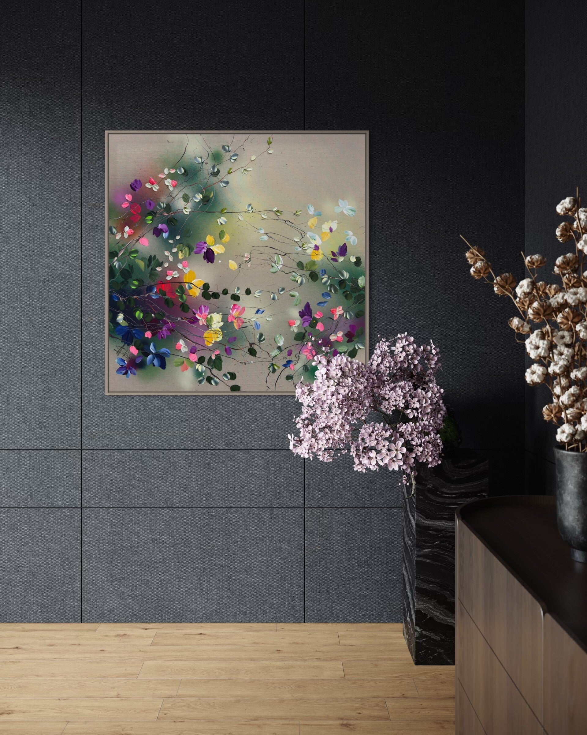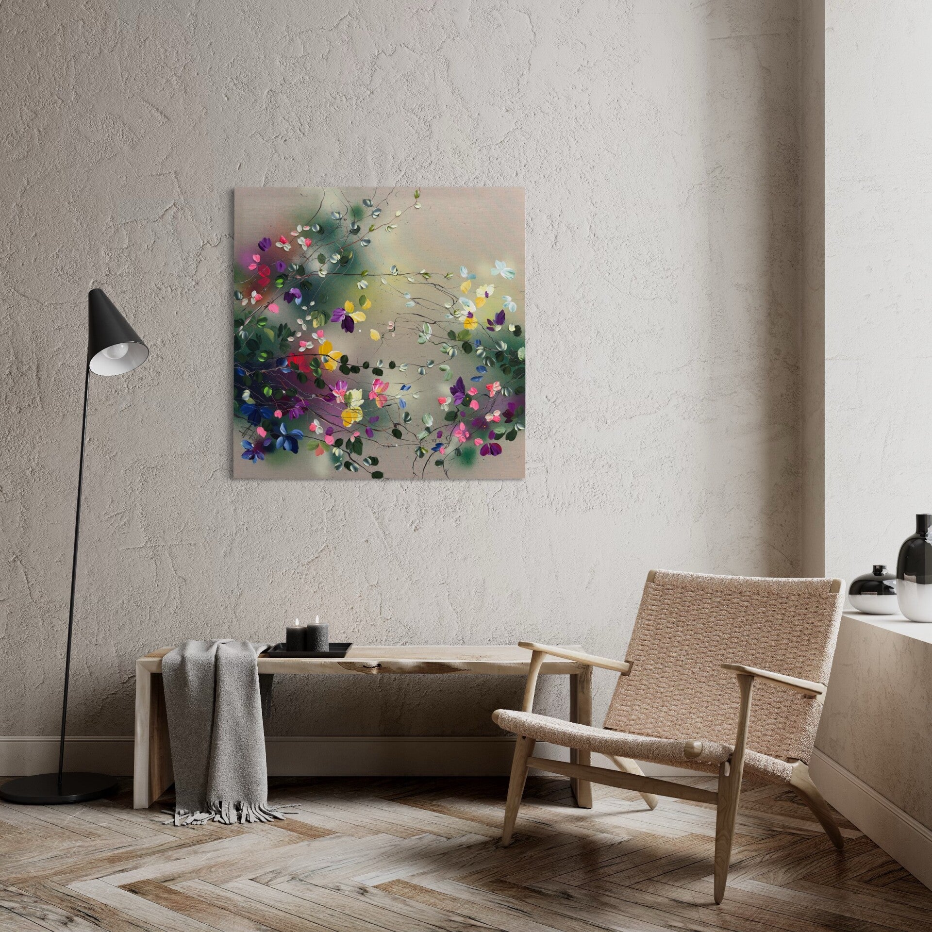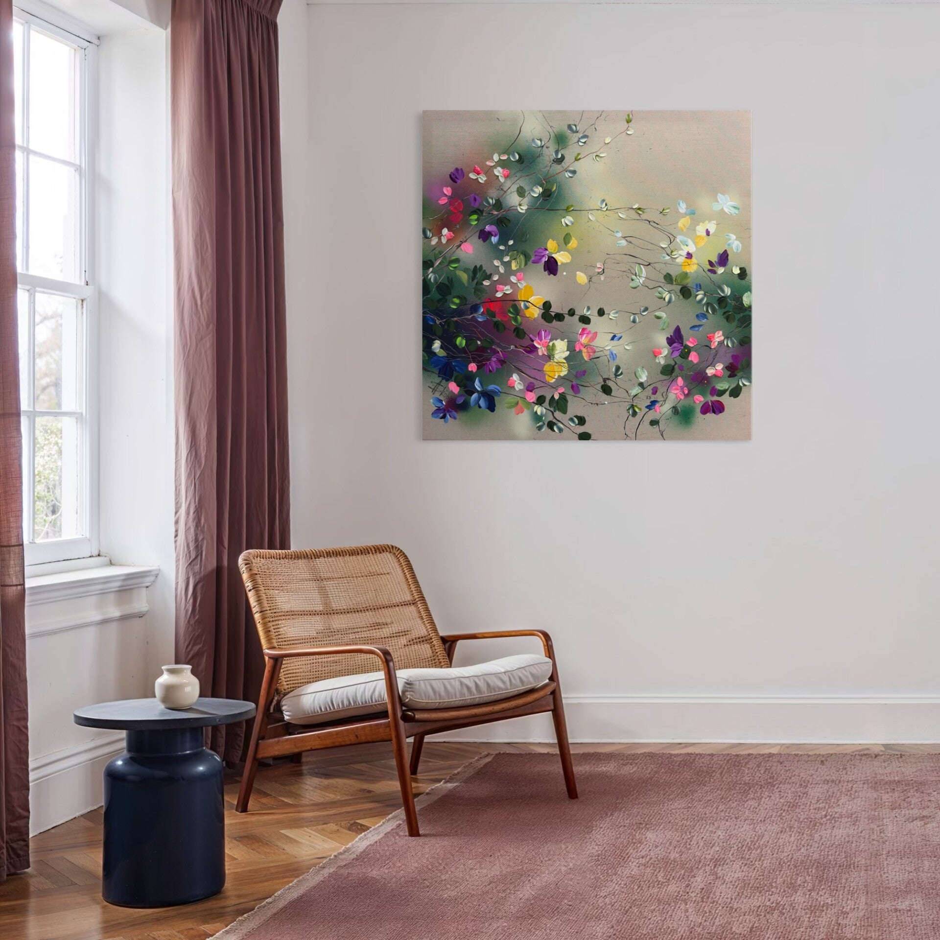 "Ethereal Drift" - 100 x 100 x 4 cm / 39.4 x 39.4 x 1.6 inches, flowers on linen