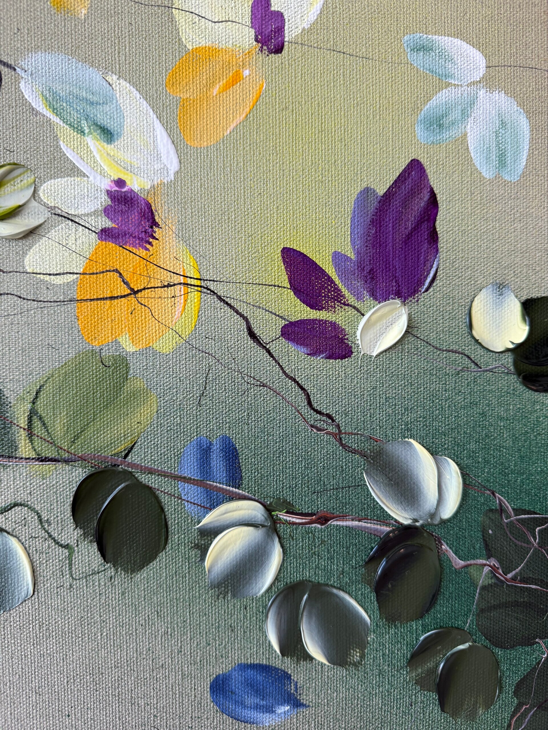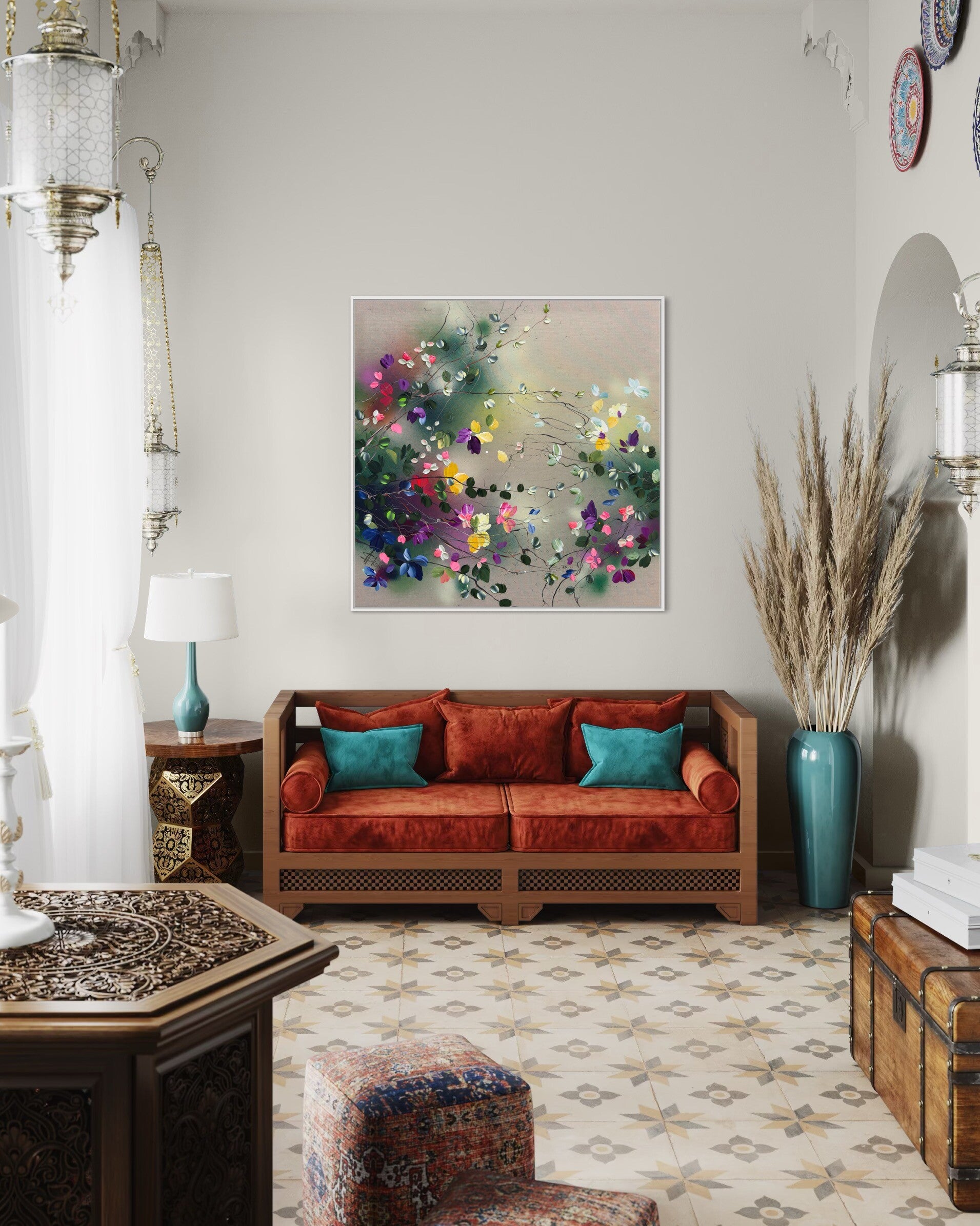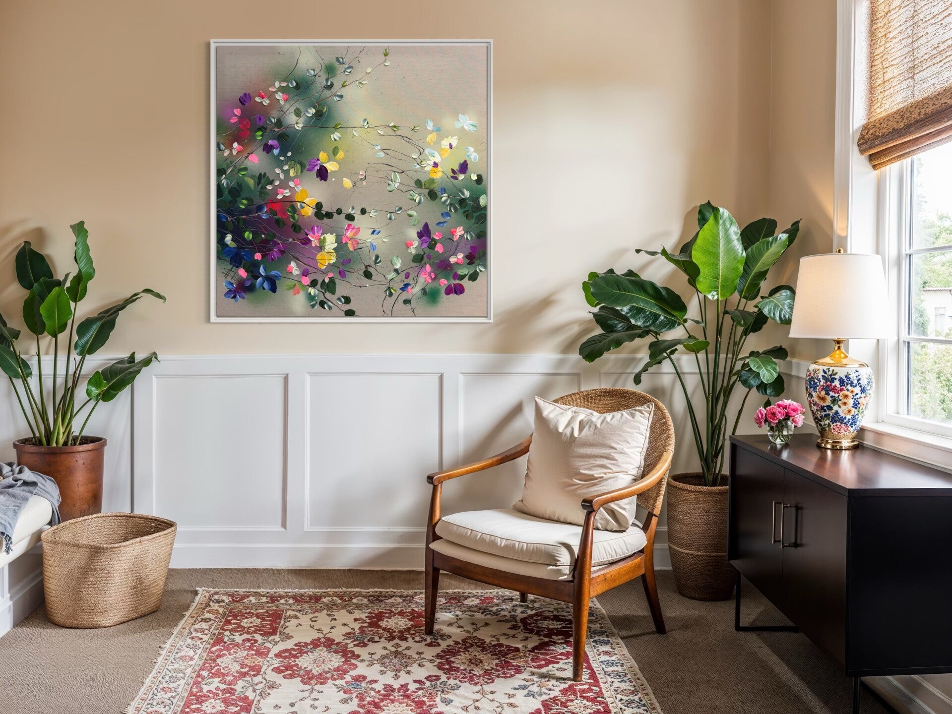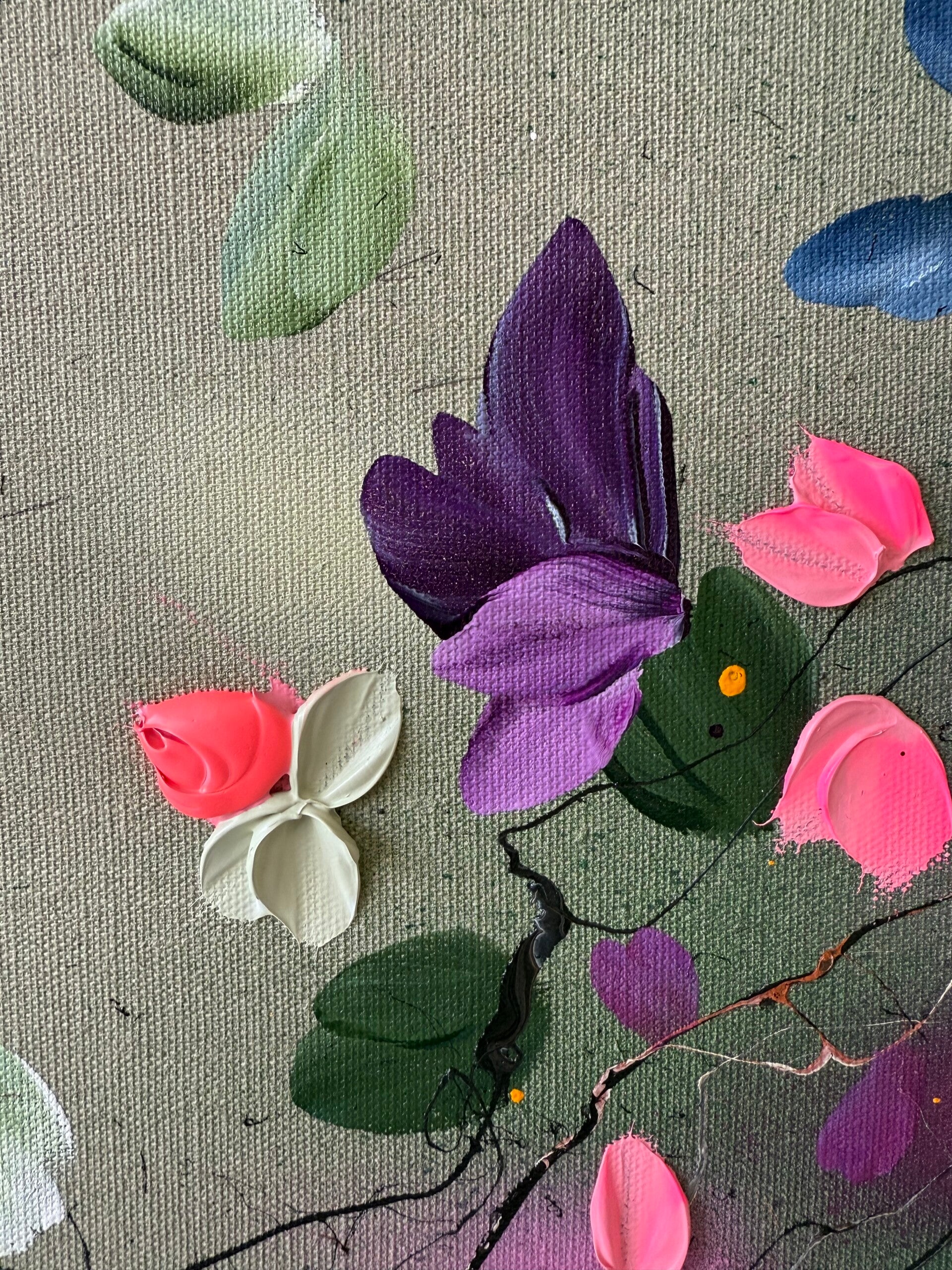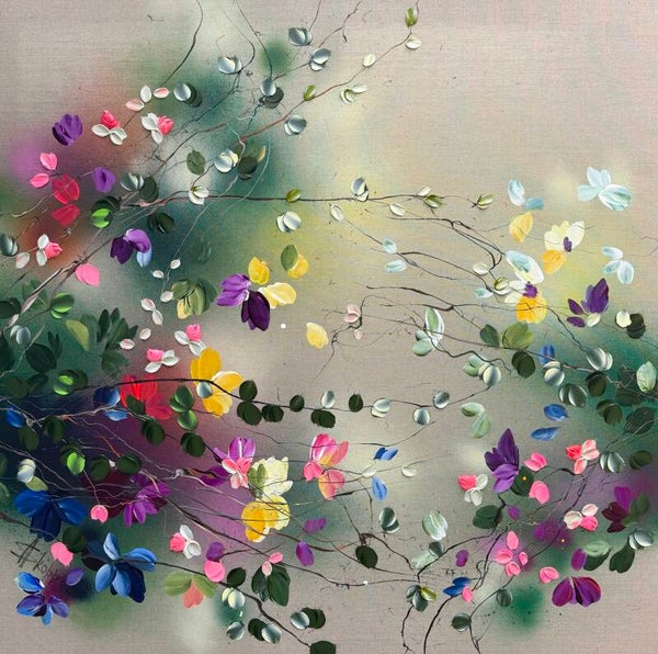 "Ethereal Drift" - 100 x 100 x 4 cm / 39.4 x 39.4 x 1.6 inches, flowers on linen