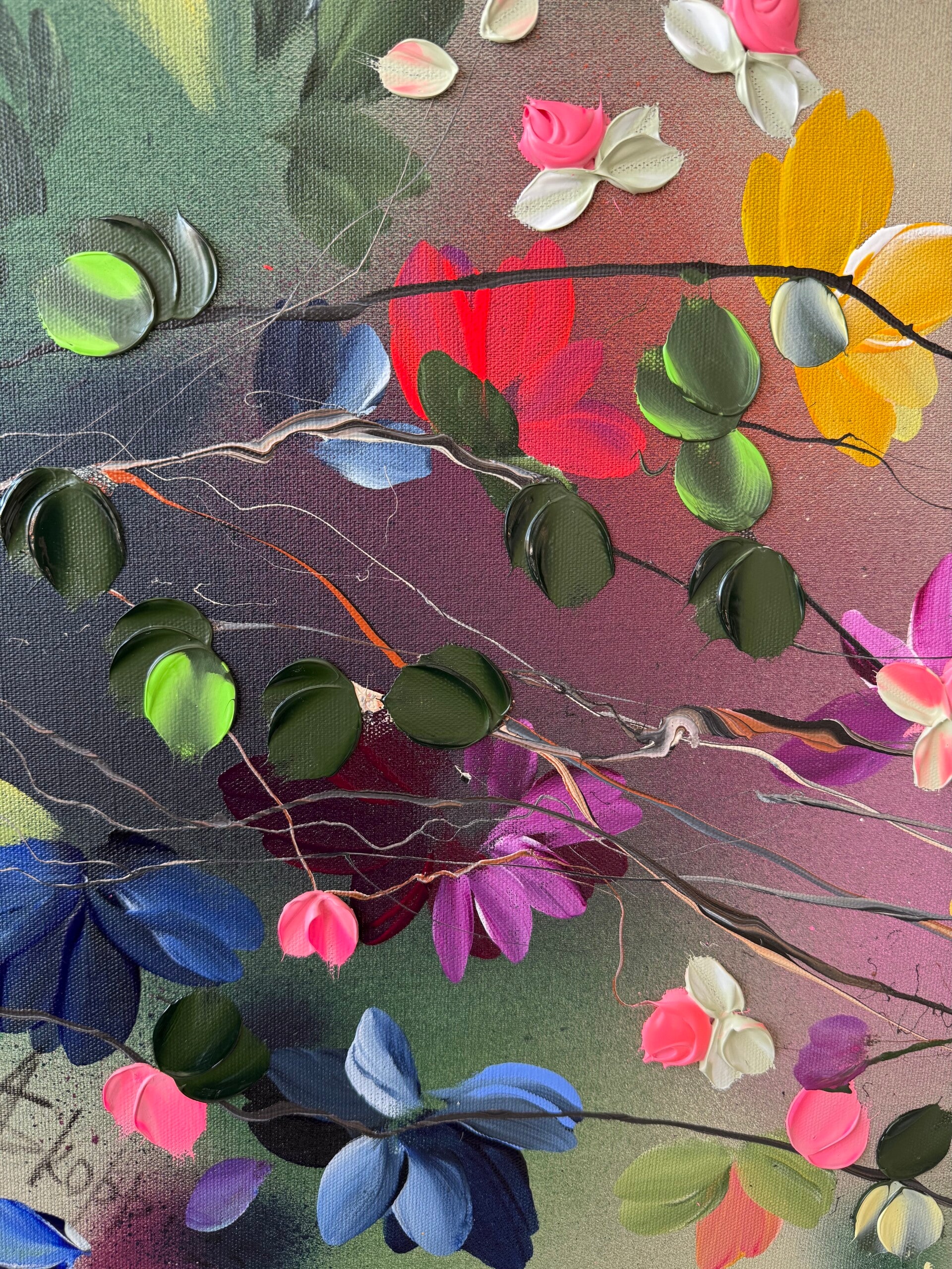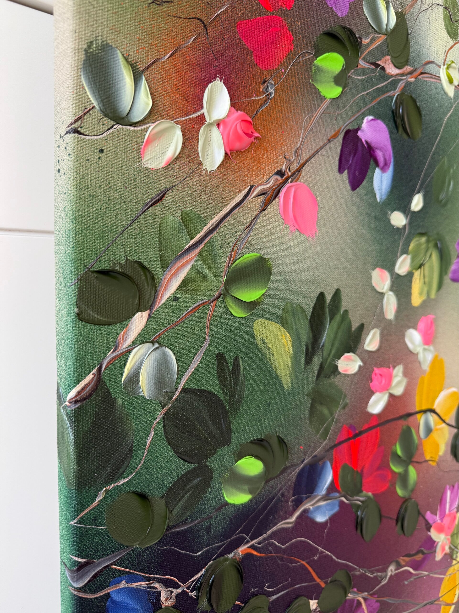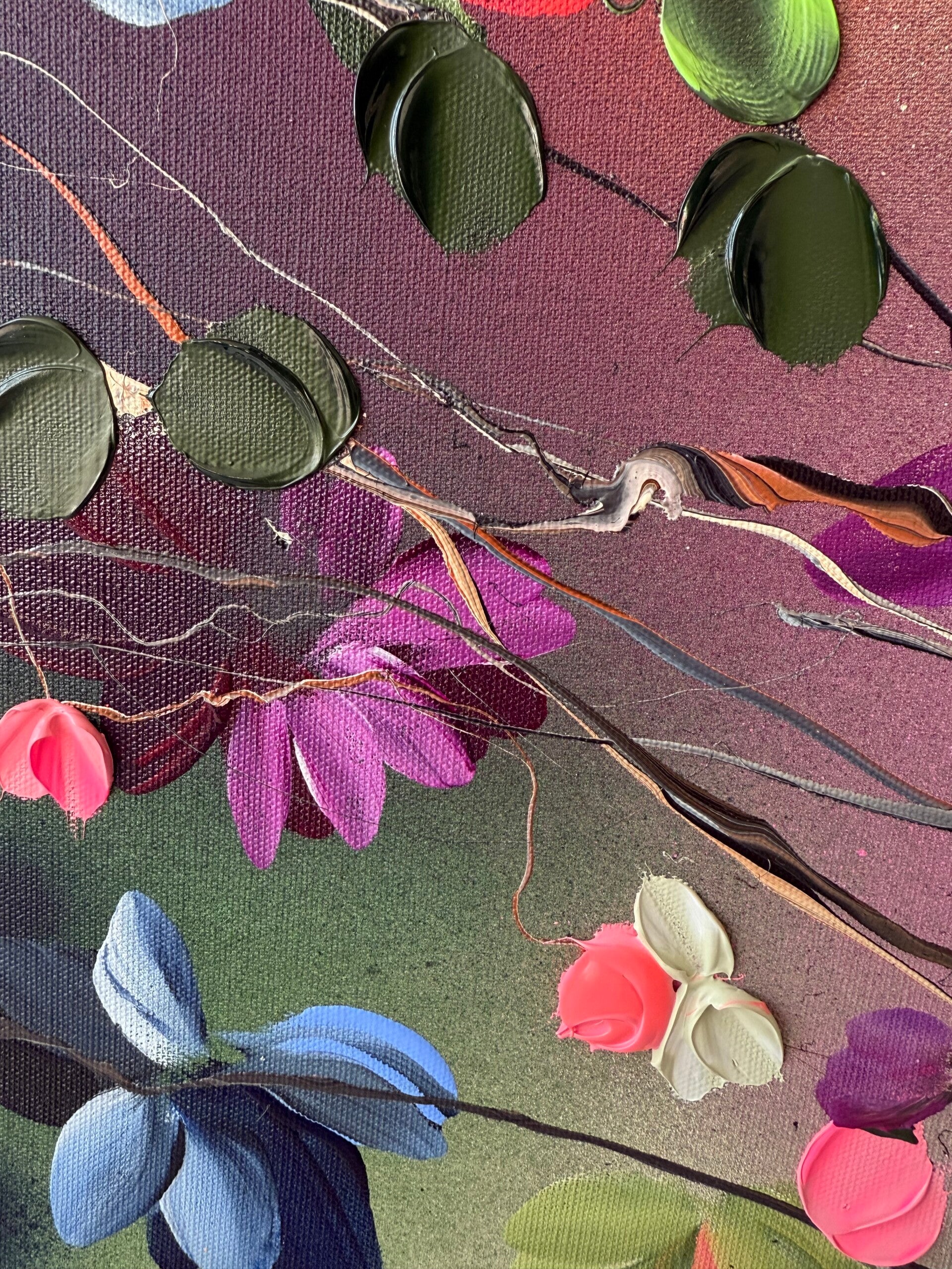 Applied with a palette knife, the petals appear glossy and raised, almost floating above the canvas and catching the light with each shift in perspective.