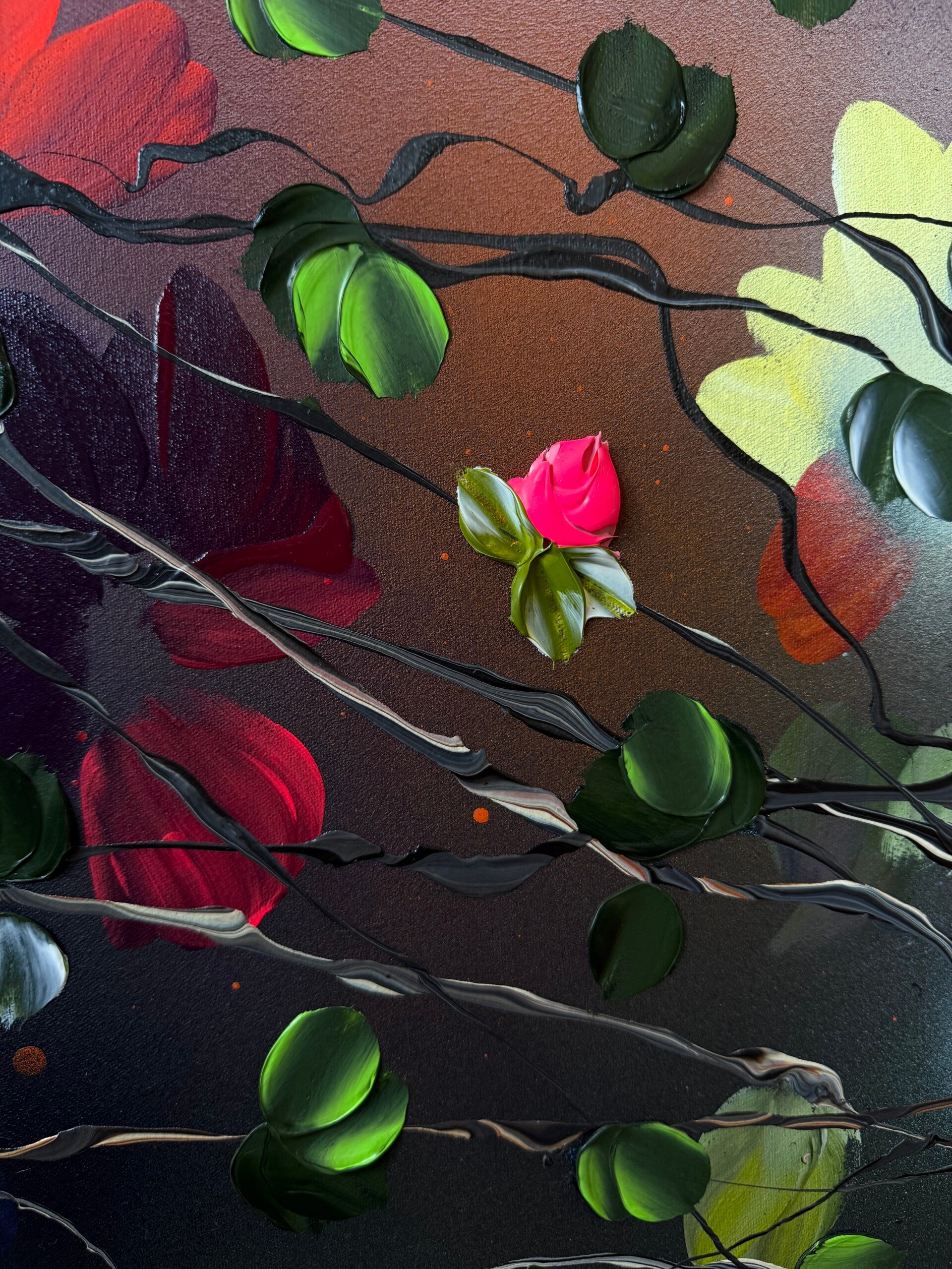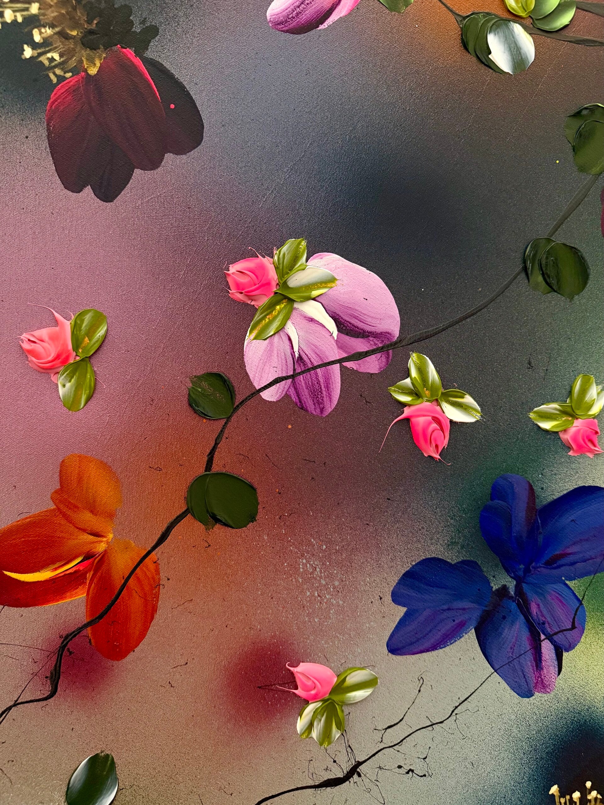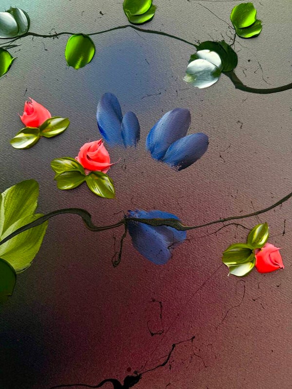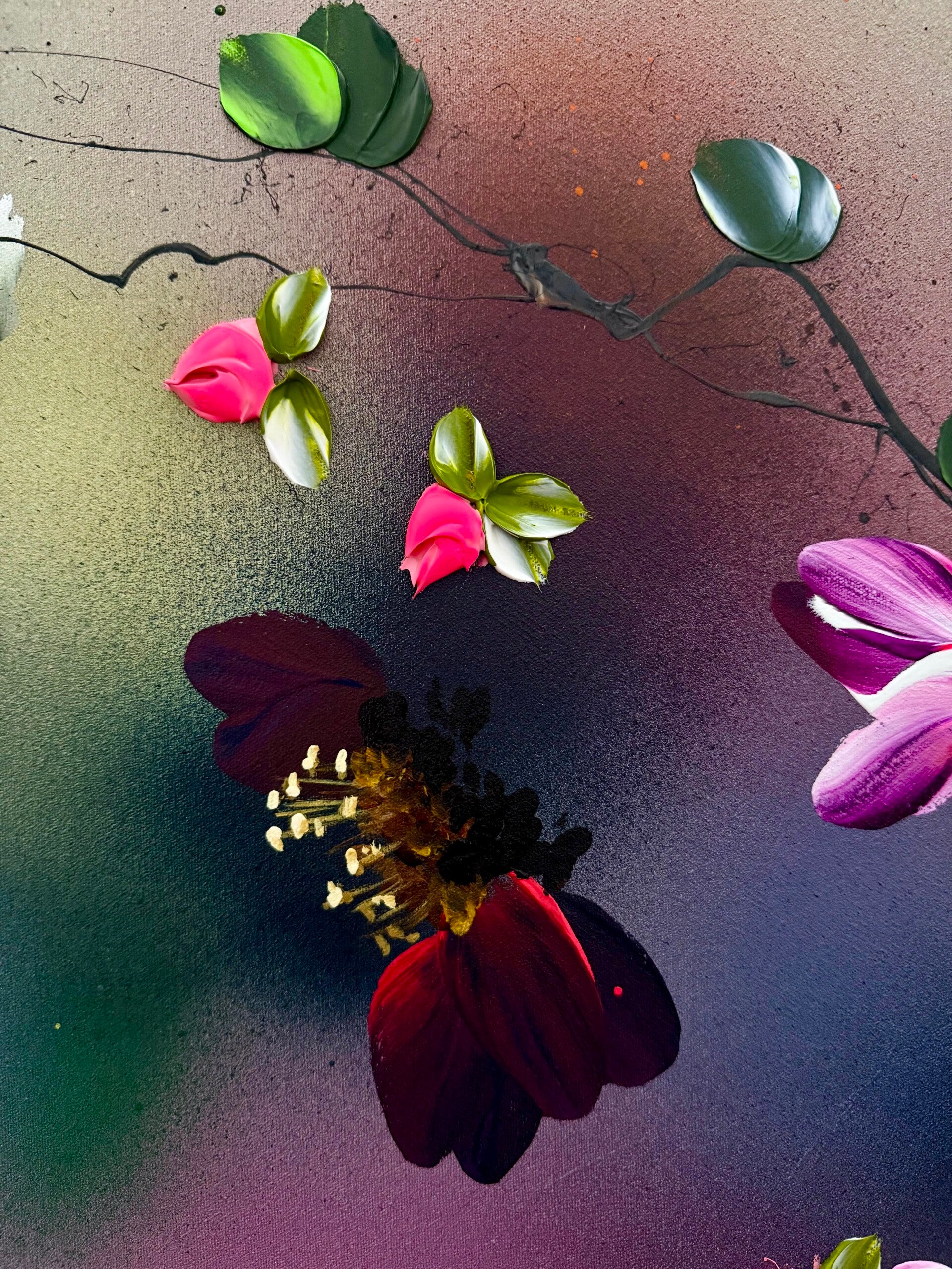 The piece conveys a sense of lightness and freedom, almost like a dance in the wind — a visual translation of openness, harmony, and natural movement. Japanese Air draws on techniques from abstract painting as well as modern floral abstraction. Layer by layer, using undiluted acrylics, inks, and texture pastes, the surface builds into a complex structure that radiates both depth and dynamism.