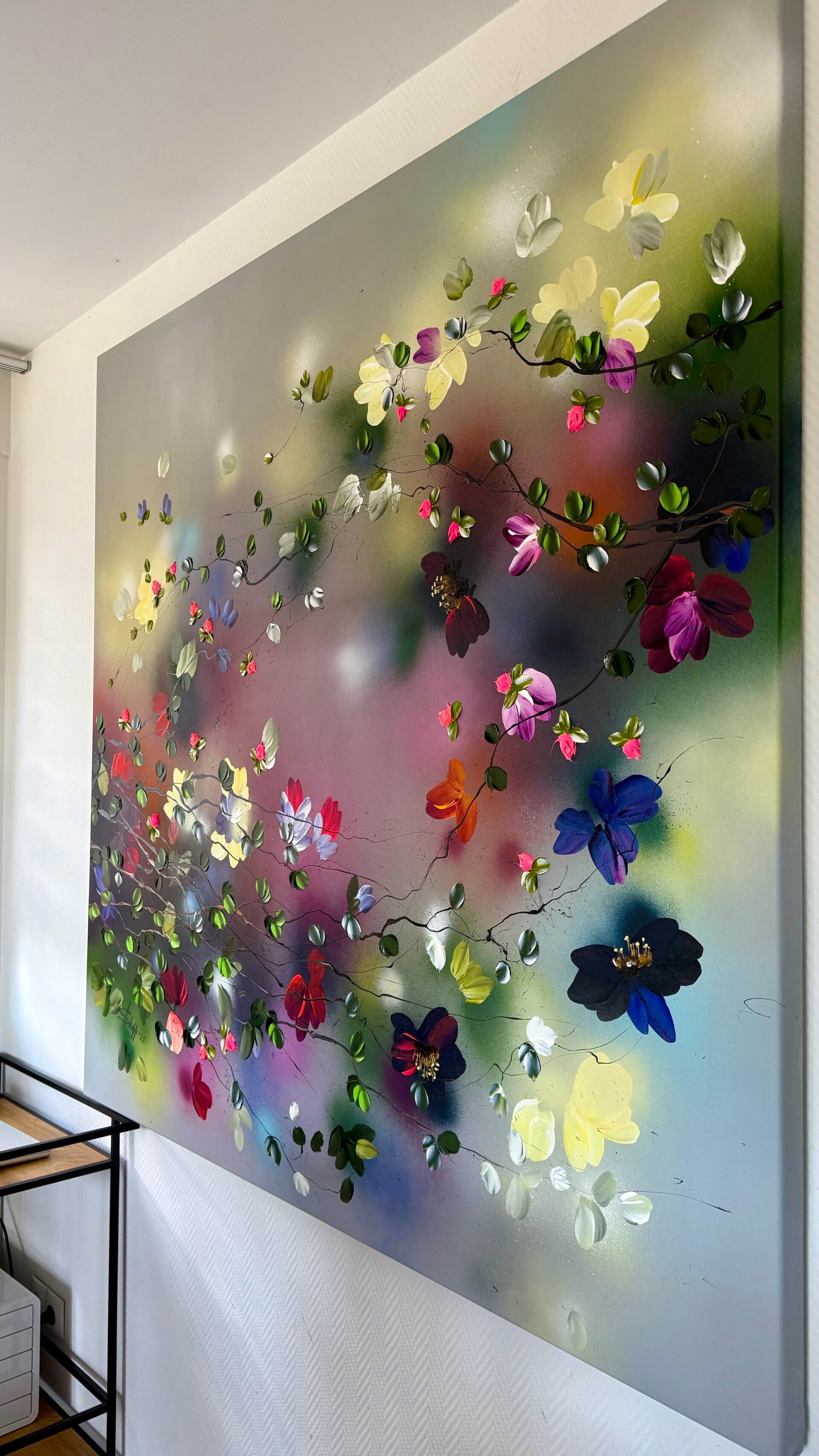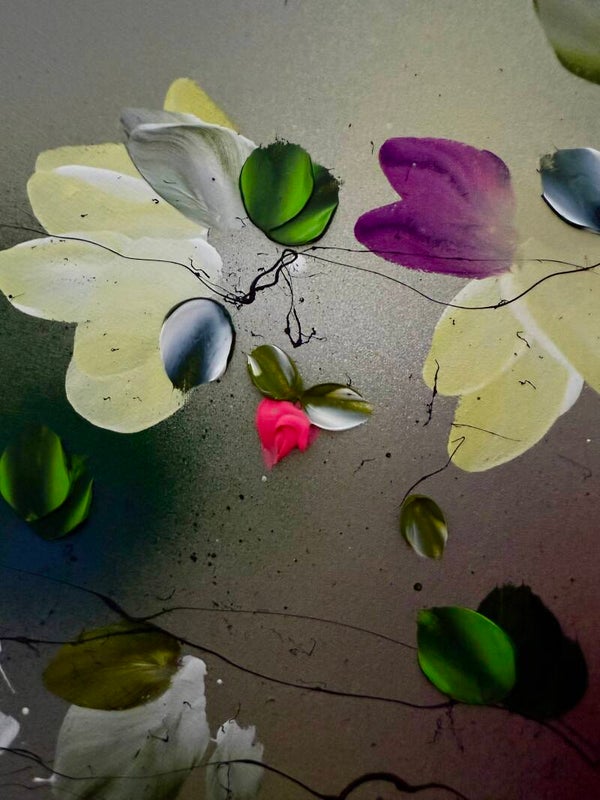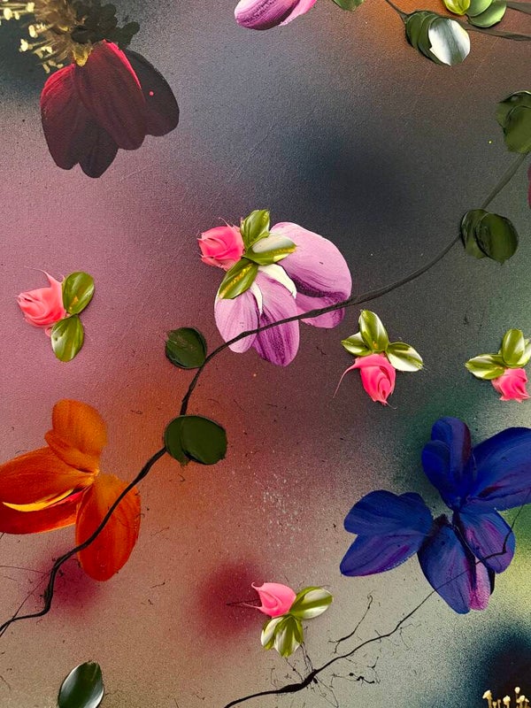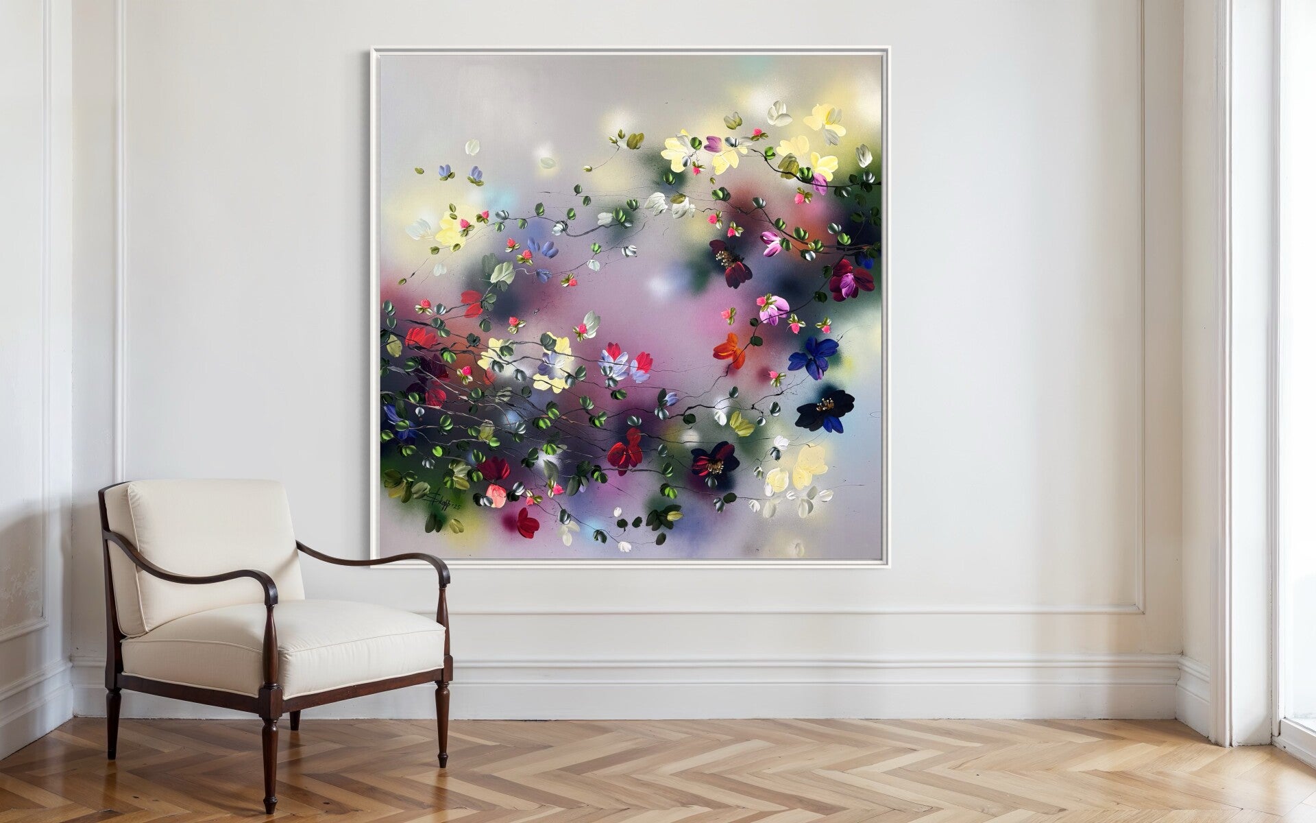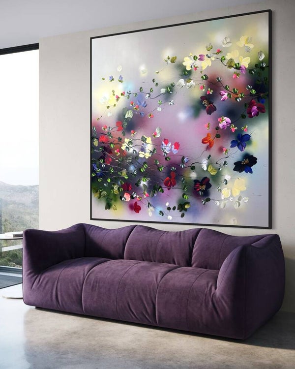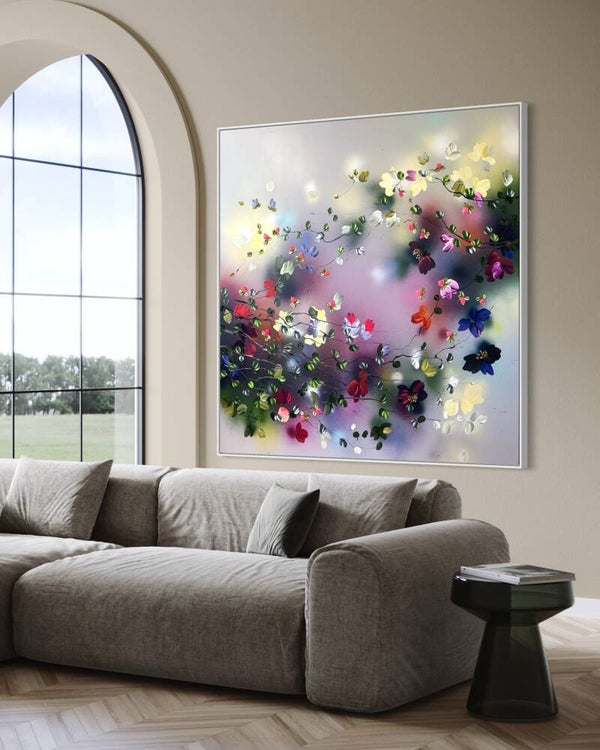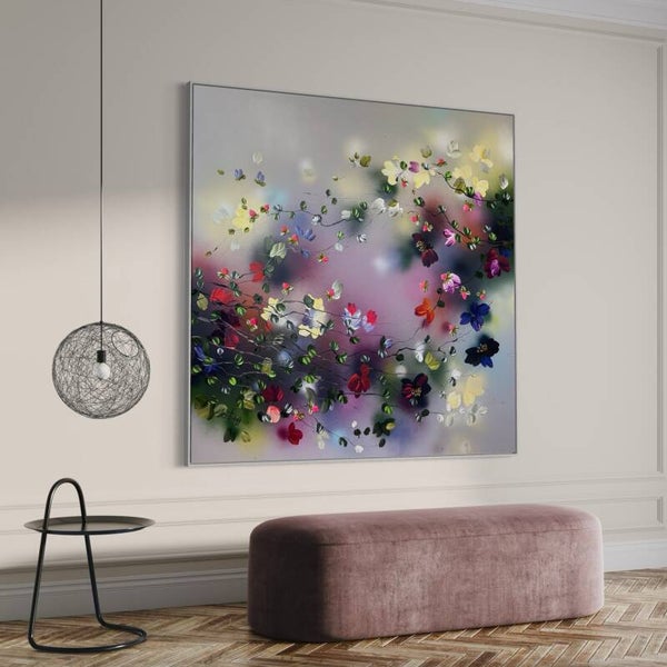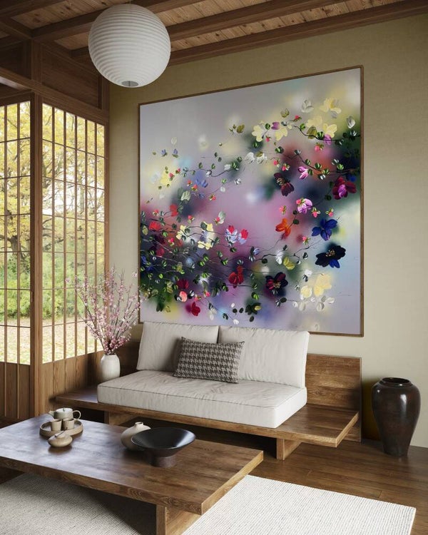 Japanese Air captures lightness and movement in a vivid interplay of color and form. Painted on cotton canvas (155x155 cm / 61x61 in, on stretcher 145x145 cm / 57x57 in), the work contrasts soft, flowing background tones with textured blossoms created using a palette knife.