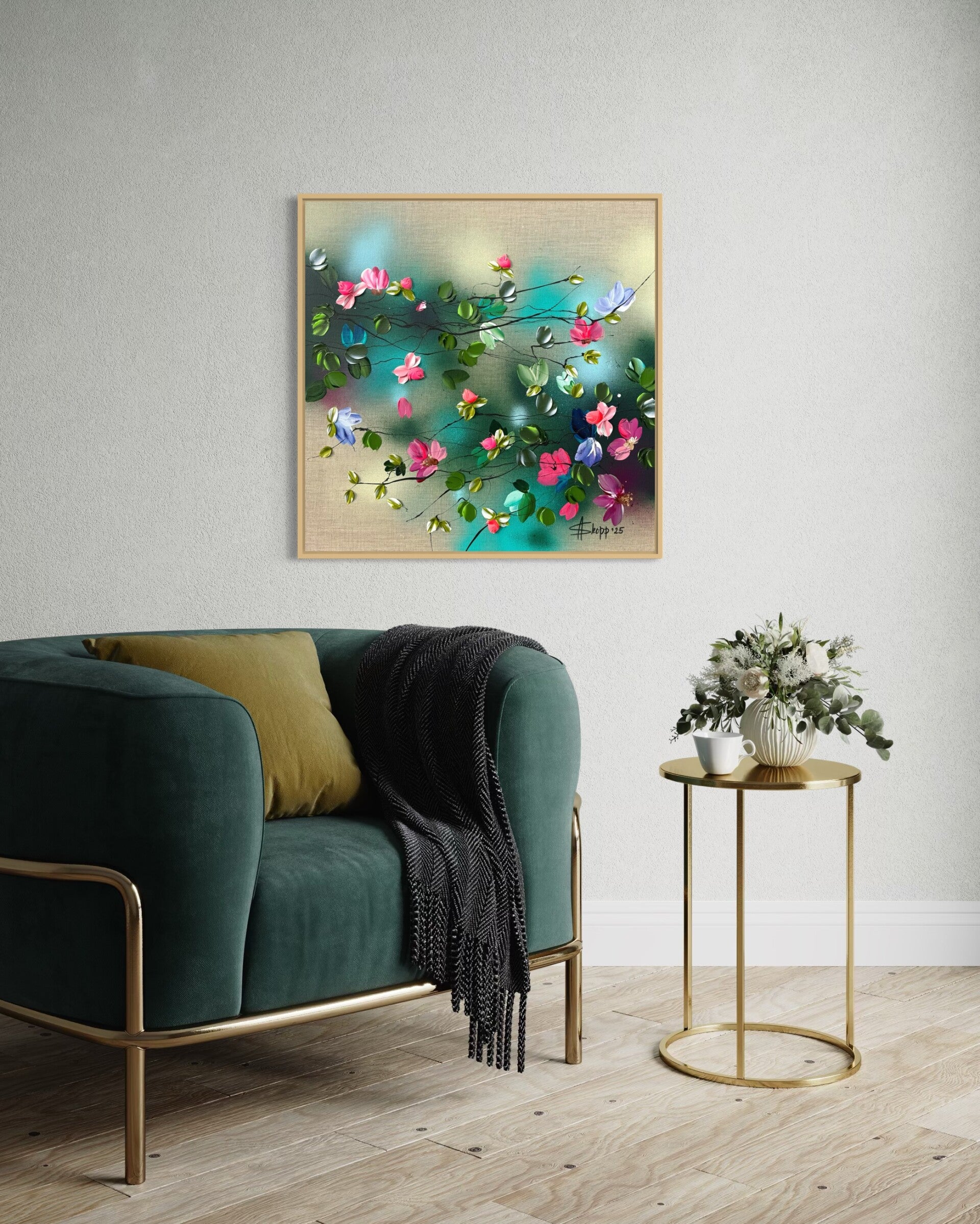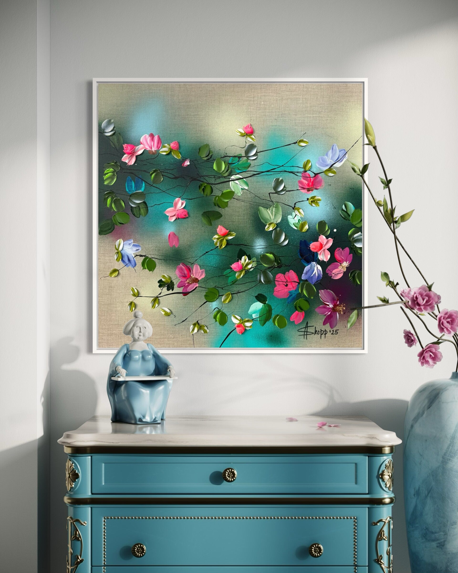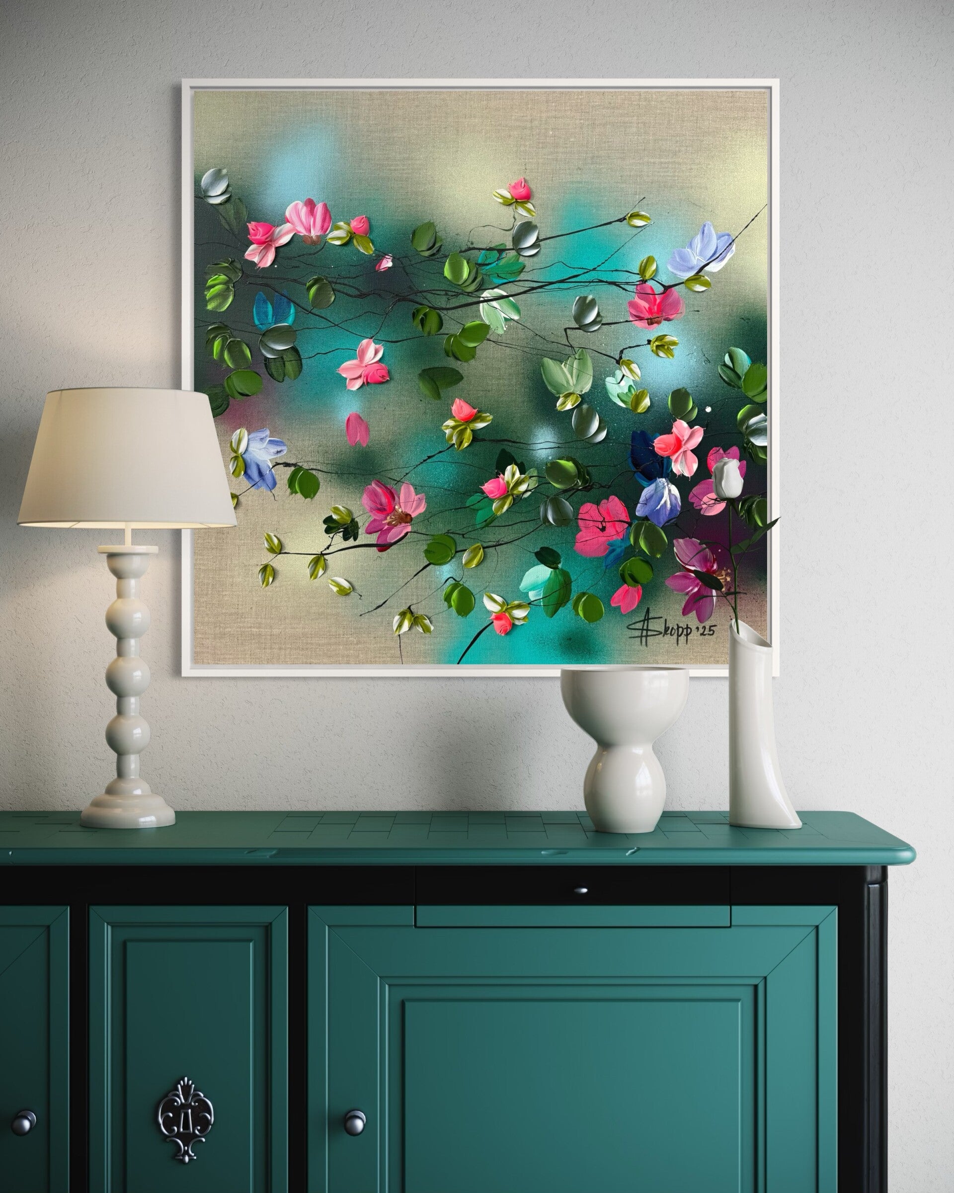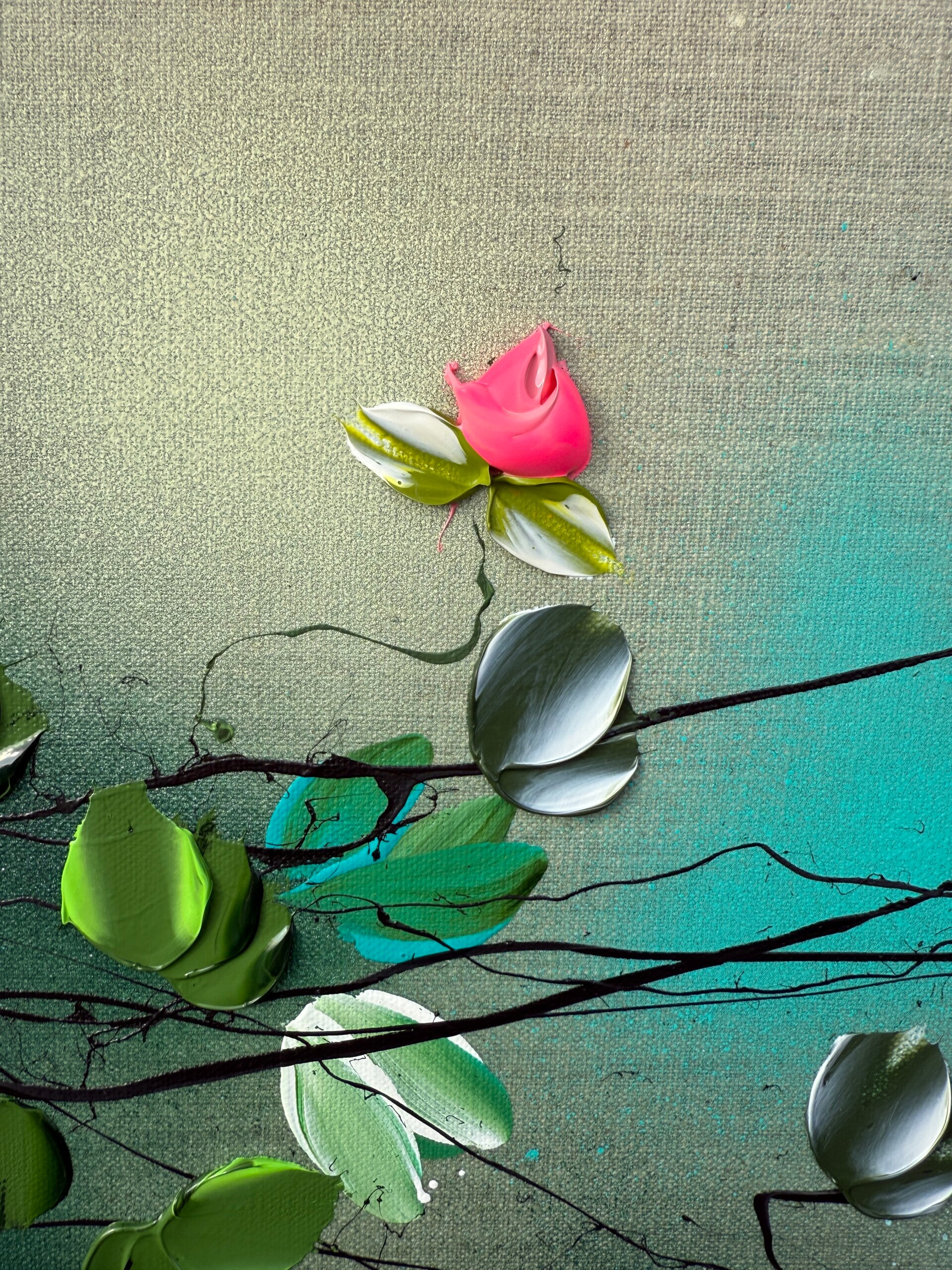 In Flower Talk I, delicate blossoms unfold across a neutral linen canvas, painted with a palette knife in vivid hues of pink, violet, and soft blue, interwoven with fresh greens. The textured petals create a lively rhythm, while the natural linen ground adds warmth and balance. The work carries both lightness and energy, evoking a moment of quiet bloom.