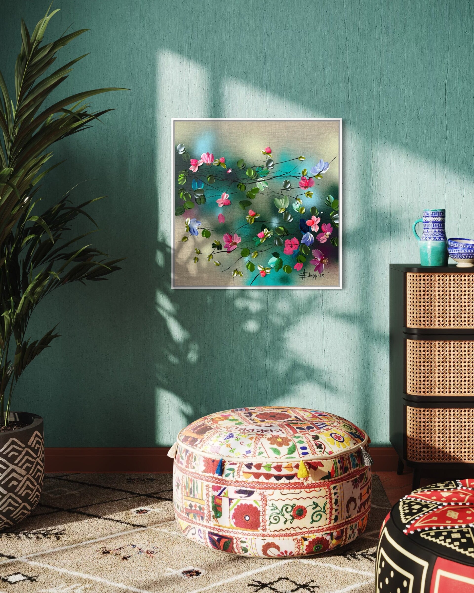 Flower Talk I - colorful 3d painting on linen, 60 × 60 × 2 cm (23.6 × 23.6 × 0.8 in)
