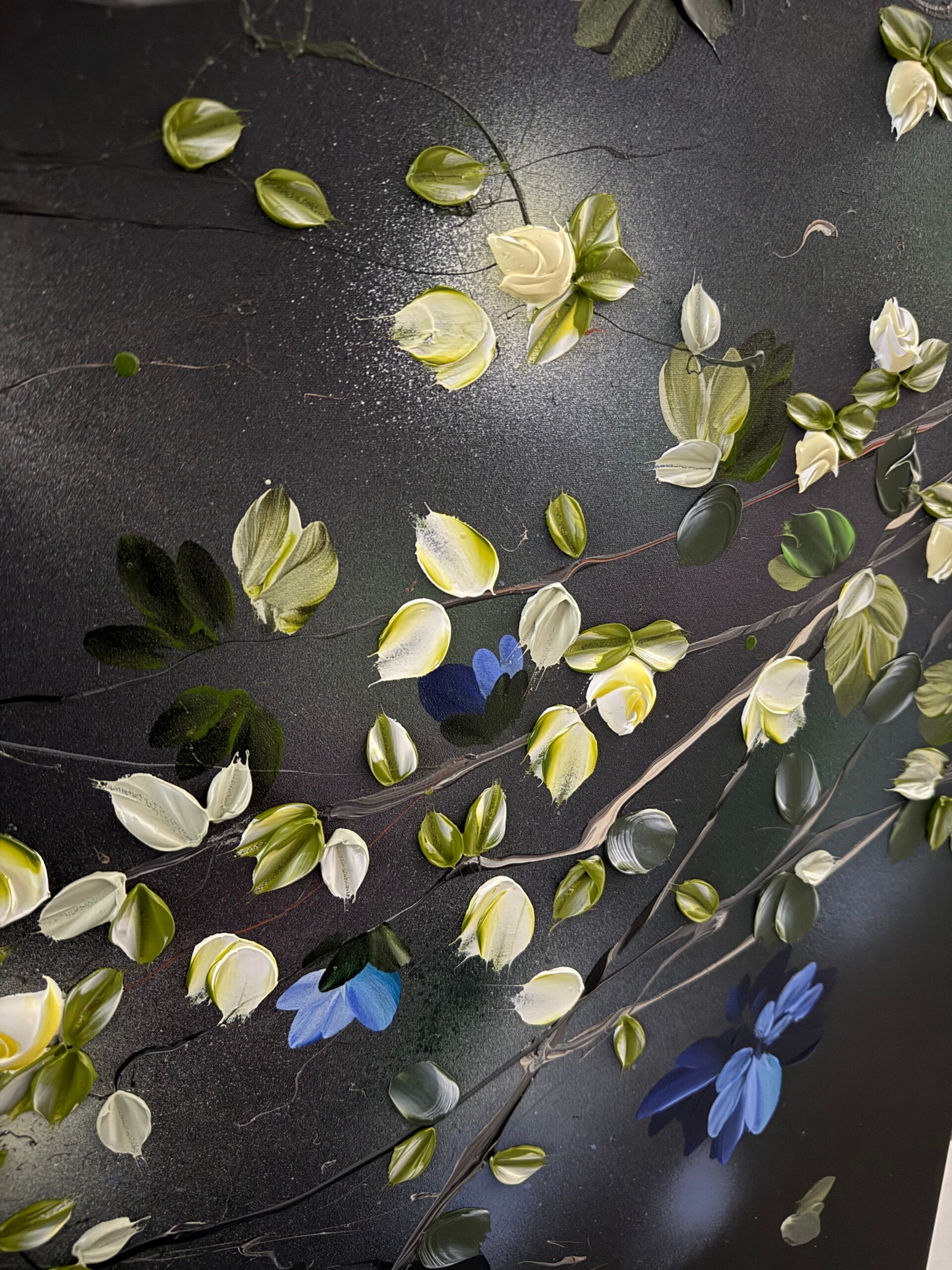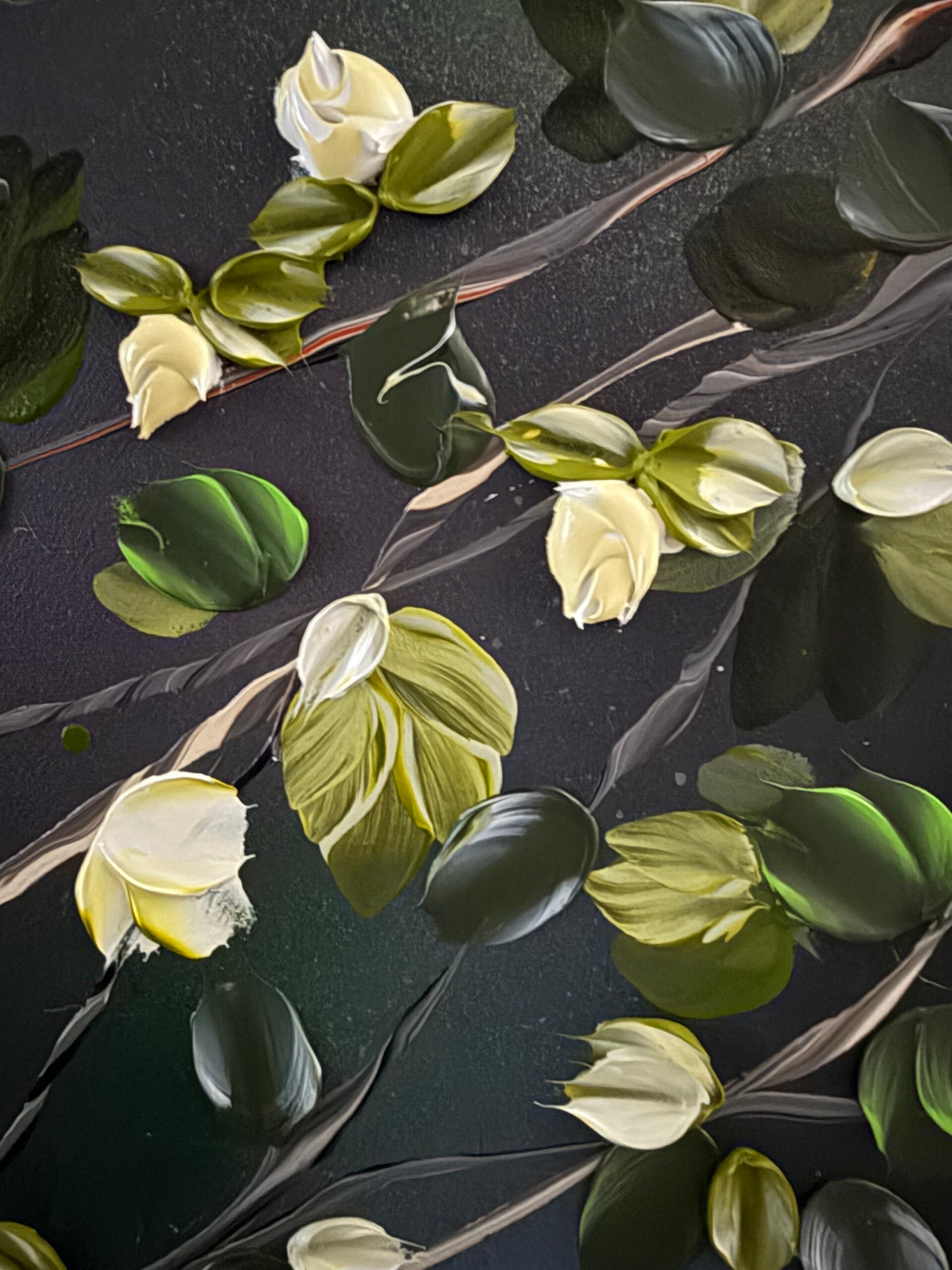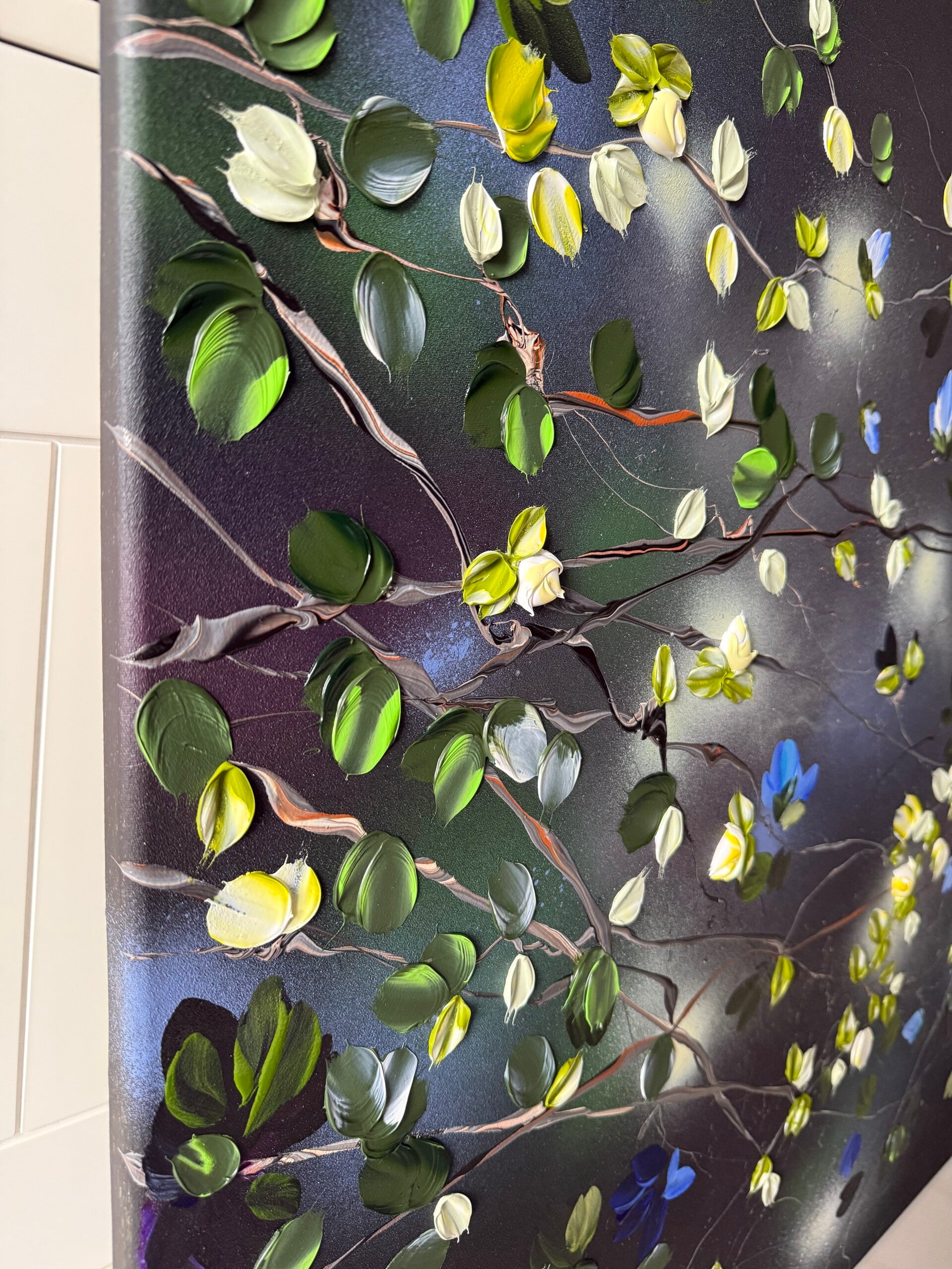 The blossoms, created with a palette knife, reveal sculptural textures that catch light and shadow, while the subtle glimmers in the background suggest the gentle glow of night. This interplay of depth and movement lends the composition both serenity and vibrancy — a dialogue between stillness and unfolding life.