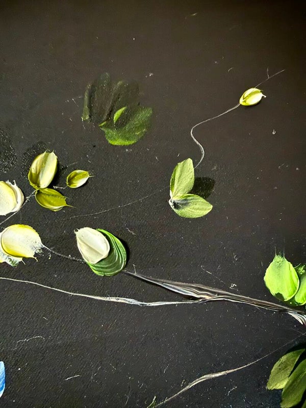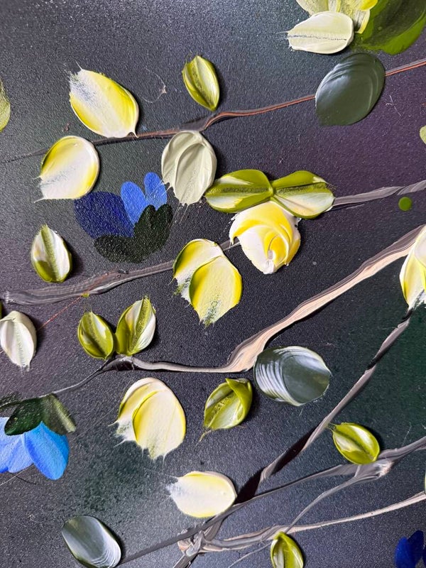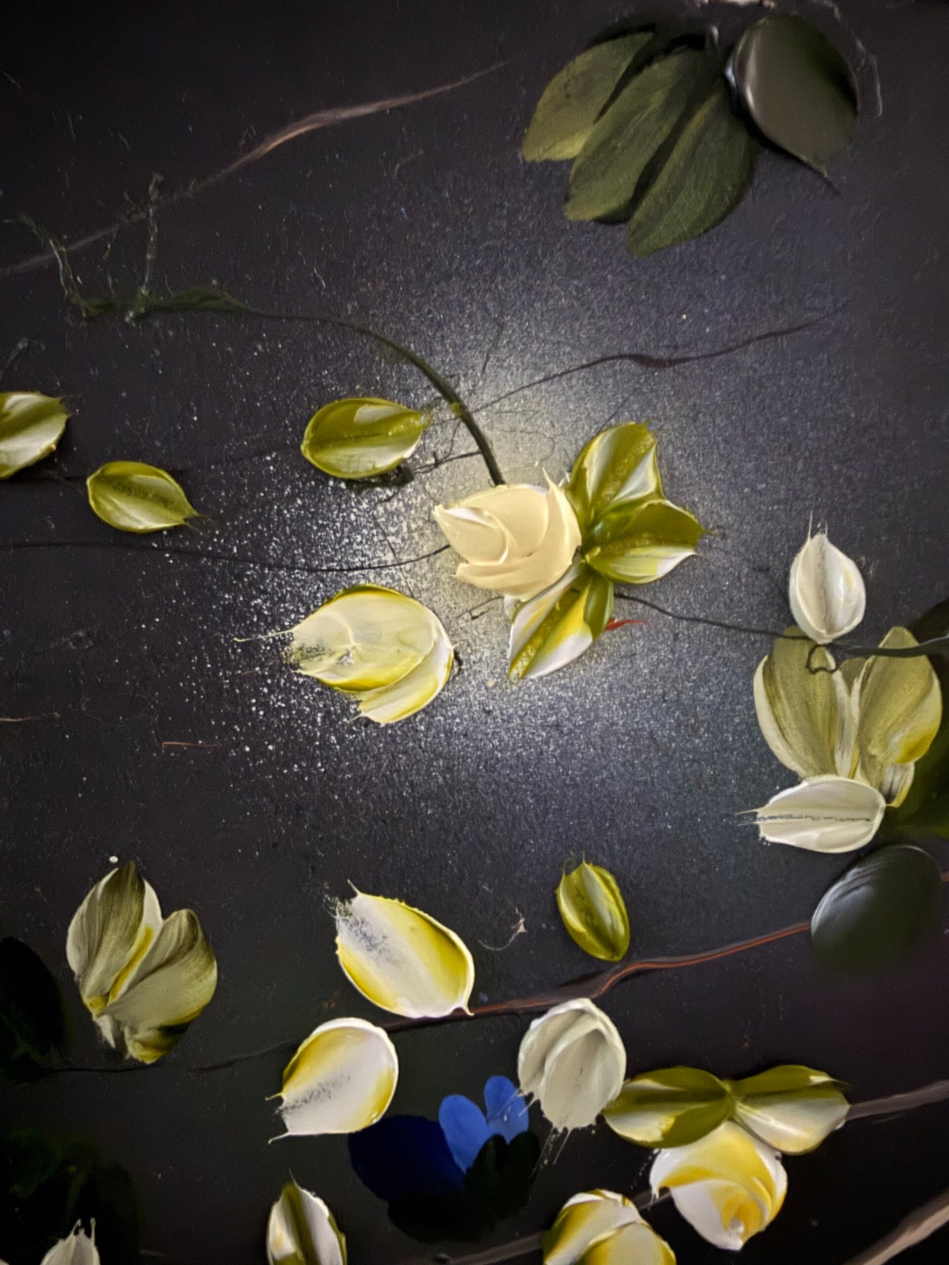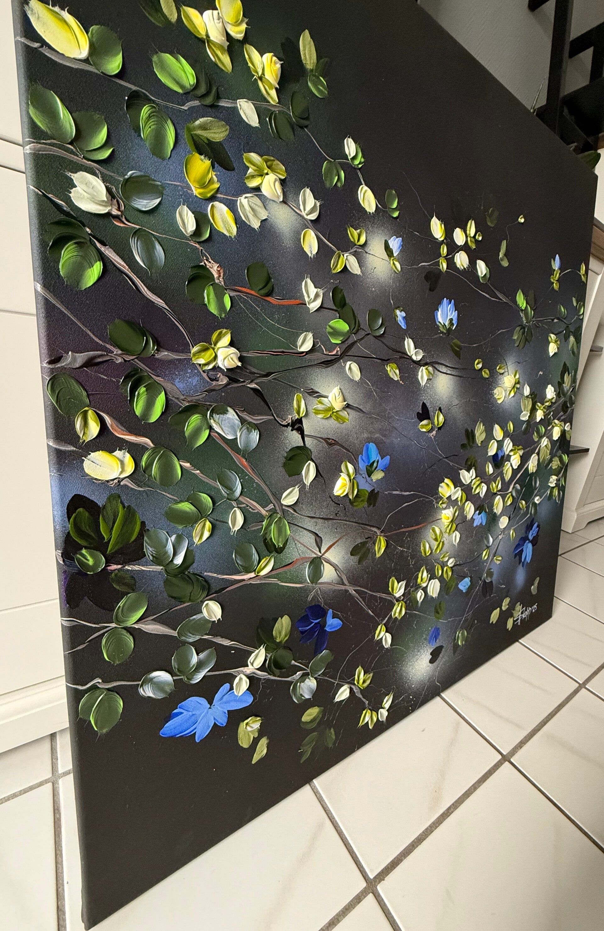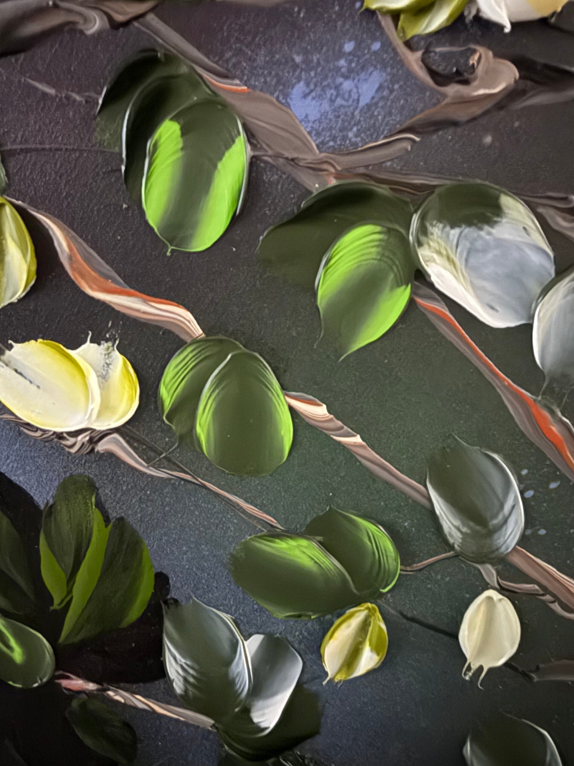 The blossoms, created with a palette knife, reveal sculptural textures that catch light and shadow, while the subtle glimmers in the background suggest the gentle glow of night. This interplay of depth and movement lends the composition both serenity and vibrancy — a dialogue between stillness and unfolding life.