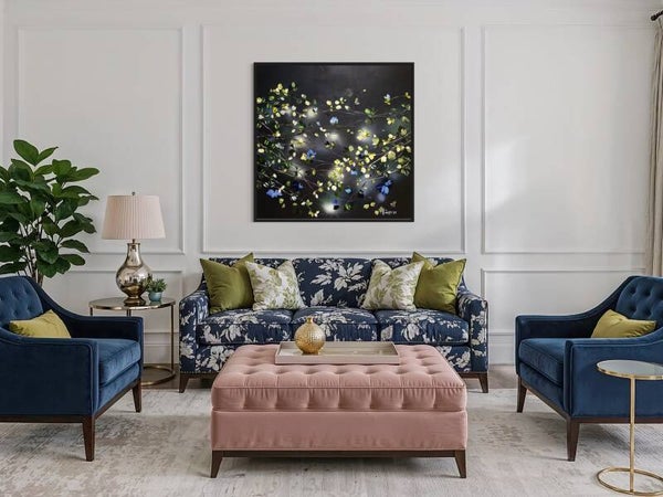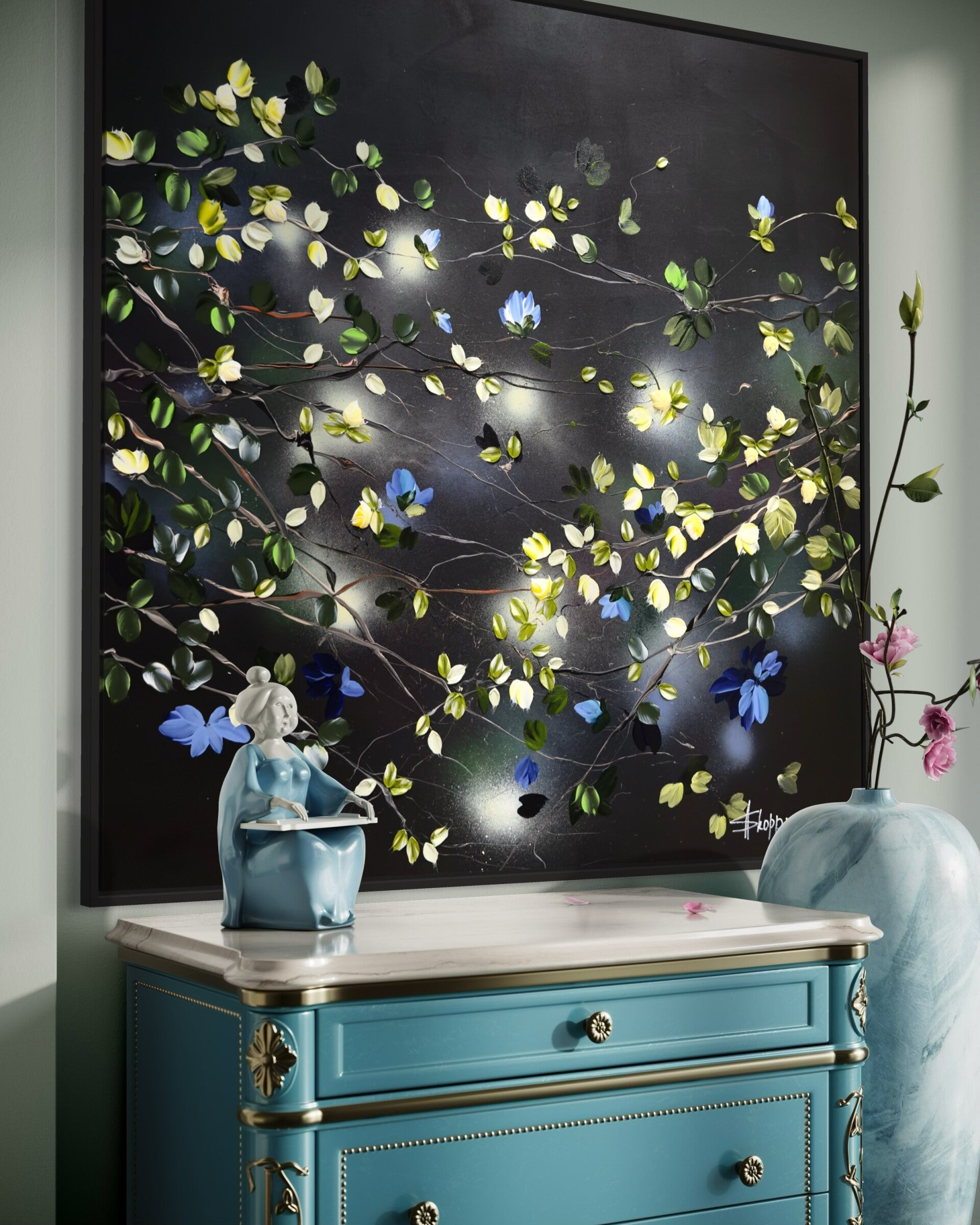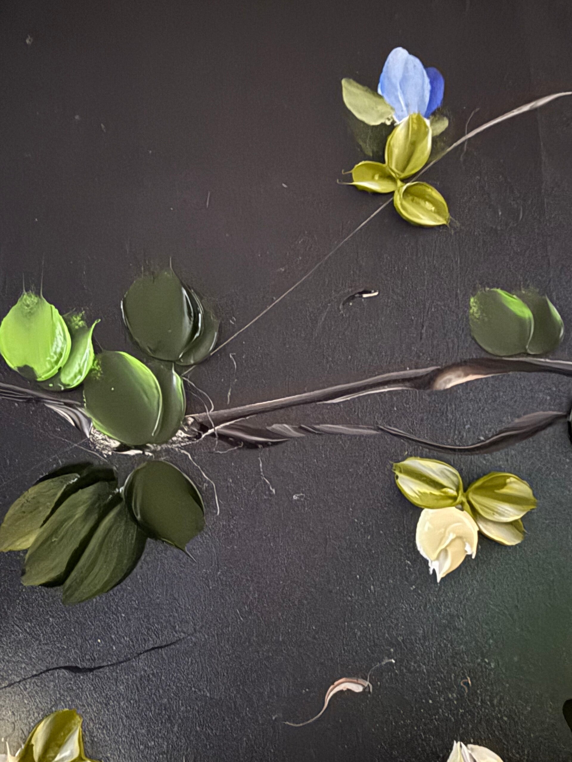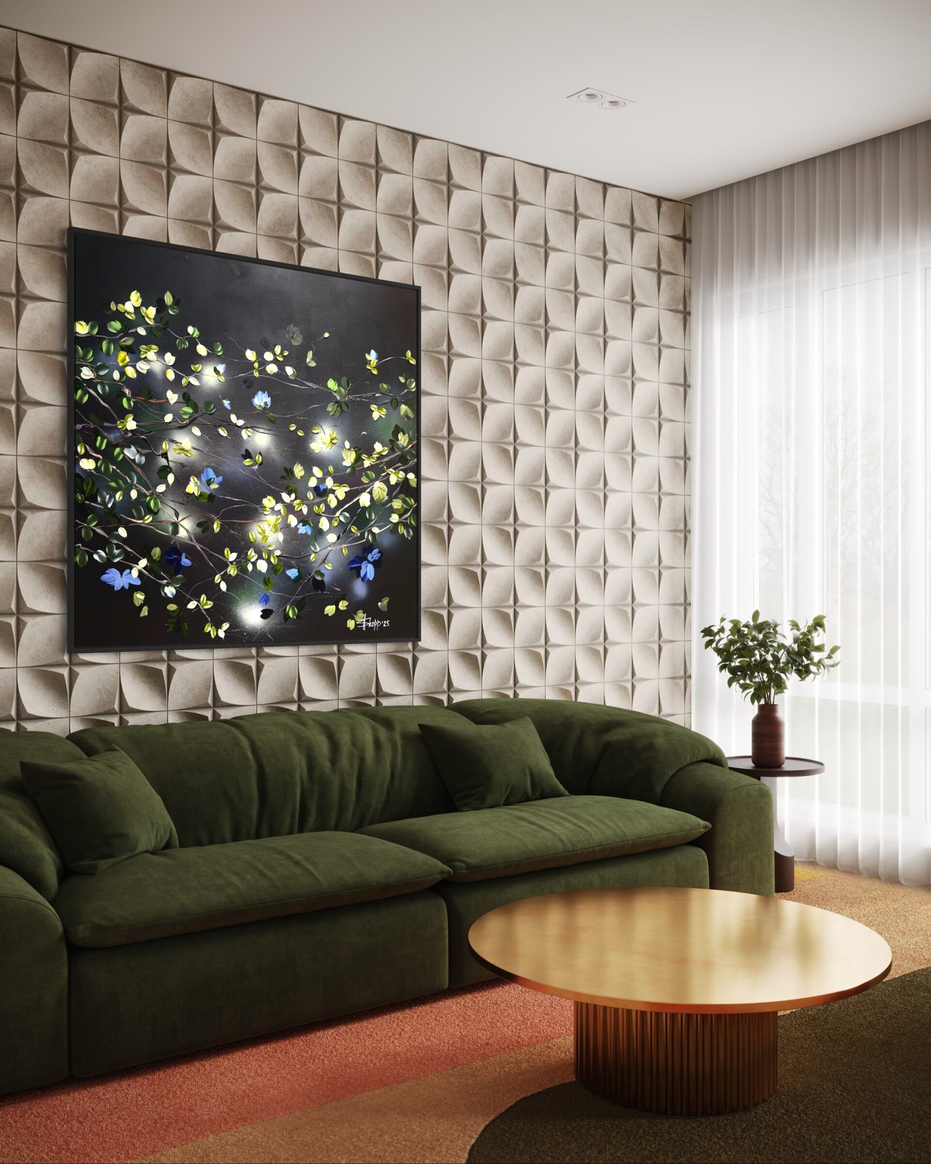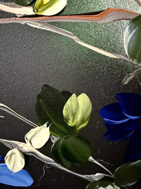 The blossoms, created with a palette knife, reveal sculptural textures that catch light and shadow, while the subtle glimmers in the background suggest the gentle glow of night. This interplay of depth and movement lends the composition both serenity and vibrancy — a dialogue between stillness and unfolding life.