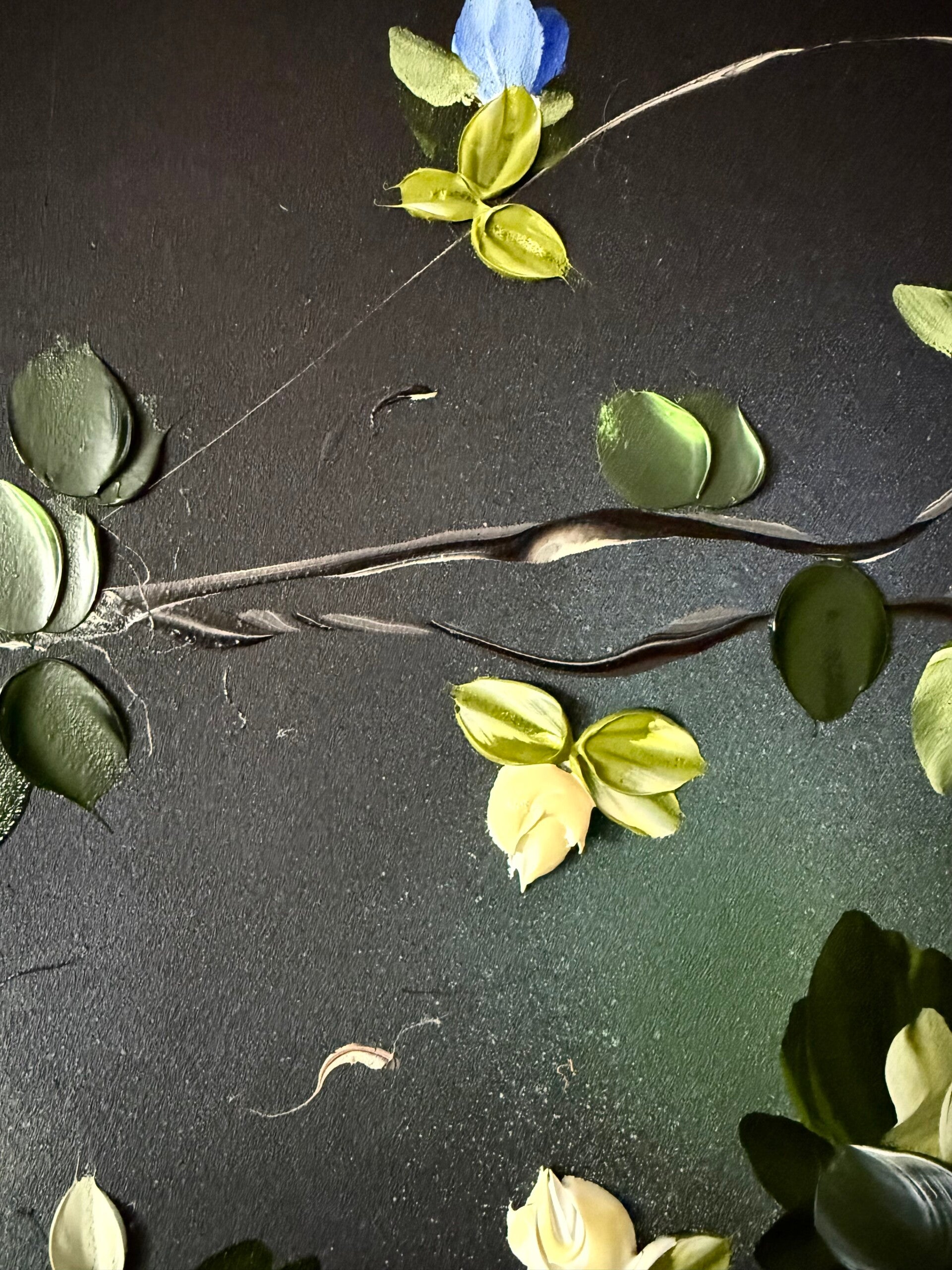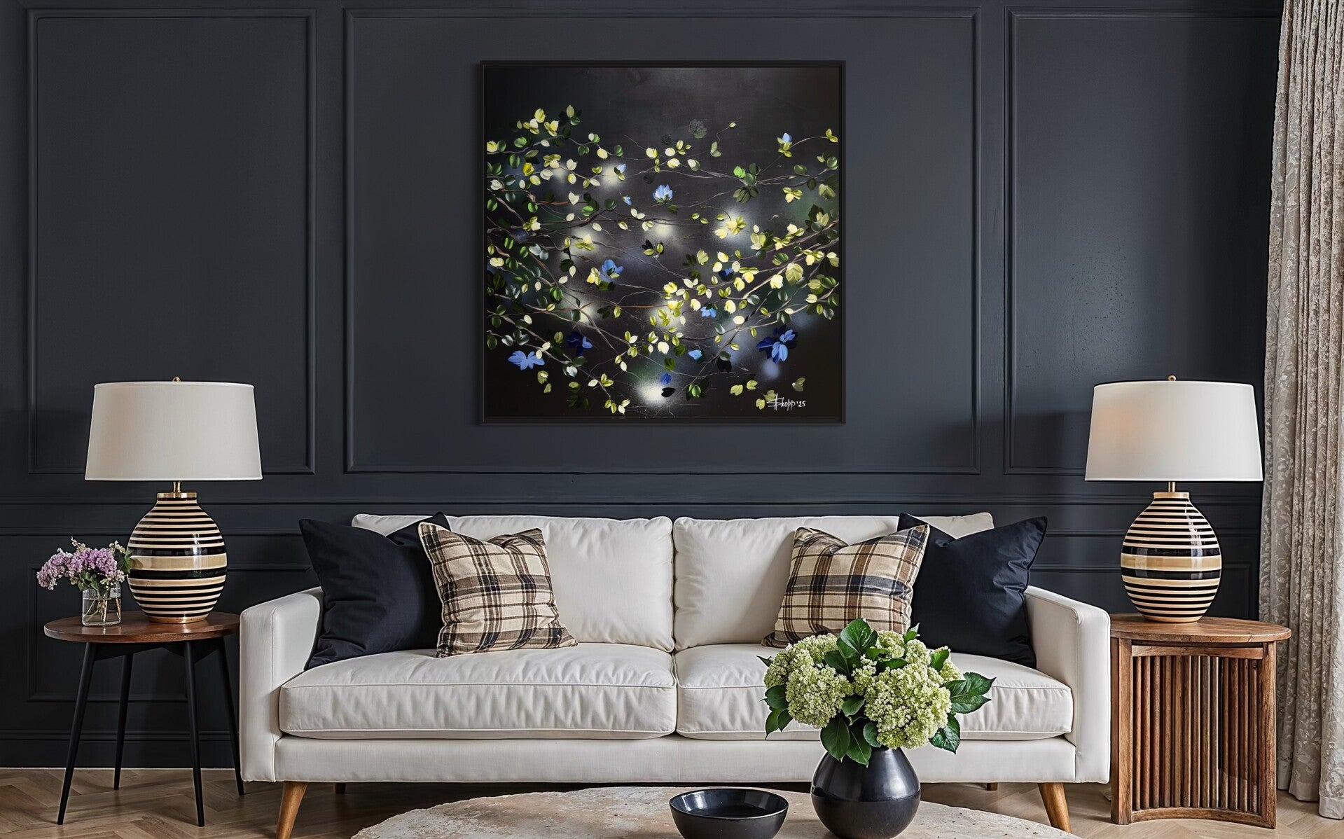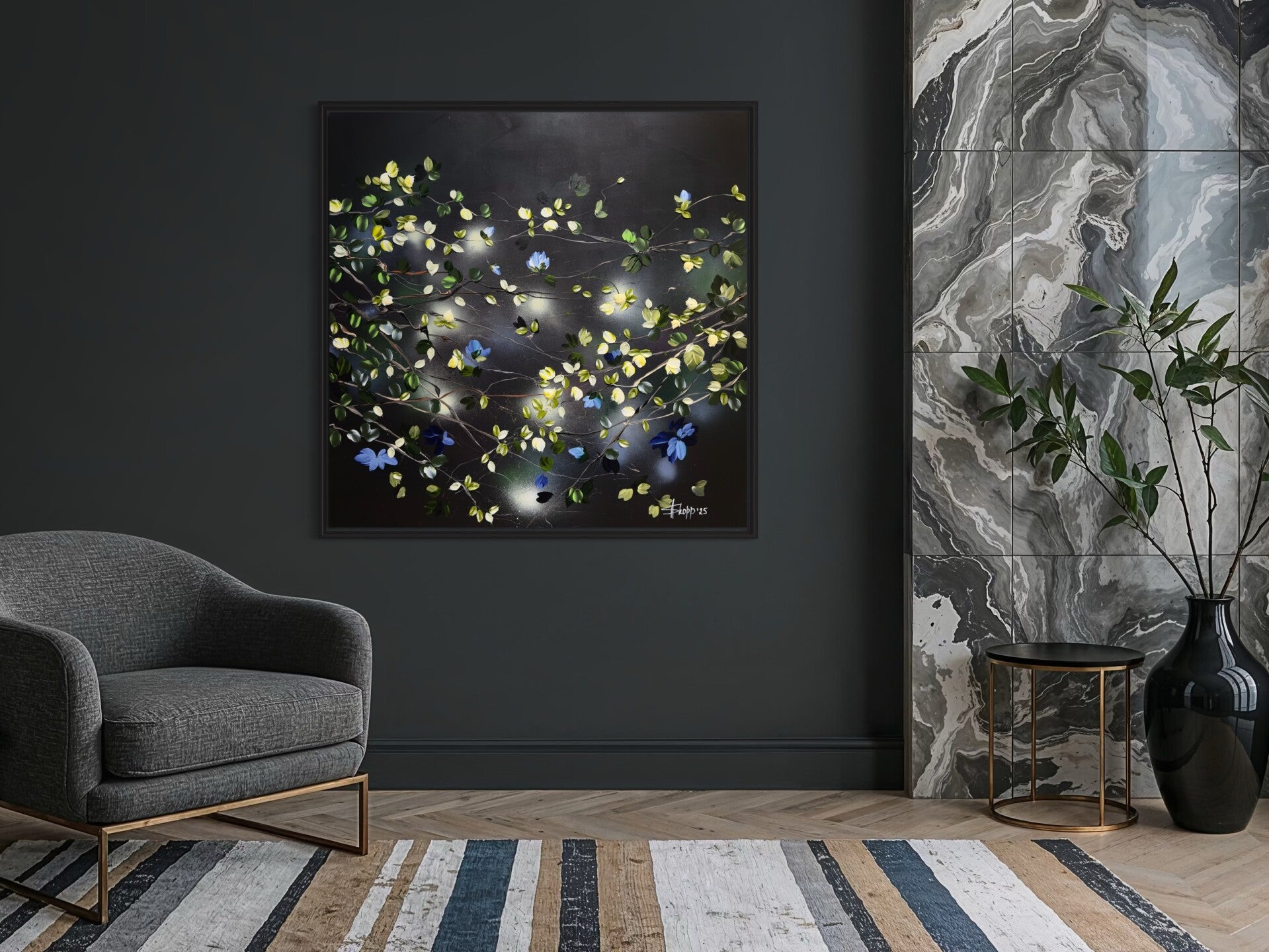 Garden at Night unfolds its quiet poetry on a dark, moonlit background, where delicate branches stretch across the canvas, carrying blossoms in soft yellow, white, and luminous blue. The contrast between the deep backdrop and the vibrant petals evokes a sense of mystery and calm, as if the viewer were wandering through a secret garden bathed in starlight.