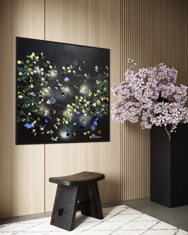 "Garden at Night" - dark/black large floral art, 100 × 100 × 2 cm (39.4 × 39.4 × 0.8 in)