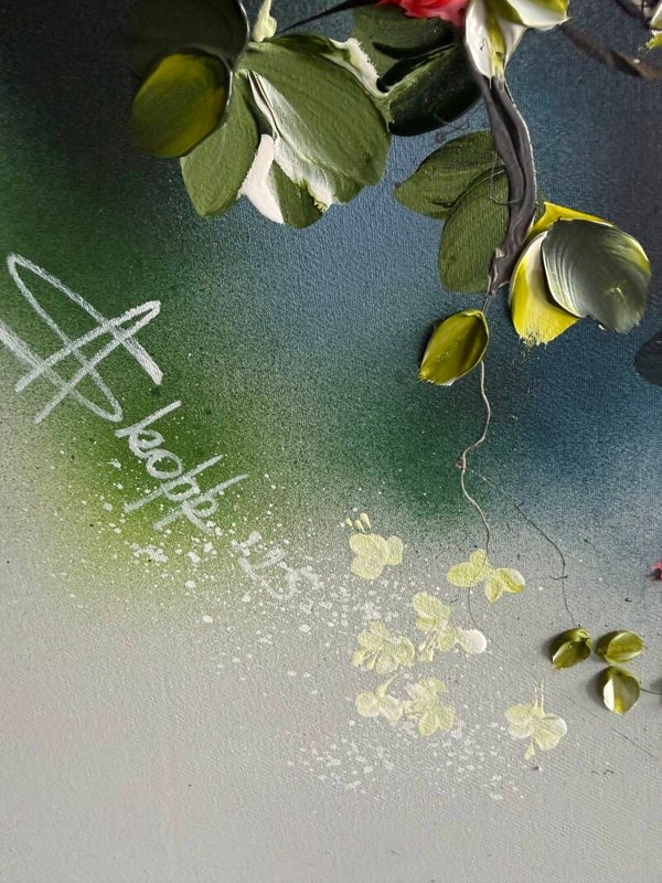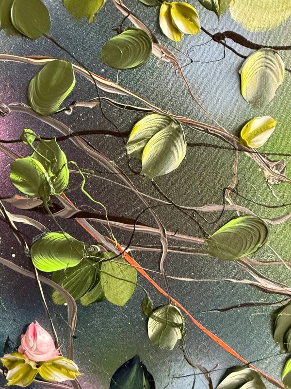 The piece evokes the gentle rhythm of nature — as if sunlight and breeze were passing through a flowering bush. Using a palette knife, the artist creates richly textured petals and leaves that appear almost sculptural, standing out against the softly blended background of grey, green, and blue tones. The work balances abstraction and realism, expressing both quiet energy and natural grace.
