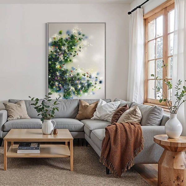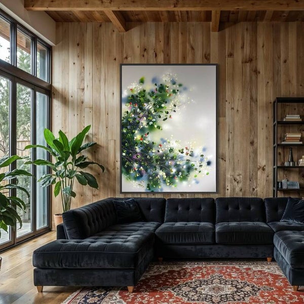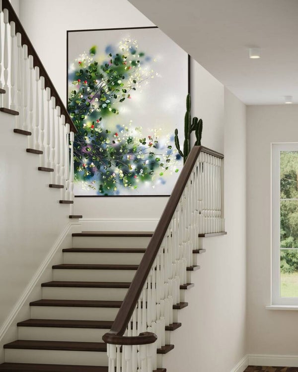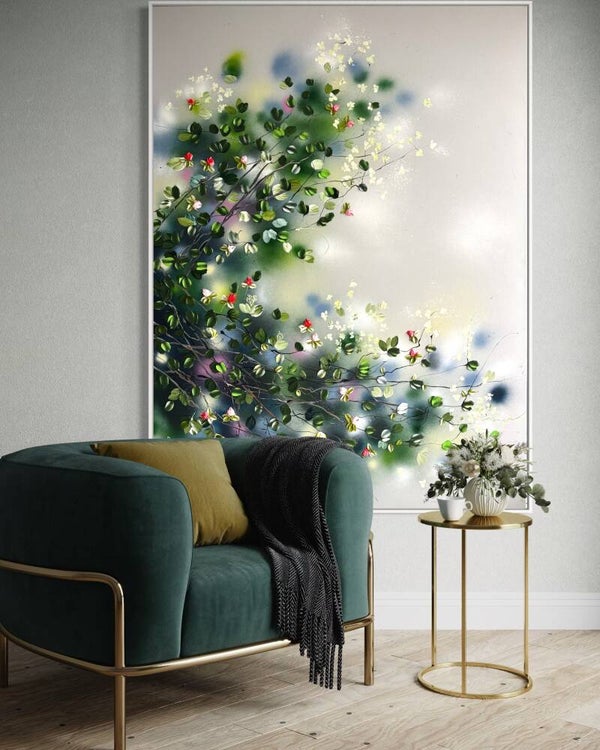 Rose Bush III captures the delicate harmony between stillness and vitality. Painted on cotton canvas (120 × 160 cm / 47.2 × 63 in, unstretched 134 × 174 cm / 52.8 × 68.5 in), the composition unfolds with fine, flowing branches covered in blossoms of soft white and vivid red, interwoven with leaves in luminous greens.