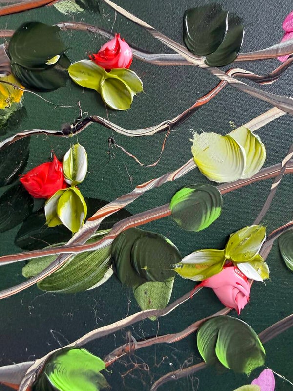 The palette knife technique gives each element a sculptural texture, making the blossoms appear almost tangible. Light and shadow move gently across the surface, enhancing the depth and harmony of the composition.