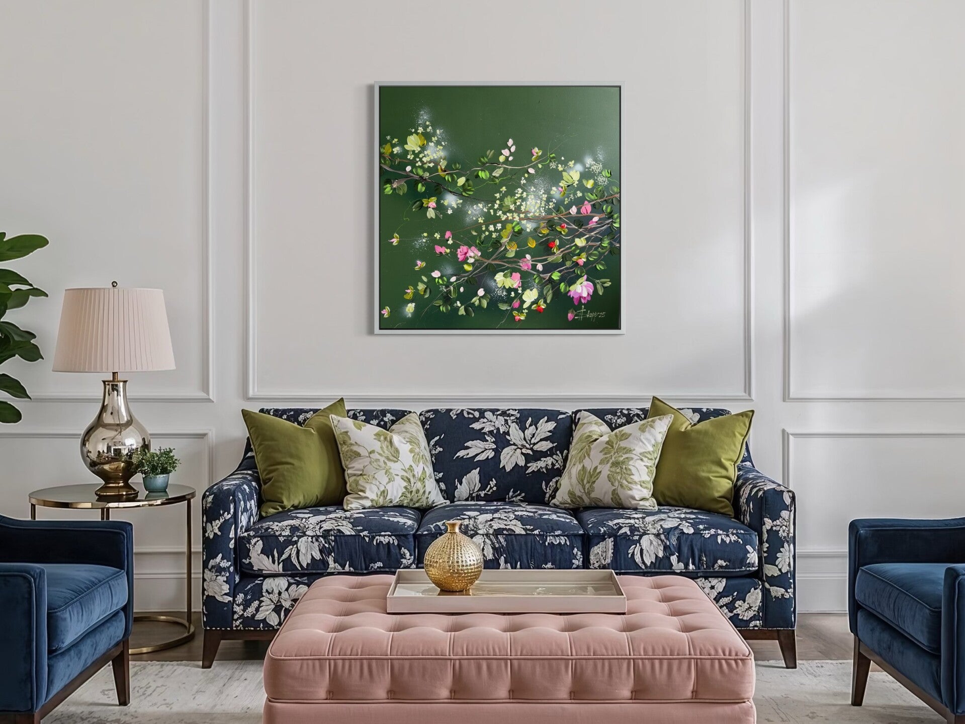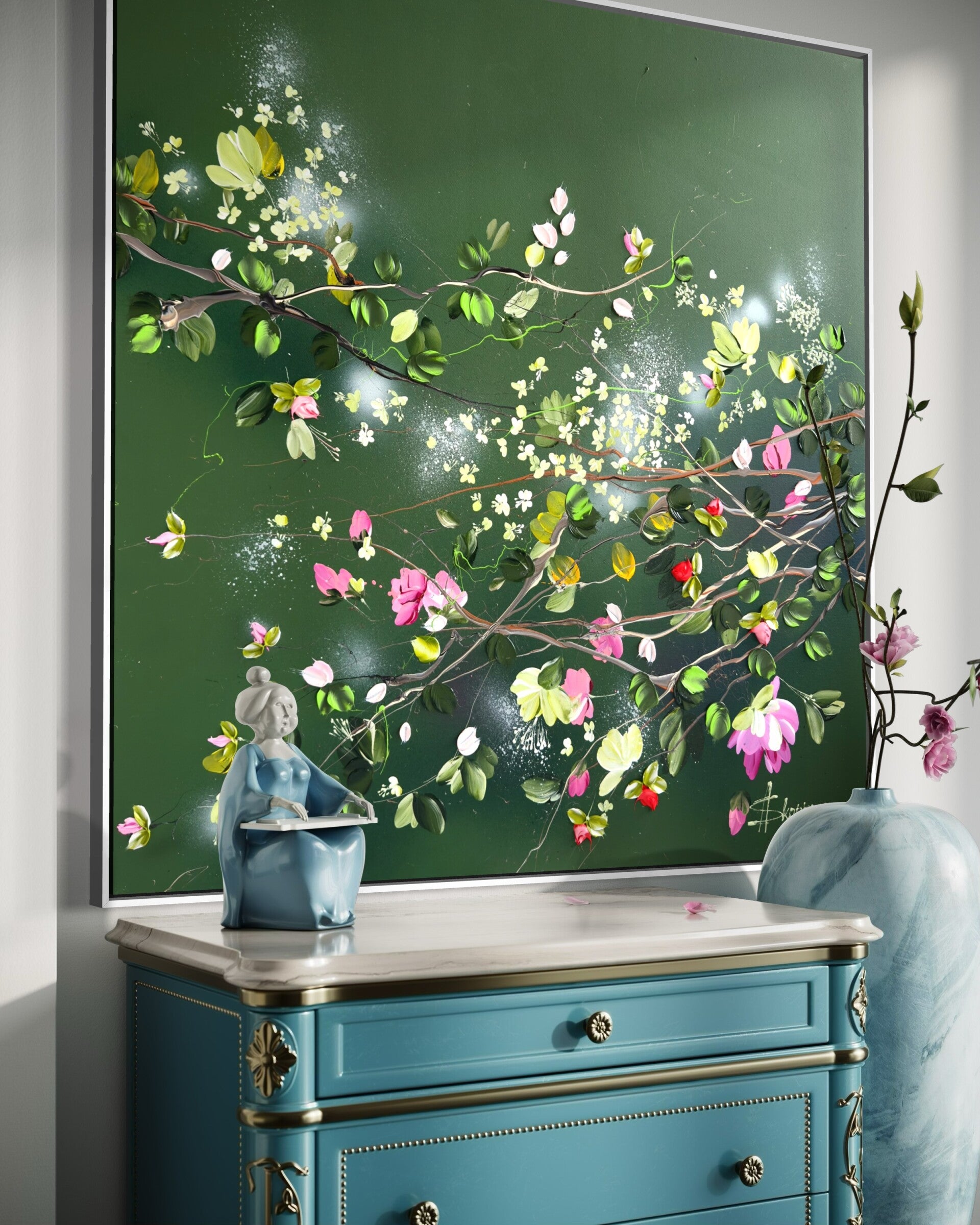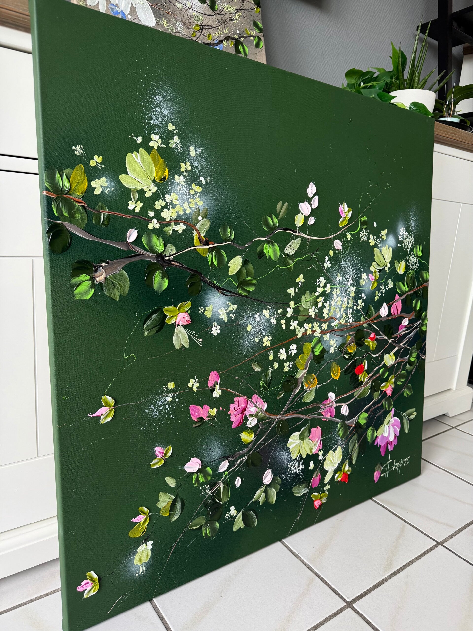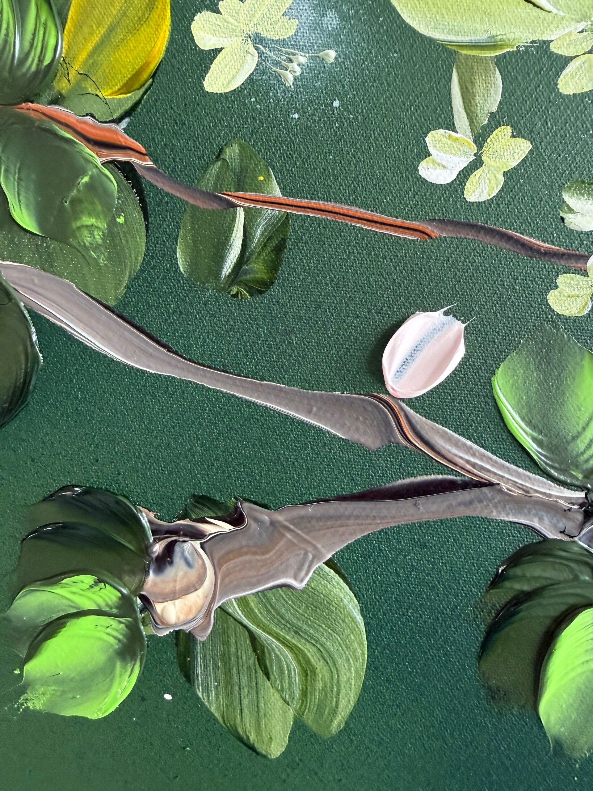 Whispers in Green II captures the quiet poetry of nature through a play of deep greens, soft whites, and blooming pinks. Against a rich forest-green background, fine branches stretch across the canvas, carrying delicate blossoms that seem to glow from within. The atmosphere evokes the stillness of a hidden garden, where every leaf and petal whispers of life and renewal.