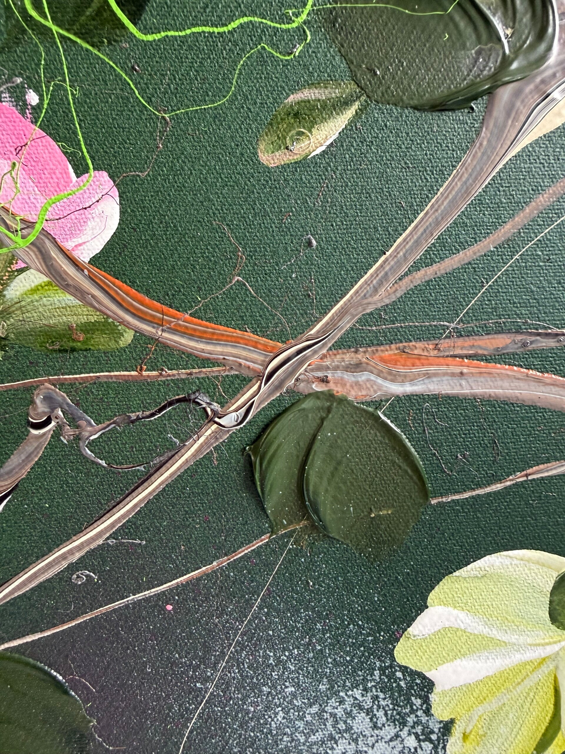 "Whispers in Green II" floral dark green painting on canvas, 90 × 90 × 2 cm / 35.4 × 35.4 × 0.8 in