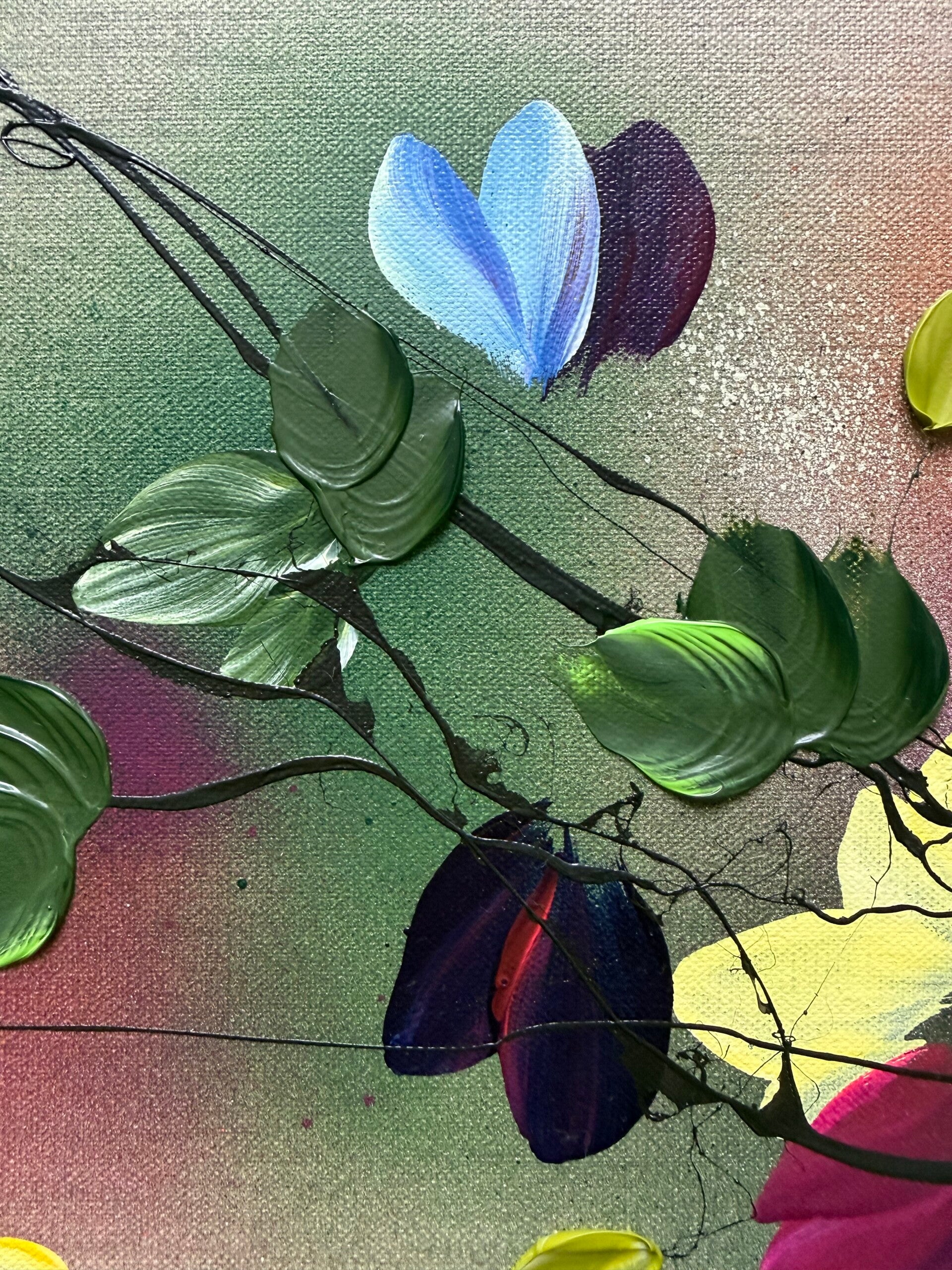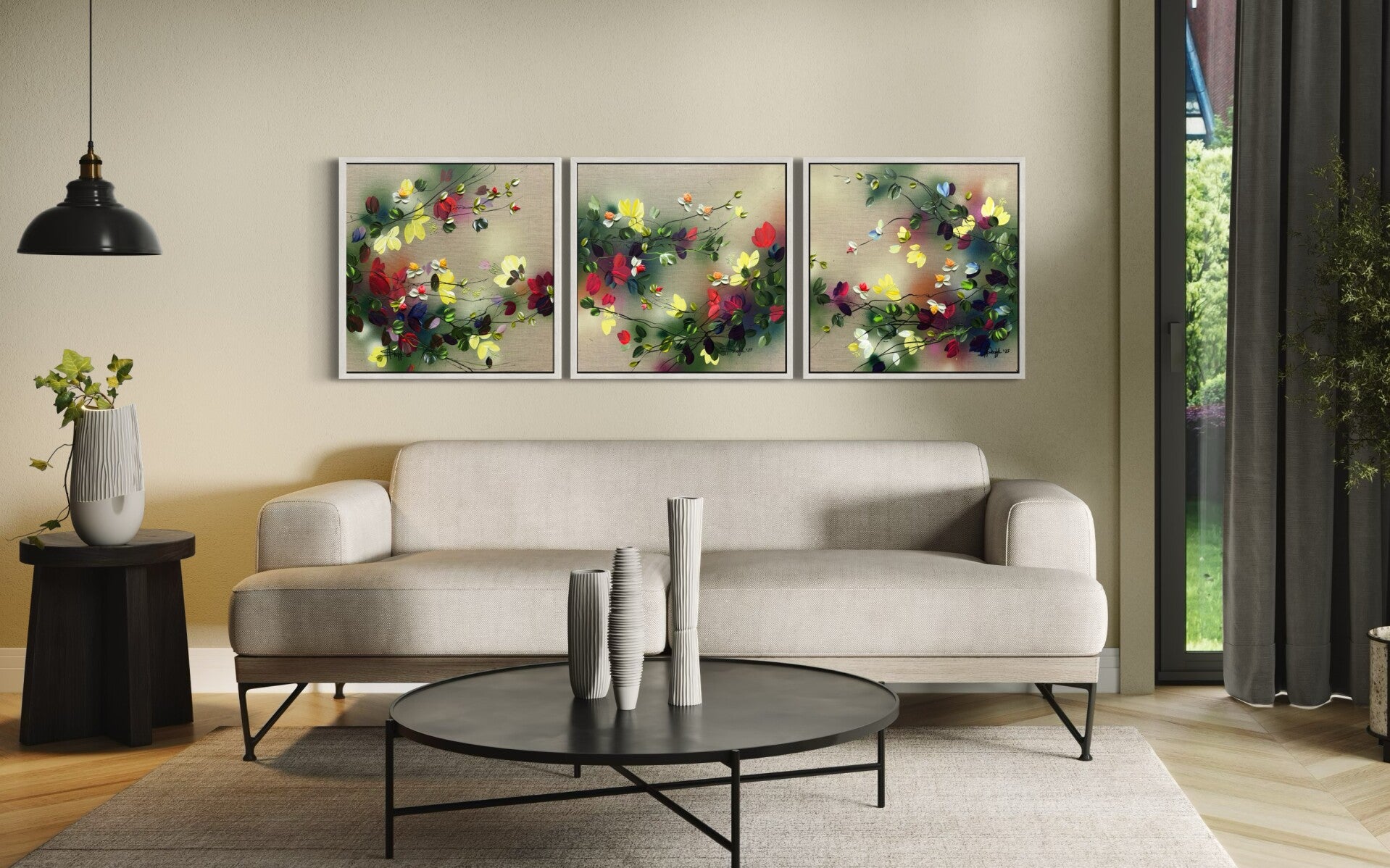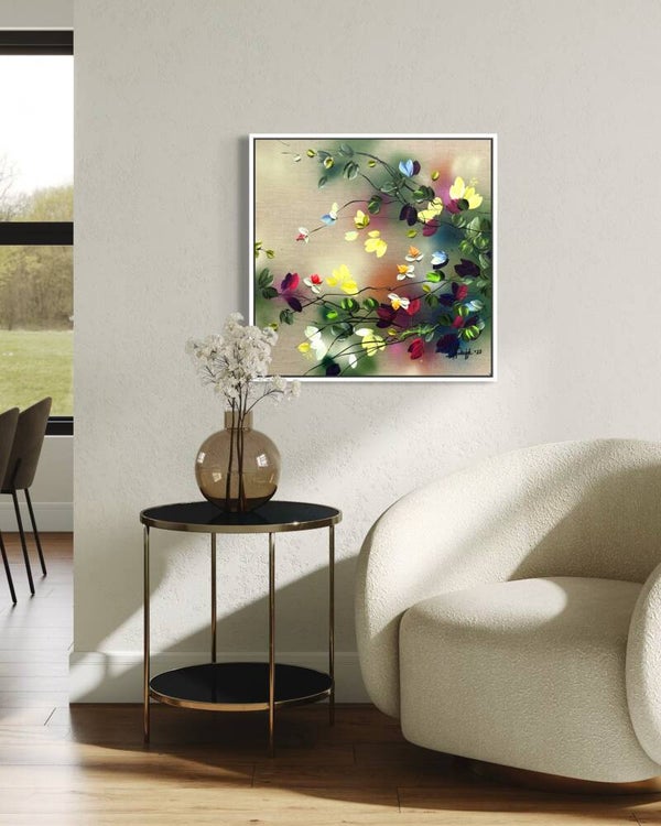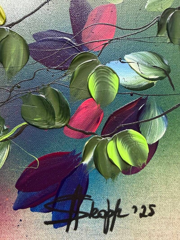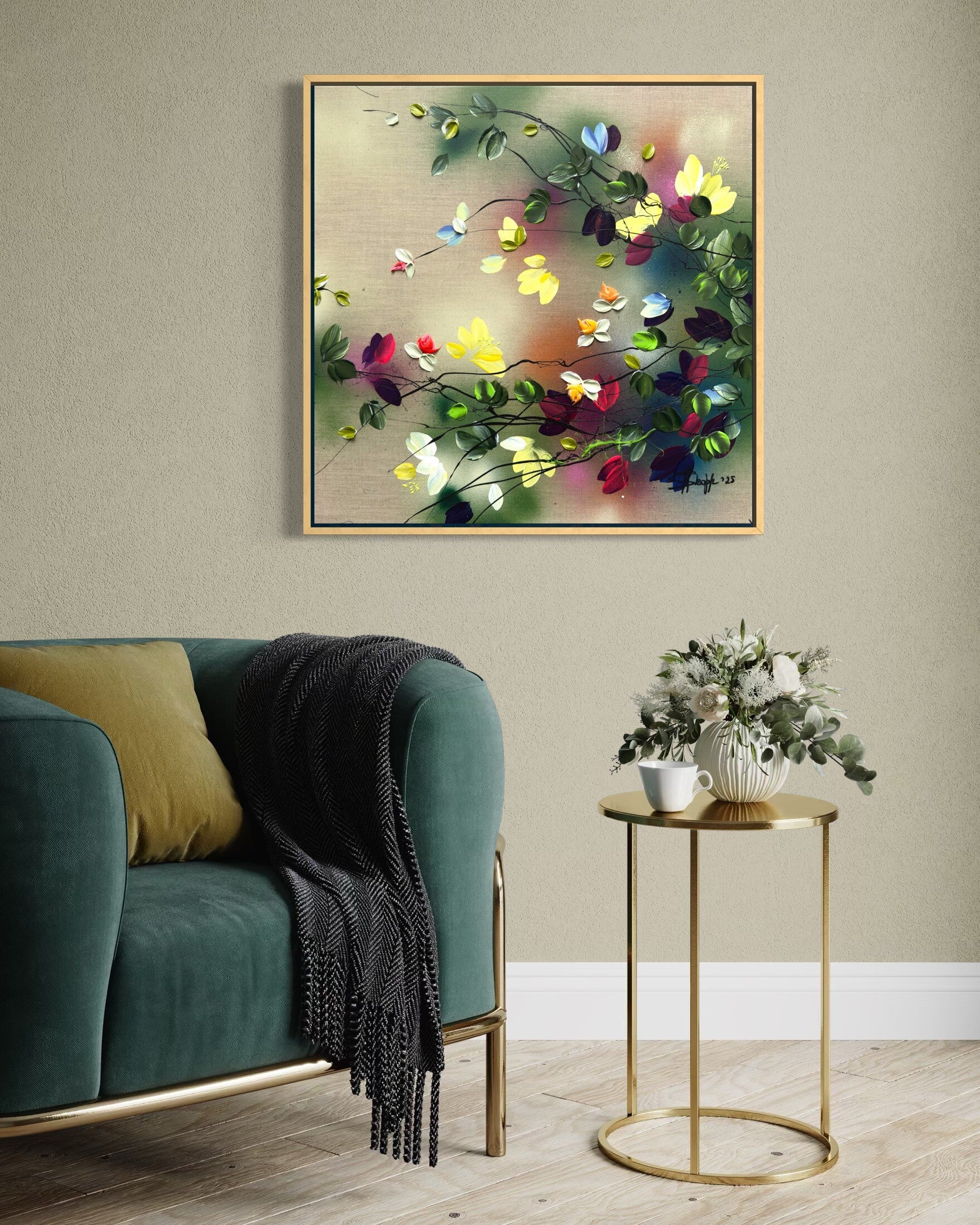Scents of Autumn captures the warmth and vibrancy of the changing season. Painted on linen canvas, the composition unfolds in graceful branches adorned with blossoms in shades of yellow, red, orange, green, and blue — colors that echo the gentle transition from late summer to autumn light.