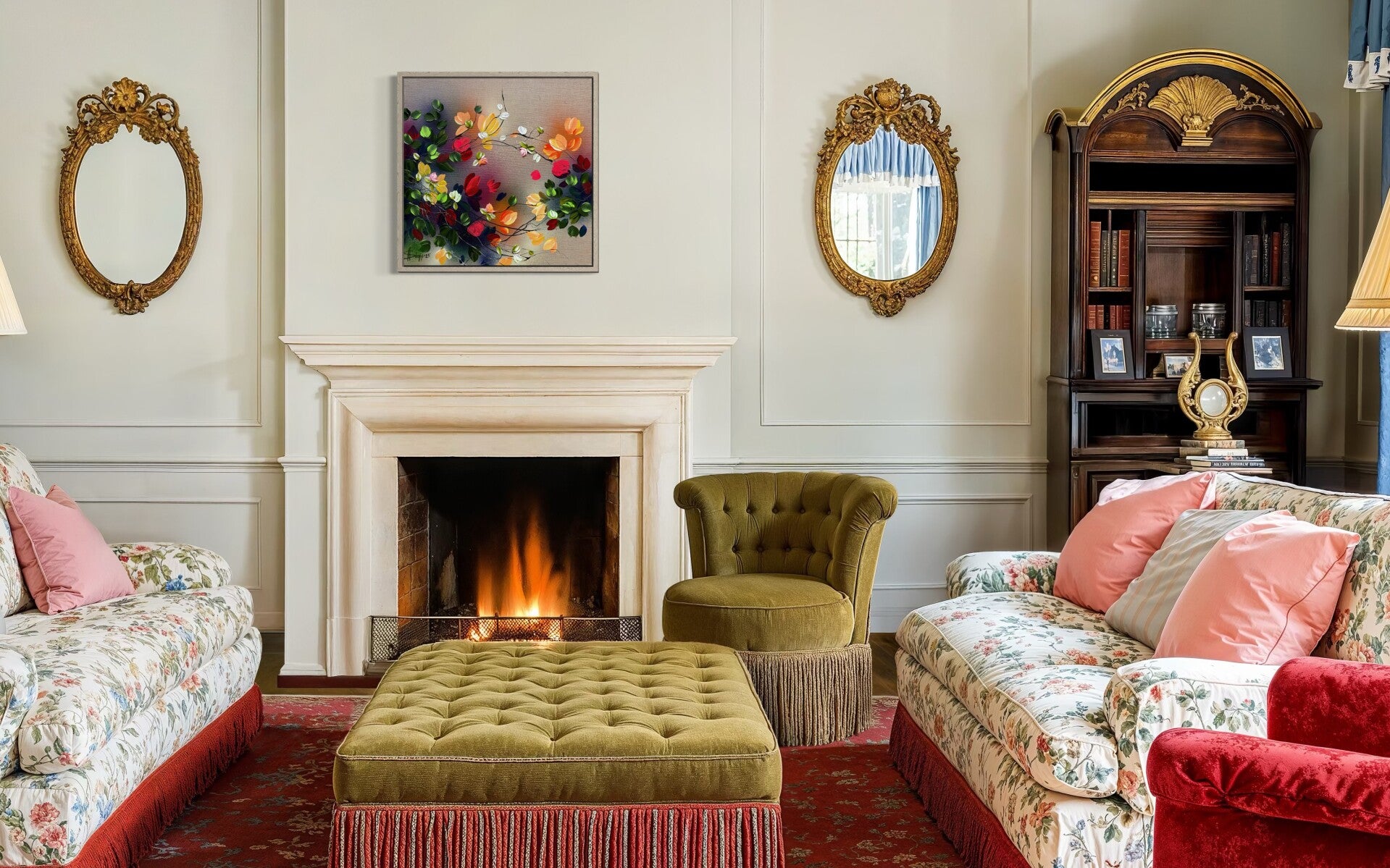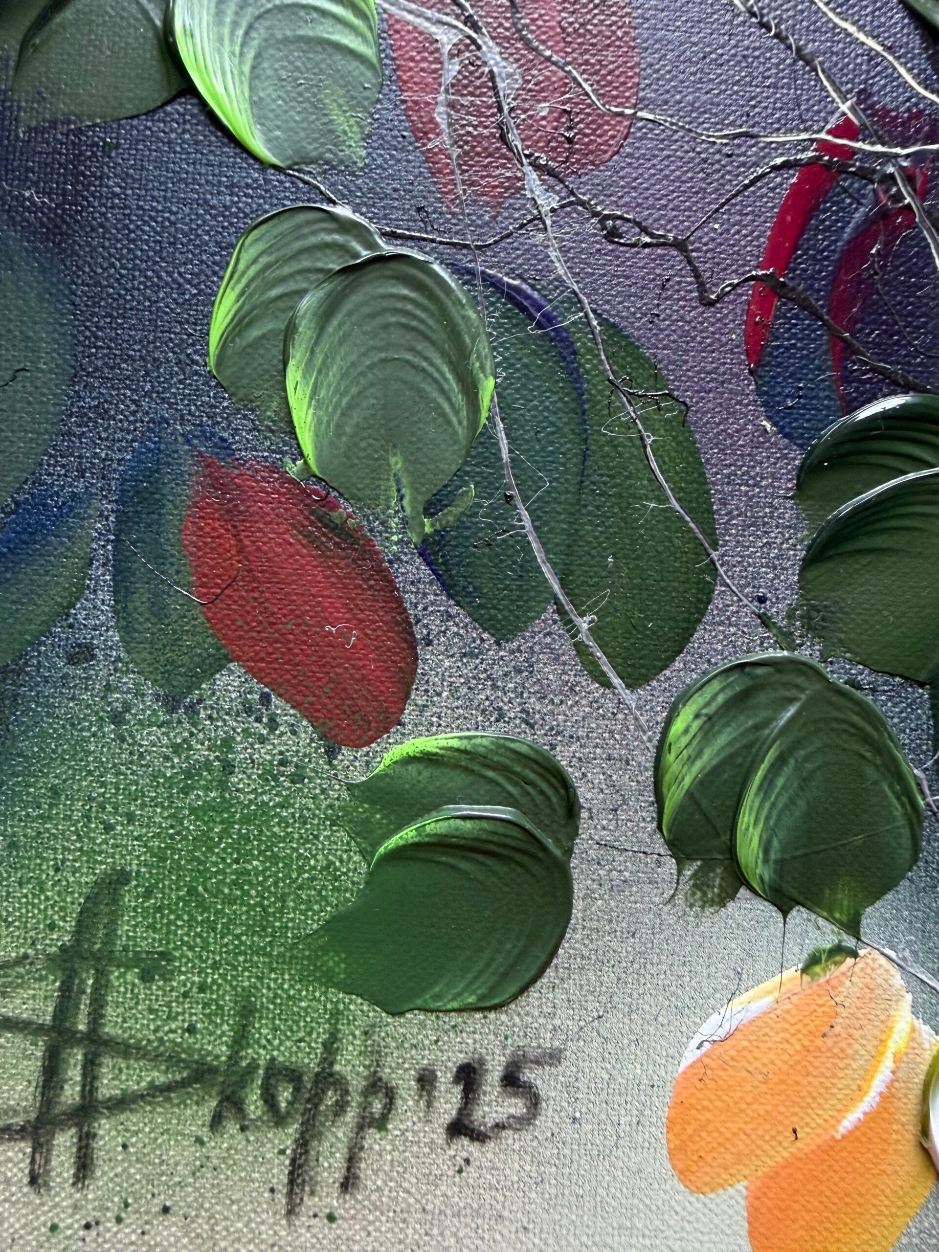 Autumn Palette reflects the colors of early autumn. On a natural linen canvas, a network of fine branches unfolds, adorned with blossoms in shades of yellow, red, orange, green, and blue. The combination of colors suggests the transition between late-summer warmth and the first autumn tones.