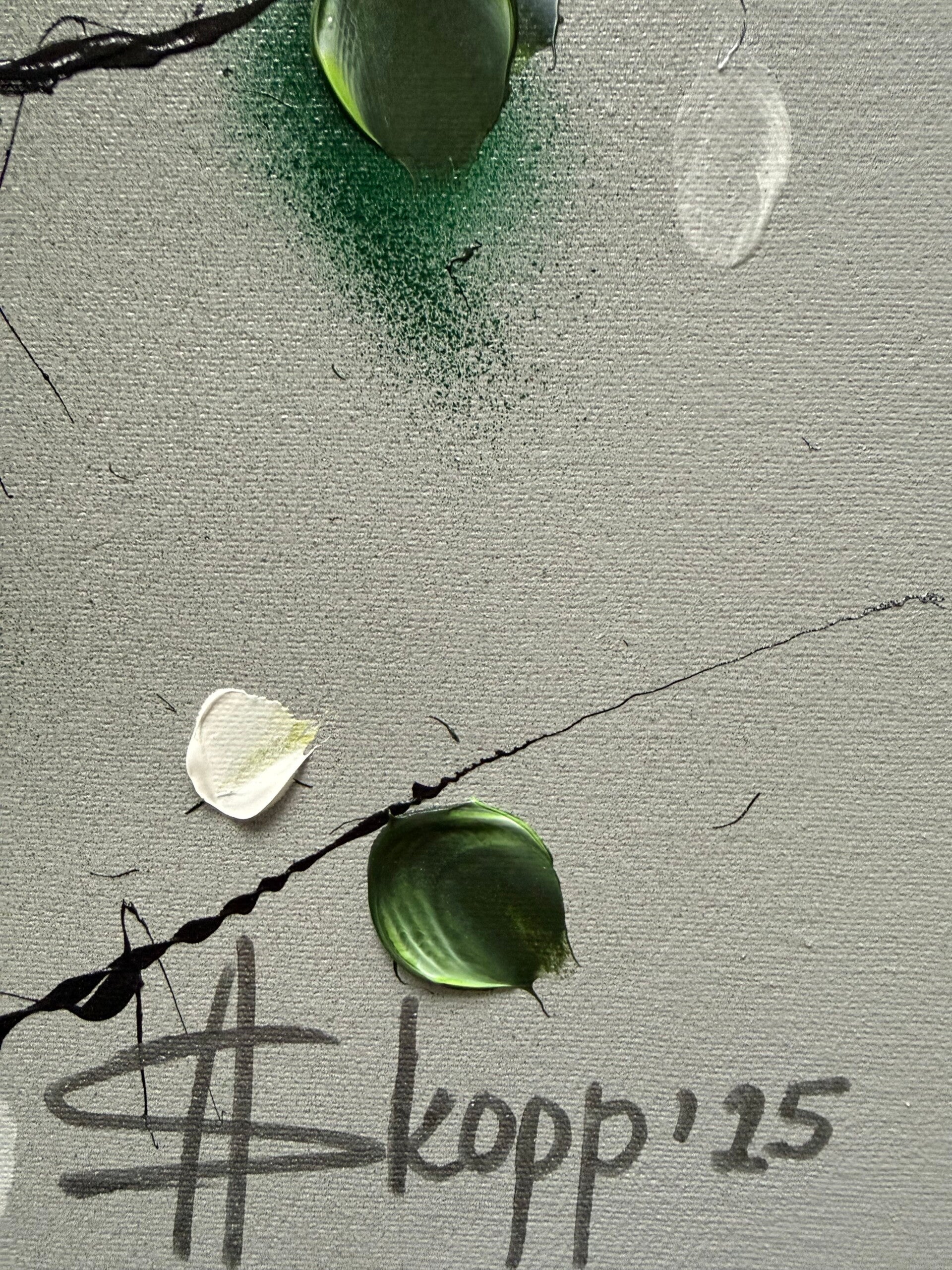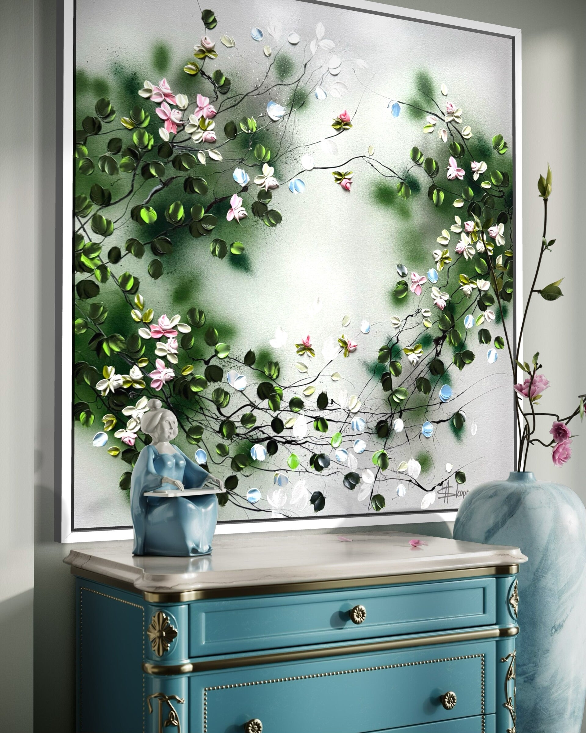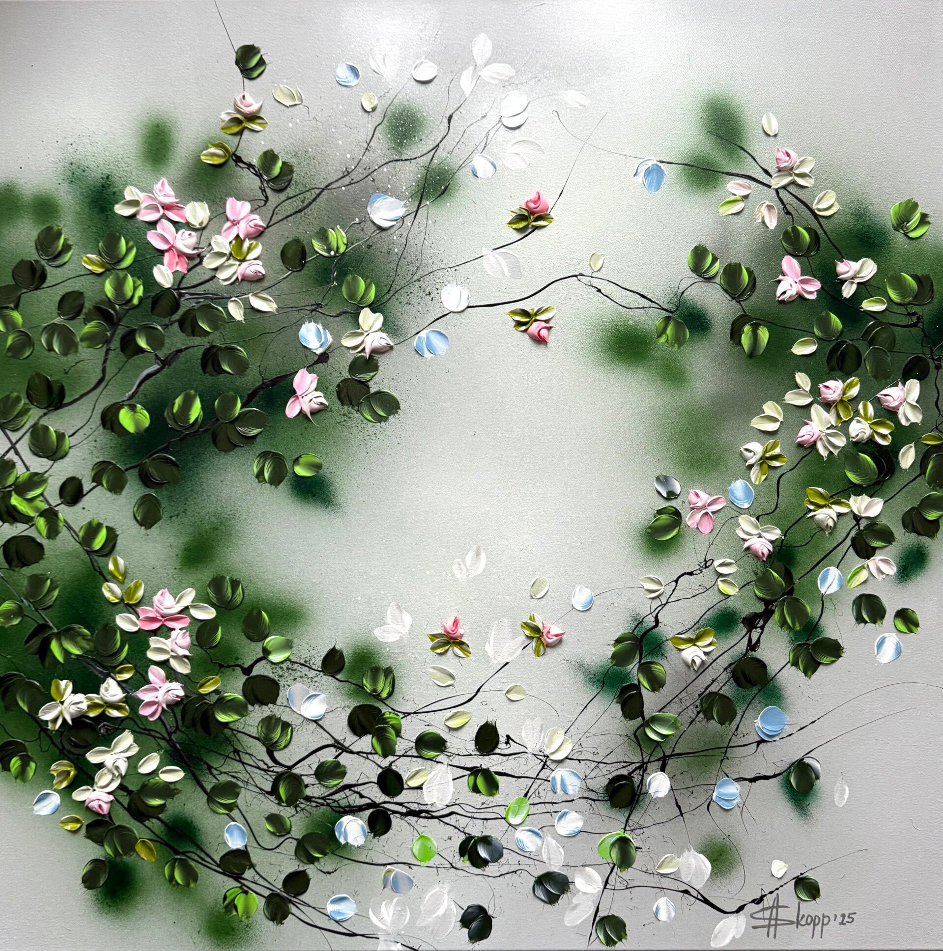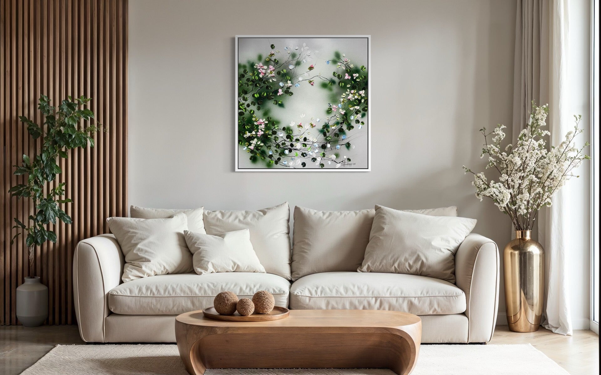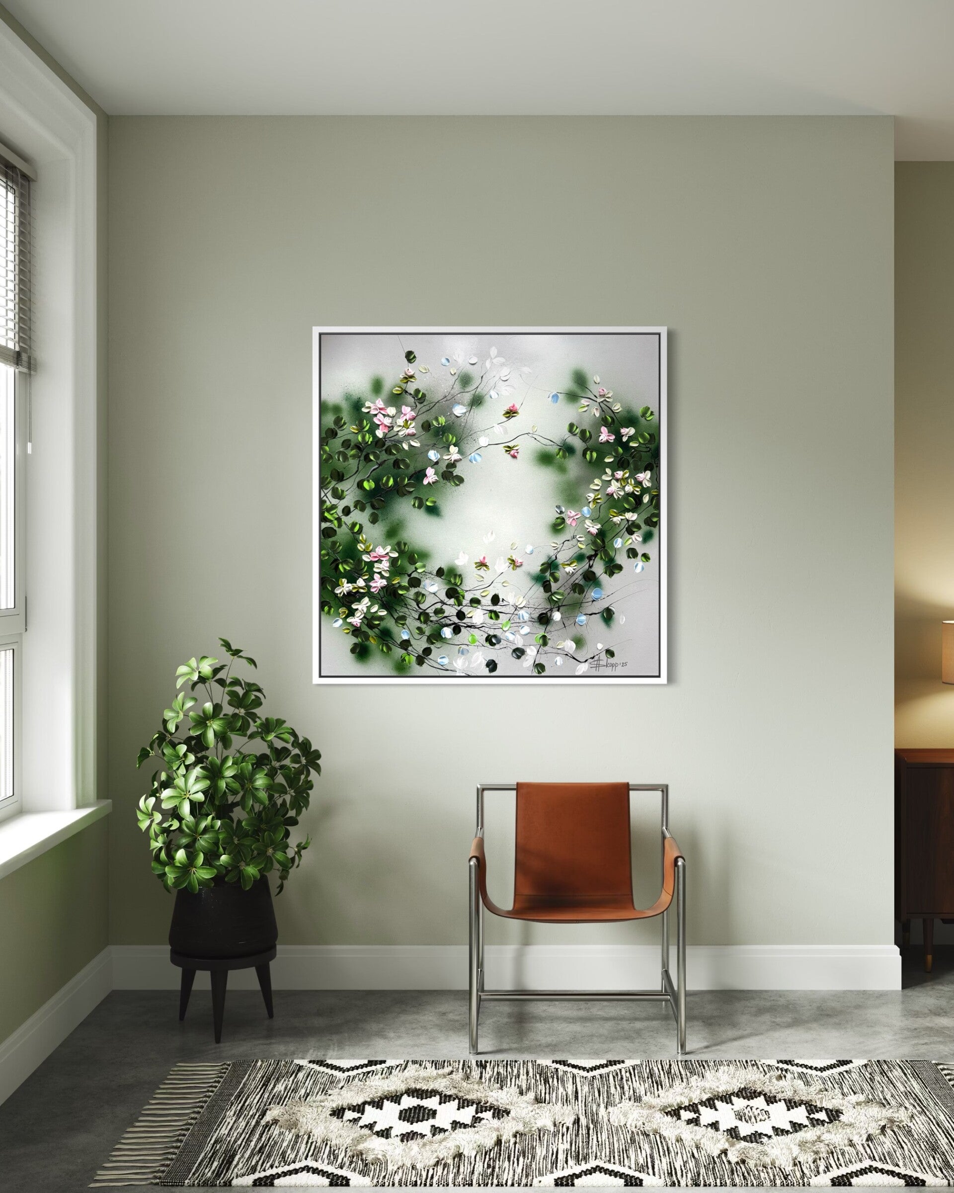 Roses in Grey Cloud is a contemporary abstract floral painting created on a cotton canvas, measuring 100 × 100 cm. The artwork features branches with impasto blossoms in soft shades of pink, white, blue, and green, arranged on a light grey background. The composition combines organic movement with a calm atmosphere, making it suitable for modern interiors and minimalist spaces.