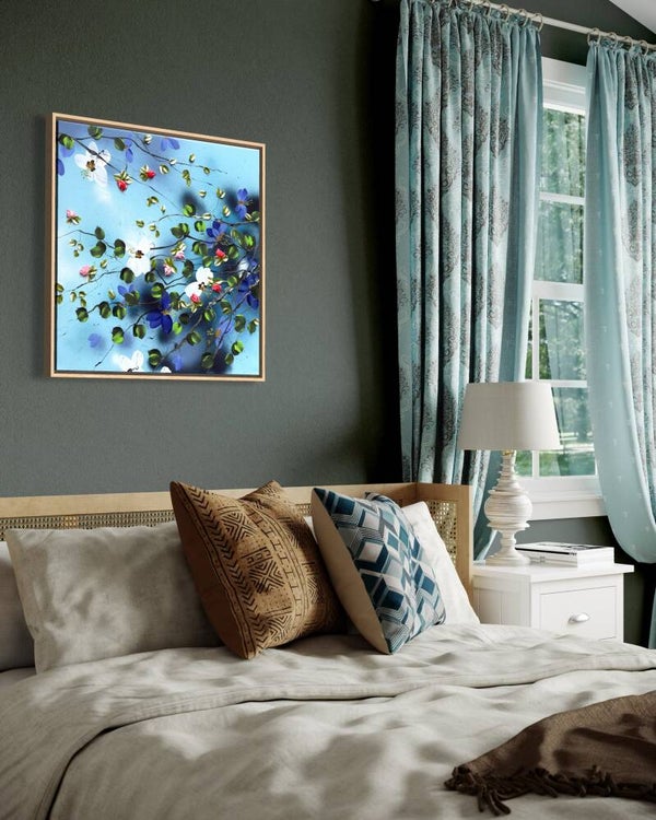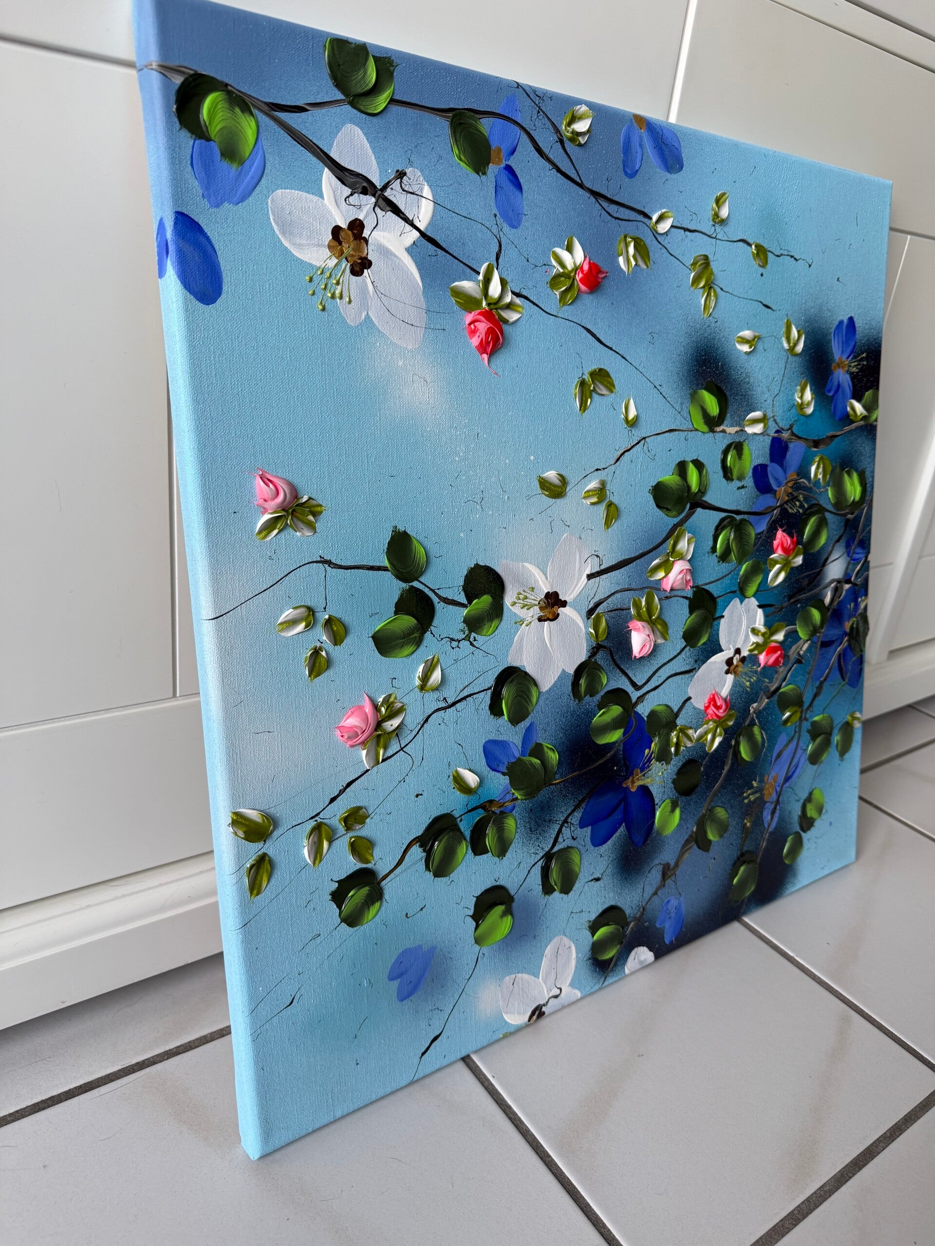 Spring in Blue presents a floral composition set against a fully painted blue background. Branches move across the canvas in soft, organic lines, carrying blossoms in shades of white, pink, blue, and green. The arrangement suggests a quiet sense of movement, echoing the lightness of early spring.