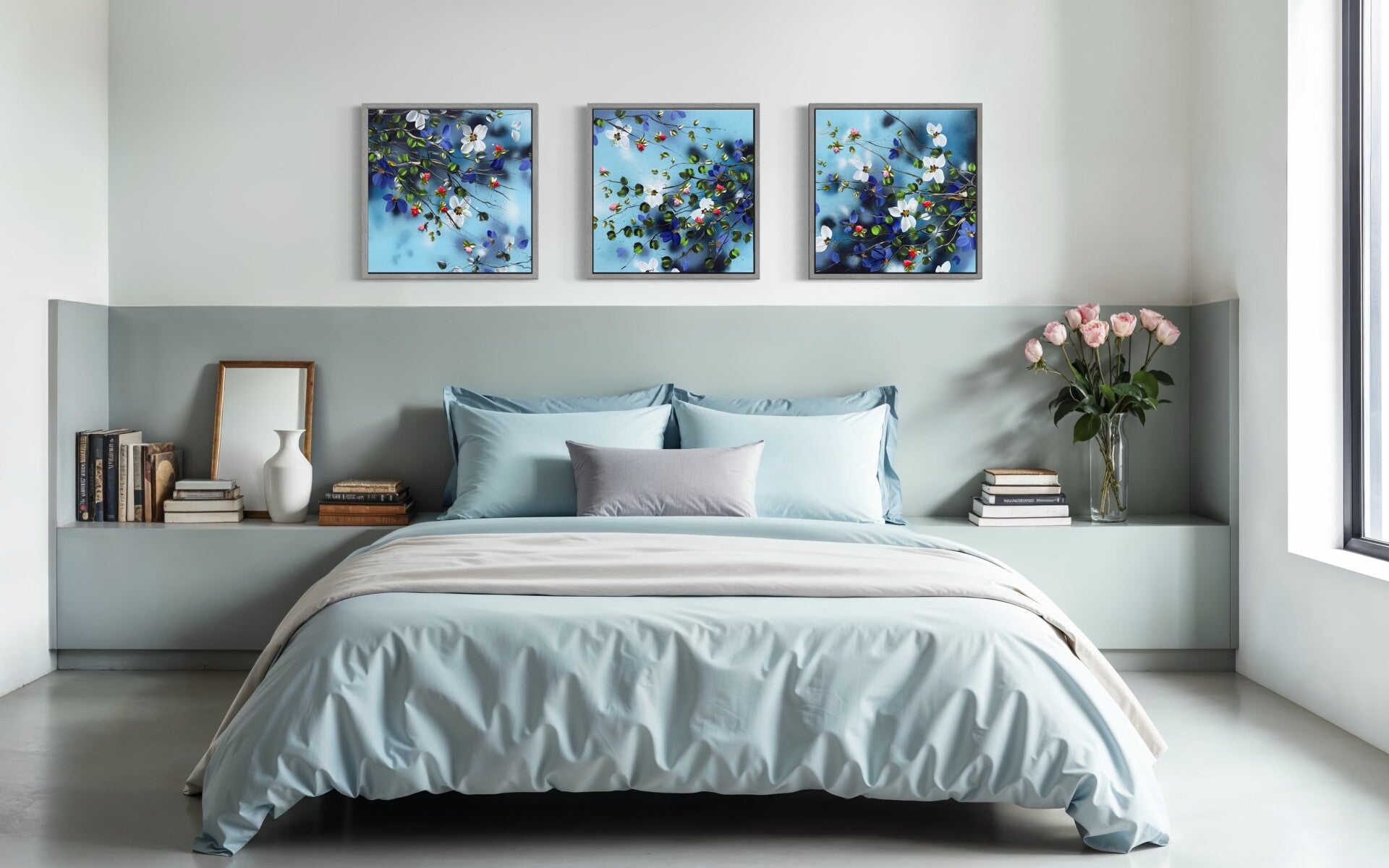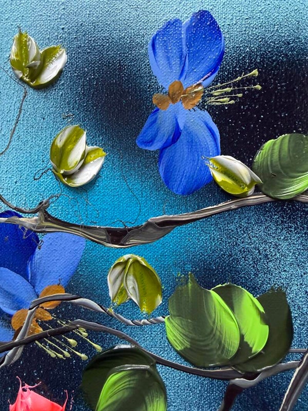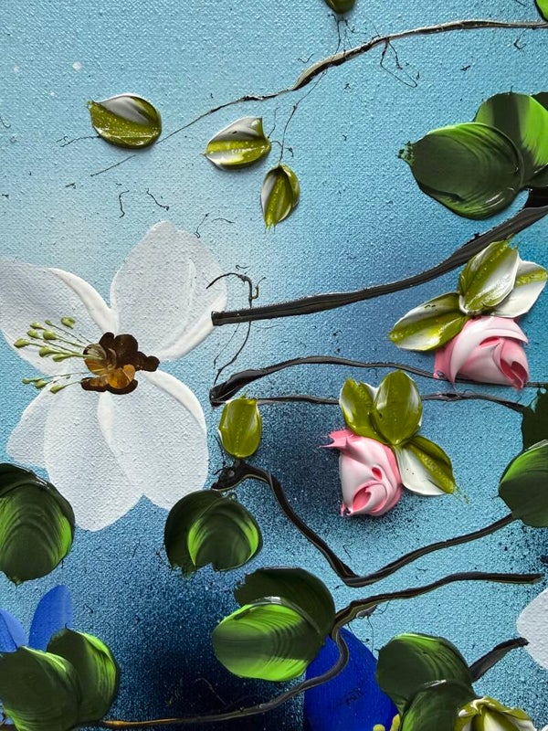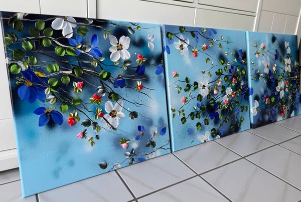 The Spring in Blue triptych brings together three individual paintings from the series into one continuous composition. Across all three canvases, branches extend in soft, organic movements, carrying blossoms in shades of white, pink, blue, and green. The fully painted blue background provides a calm setting, creating a unified flow that echoes the lightness and clarity of early spring.