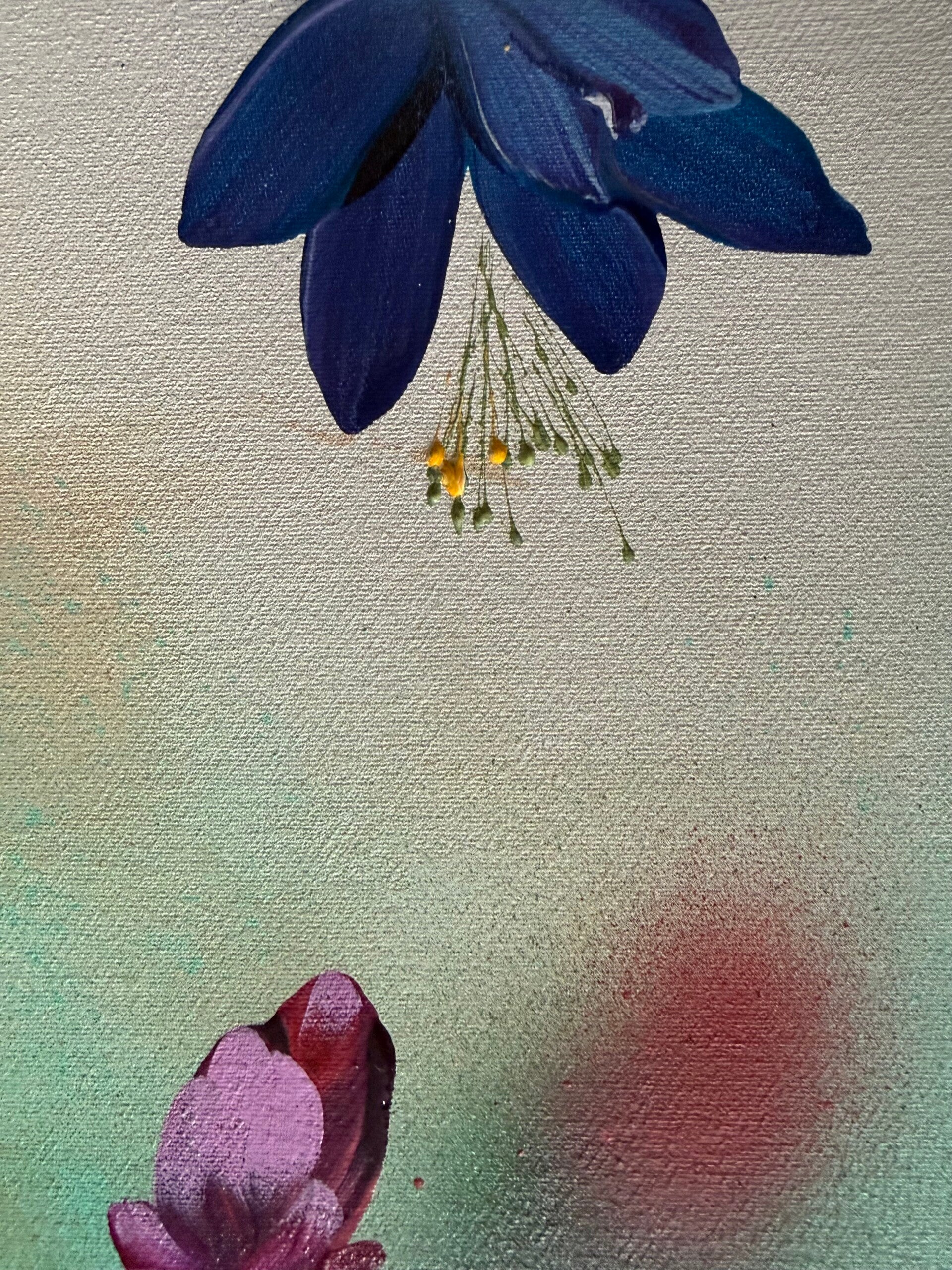 Potpourri celebrates the joyful abundance of color and form. Against a softly blended background of warm and cool tones, branches weave through the canvas carrying blossoms in vivid purples, blues, reds, pinks, and delicate whites — a lively interplay that captures the richness of a flourishing garden.