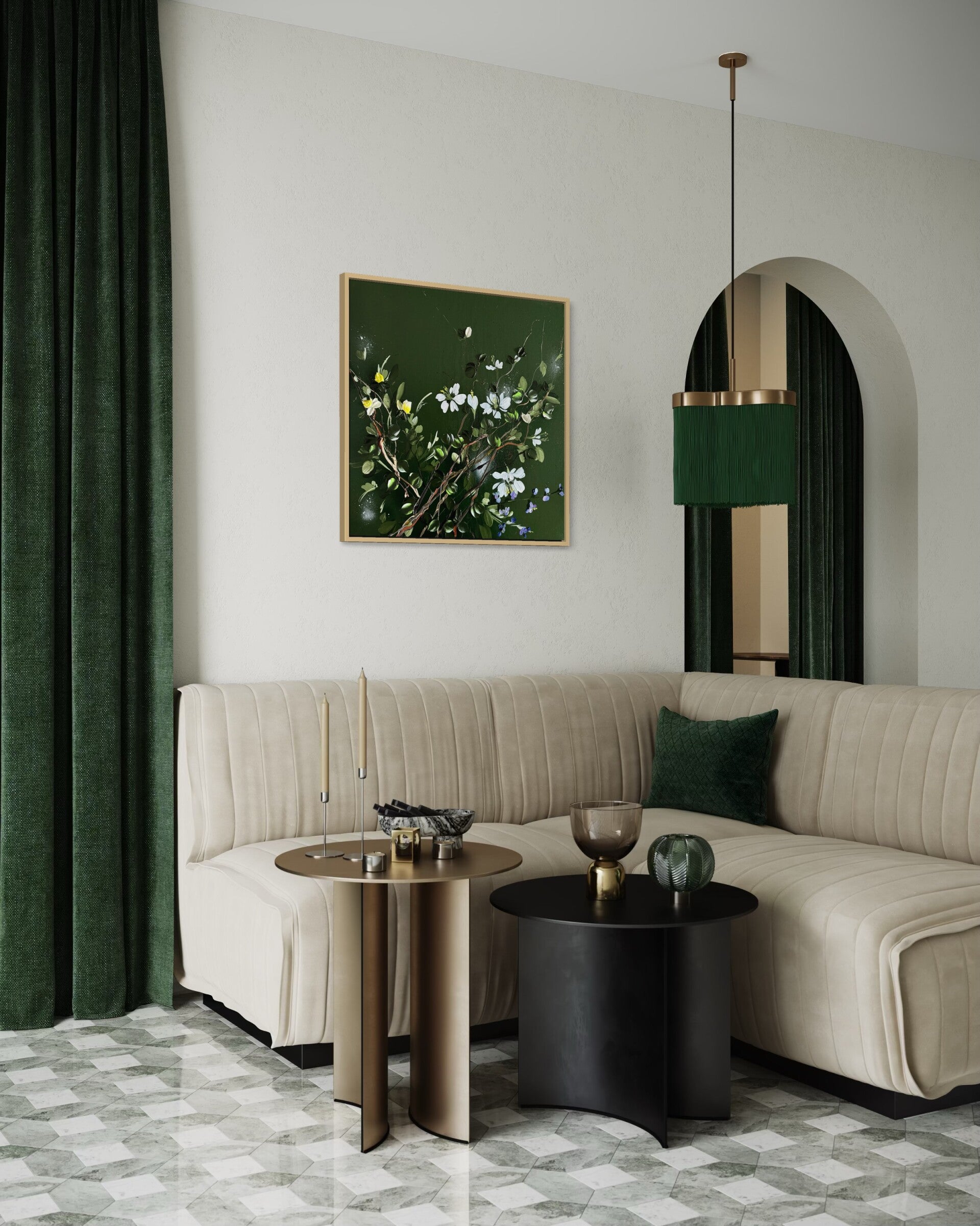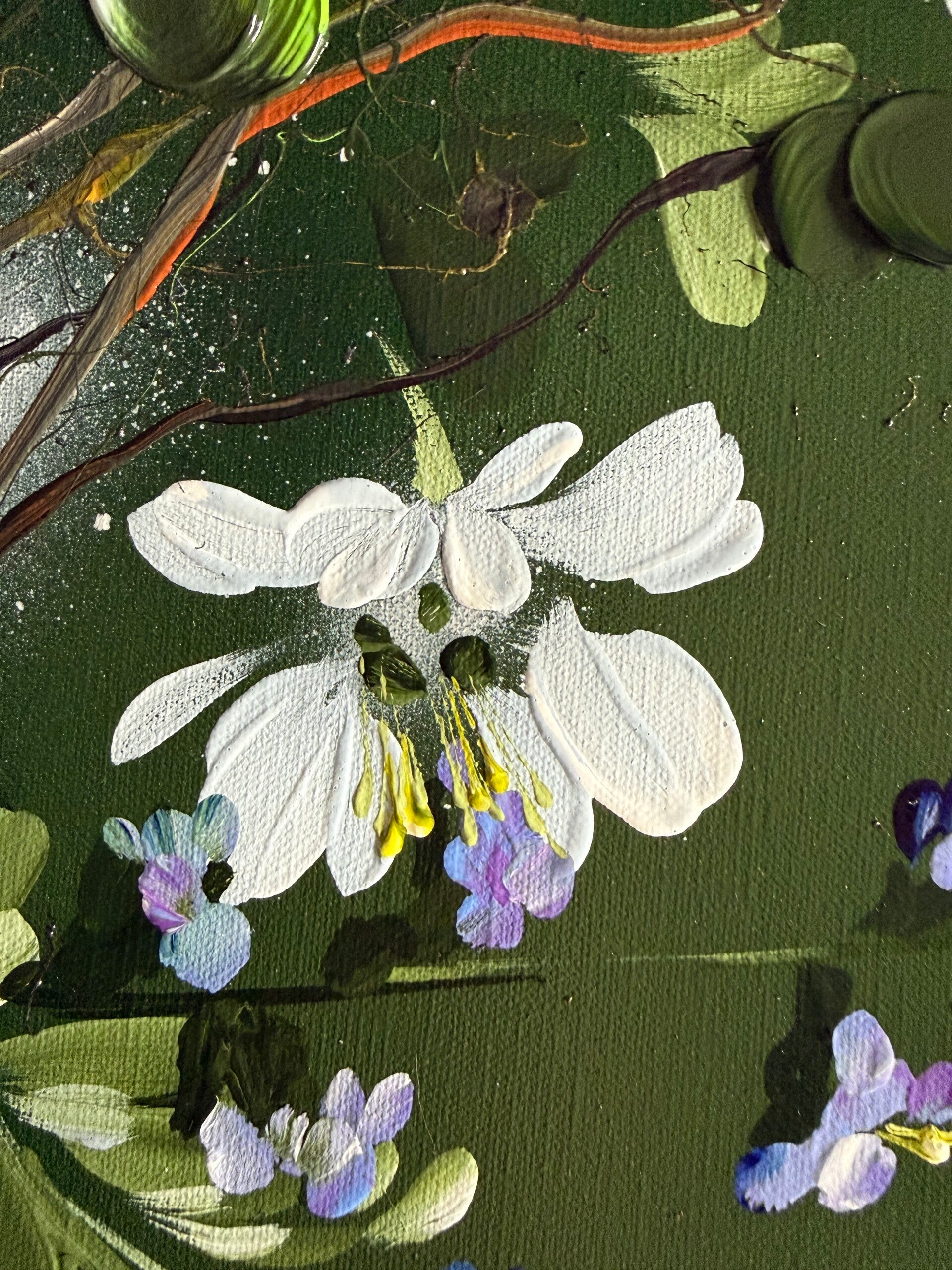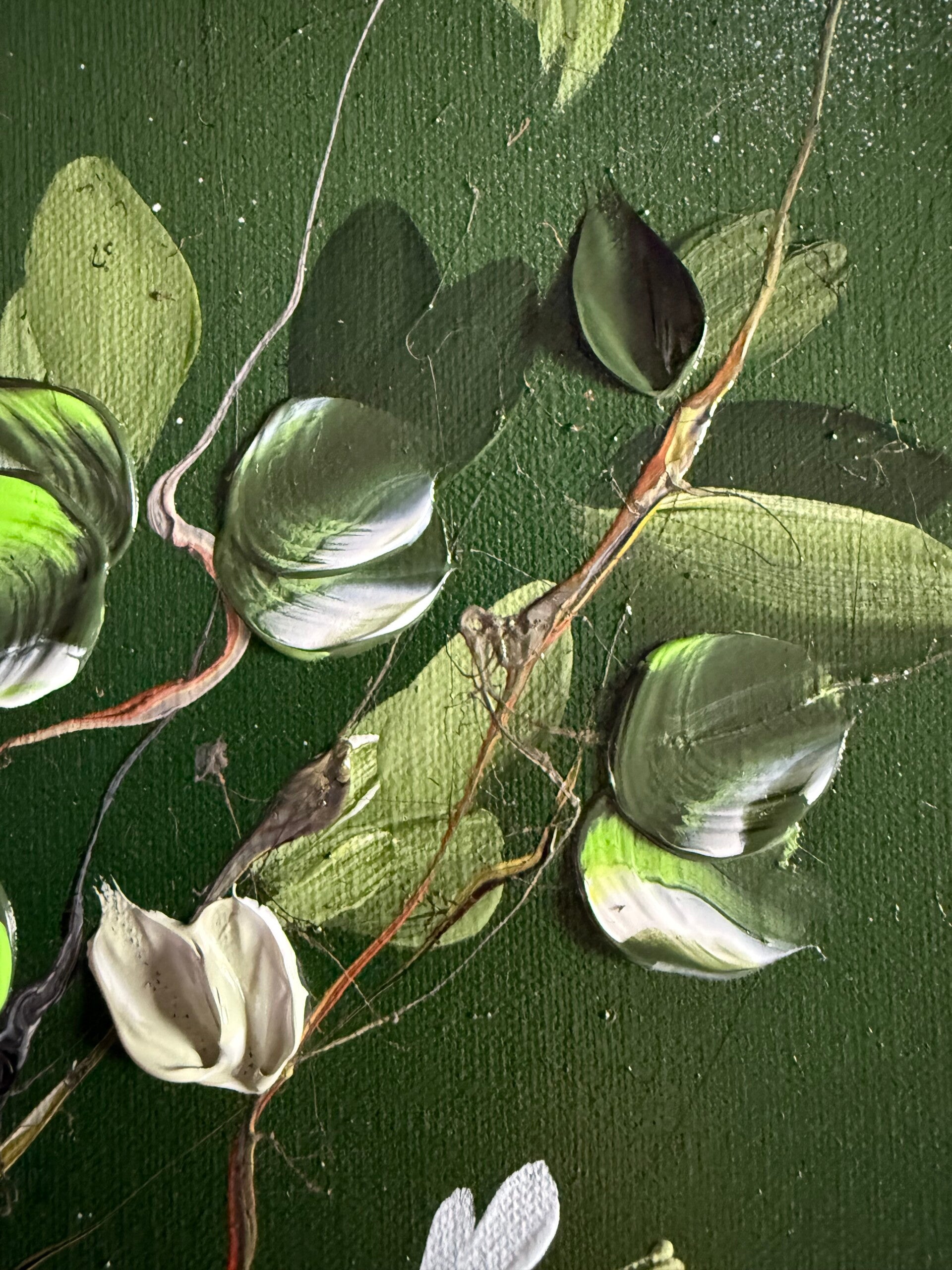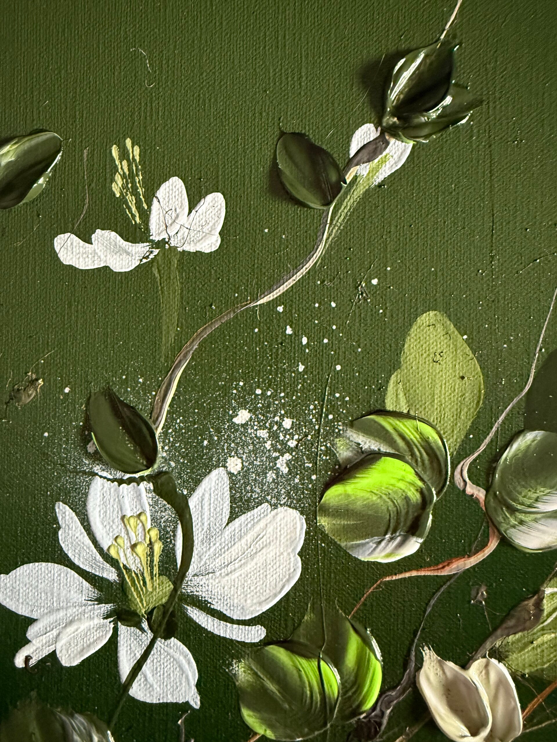 Quiet Branches II focuses on rhythm and connection. Branches intersect softly, while blossoms emerge within layered shades of green. The composition remains open and airy, allowing the background to play an active role in the overall balance.