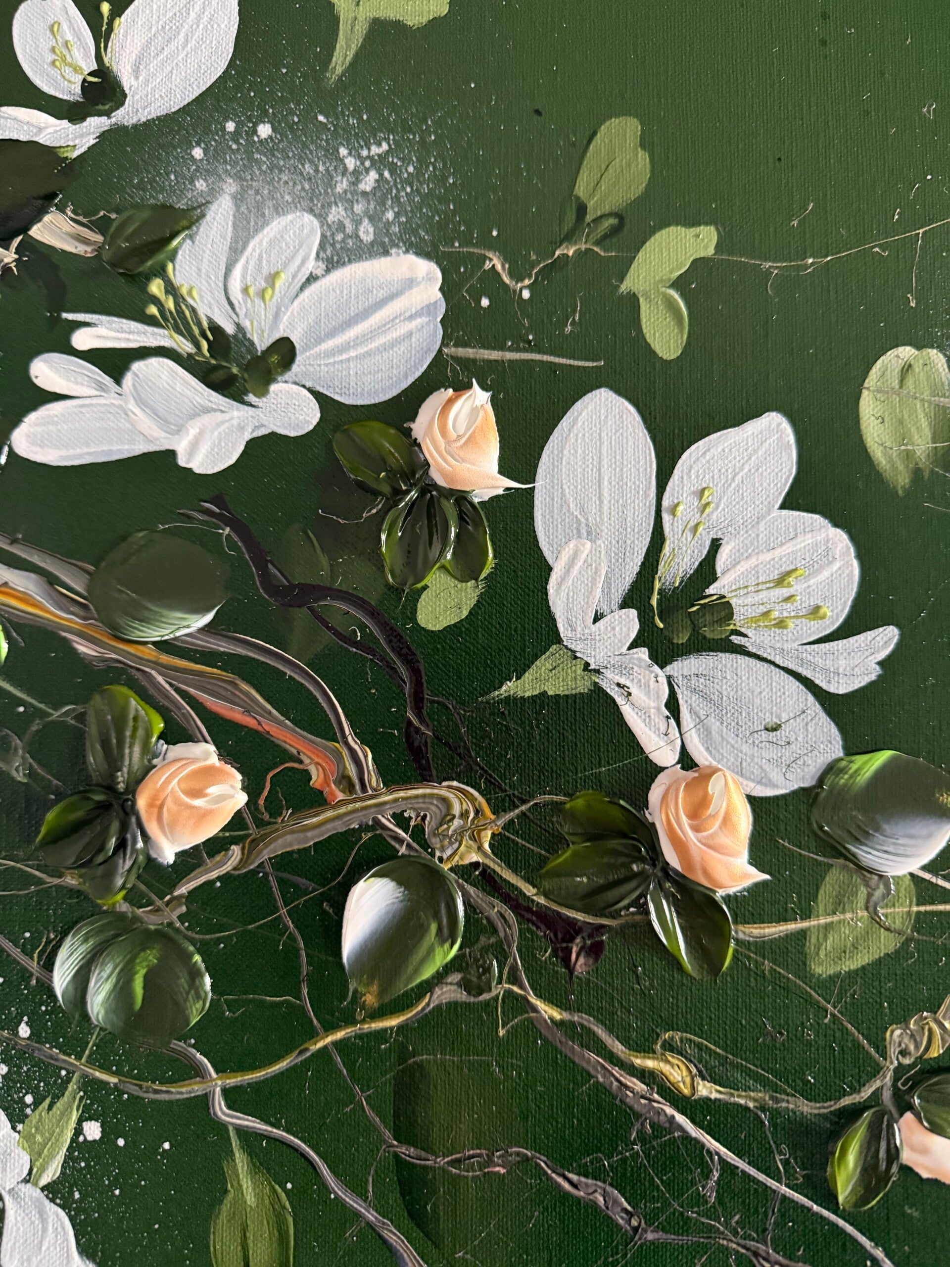 Quiet Branches I presents a restrained botanical composition set against a deep green background. Fine branches move lightly across the surface, carrying white blossoms and small buds rendered with subtle texture. The painting emphasizes balance, space, and gentle movement rather than narrative.