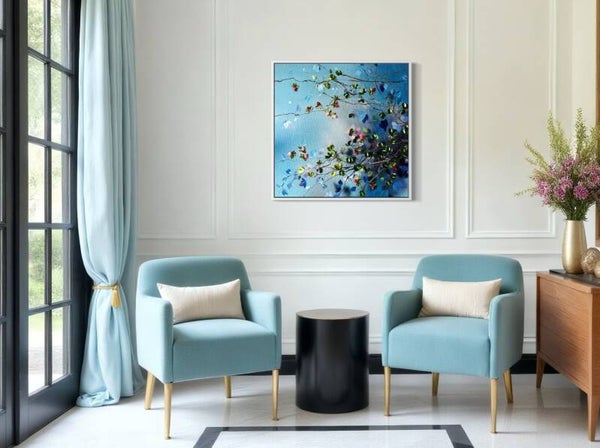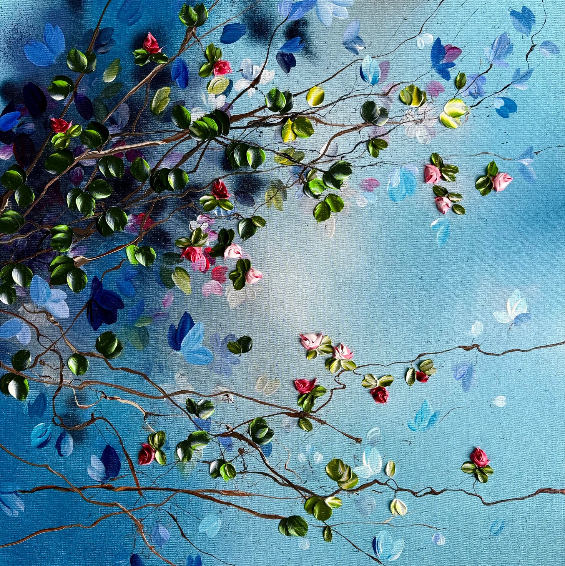 Pink Buds in Blue Air - light blue floral painting, 80 × 80 × 4 cm (31.5 × 31.5 × 1.6 in)