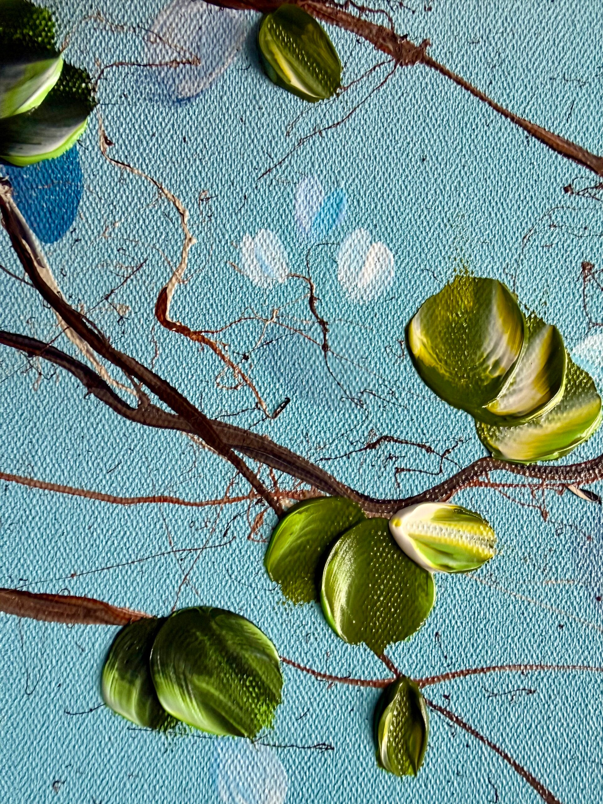 The work invites the viewer to slow down and observe the interplay of space, color, and motion — a contemplative floral abstraction that feels both airy and grounded.