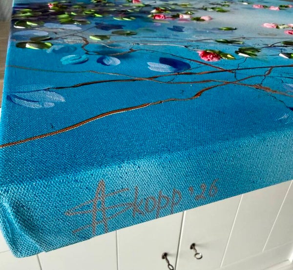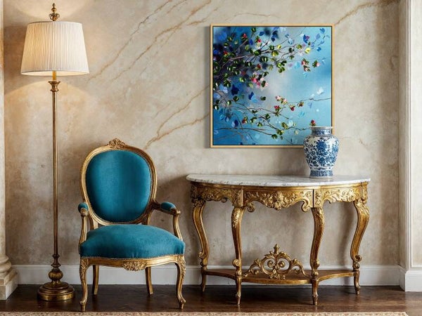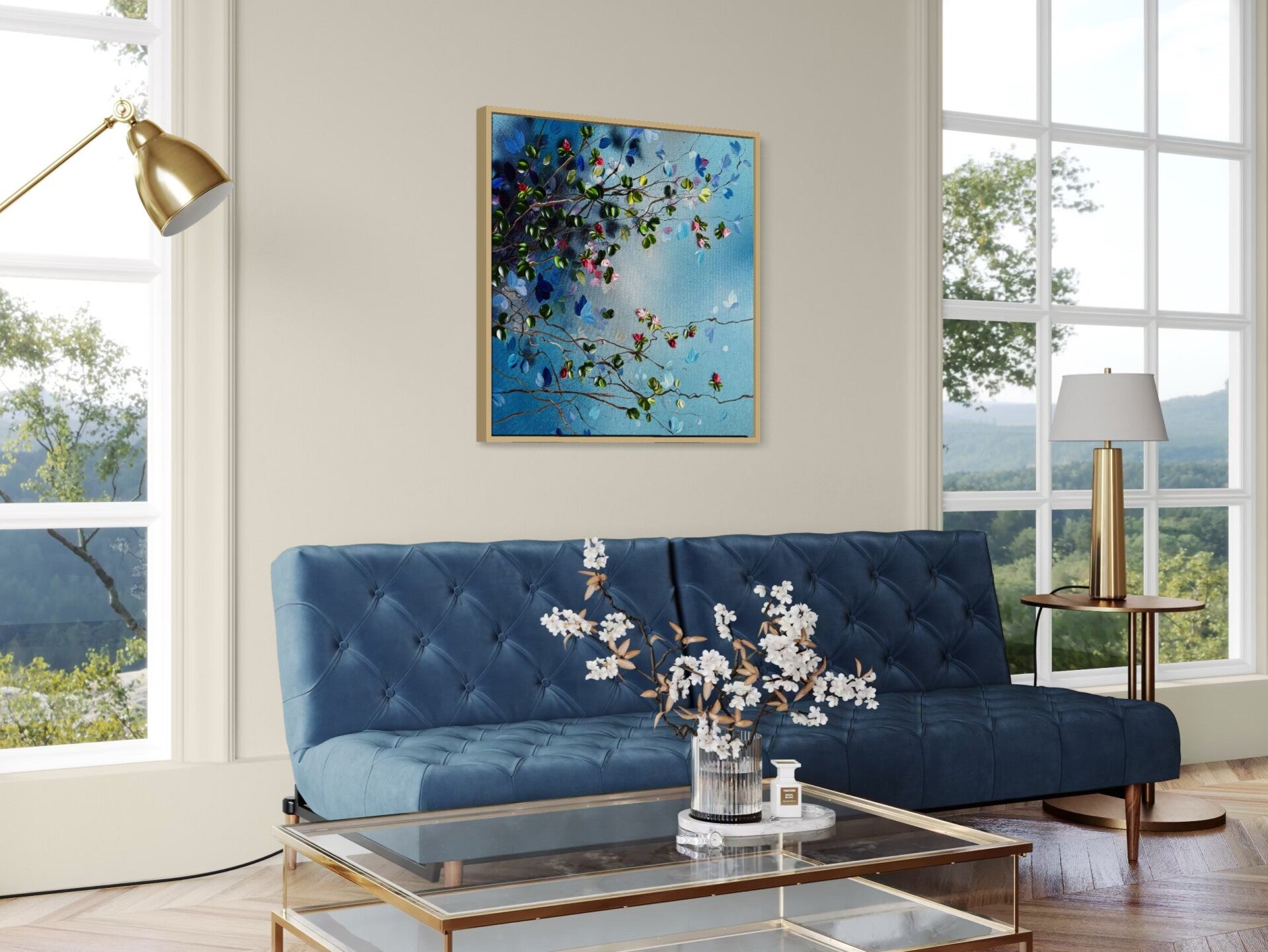 The contrast between the cool blue background and the warm pink accents evokes balance between stillness and growth, silence and awakening. Small, sculptural buds emerge as subtle focal points, suggesting fragility, renewal, and the quiet strength of nature’s cycles.