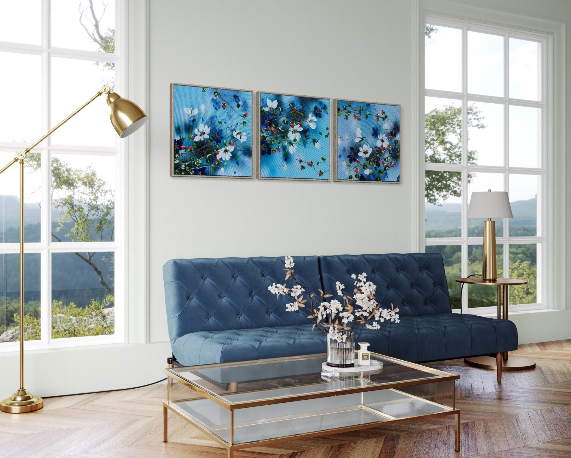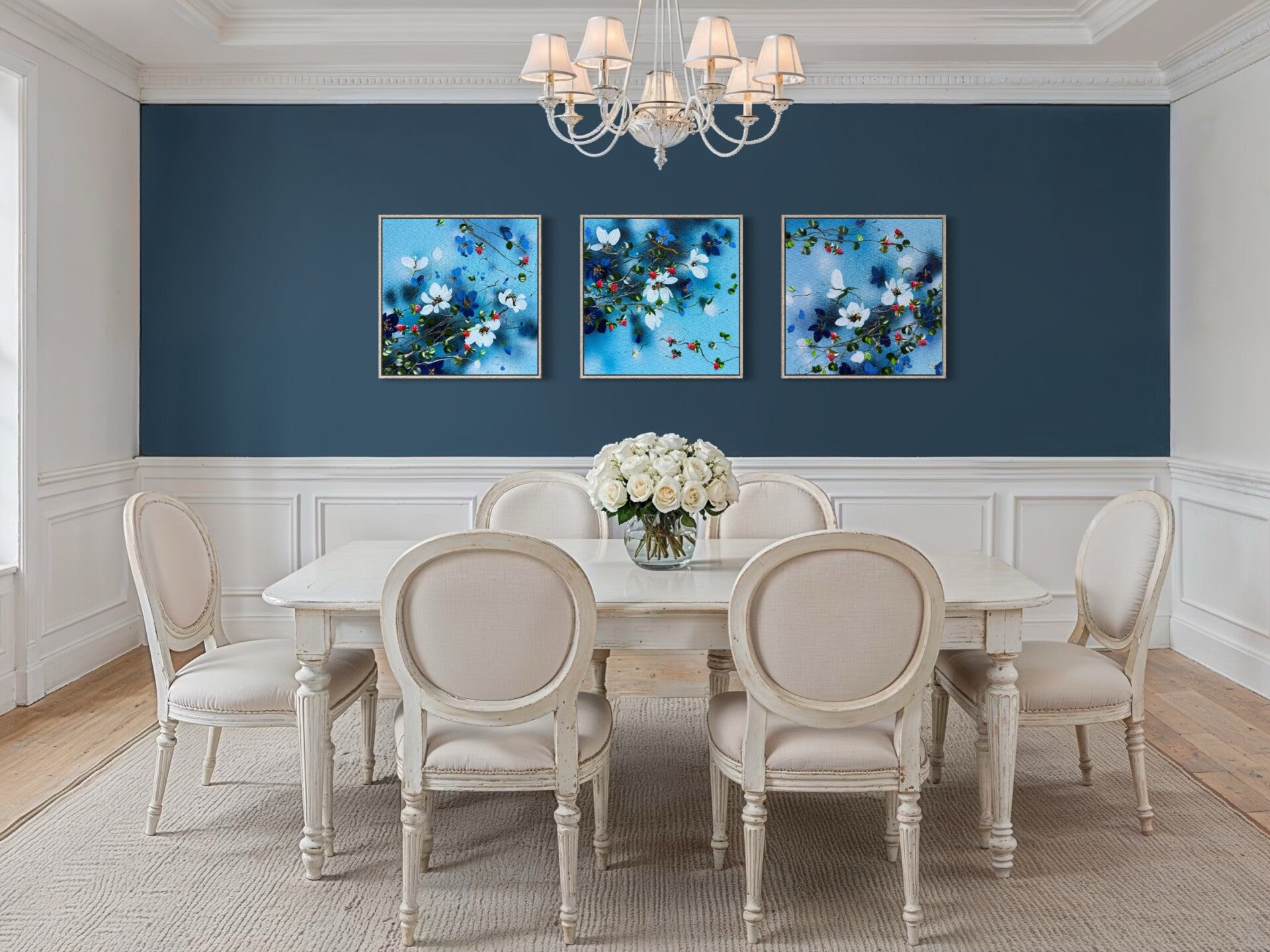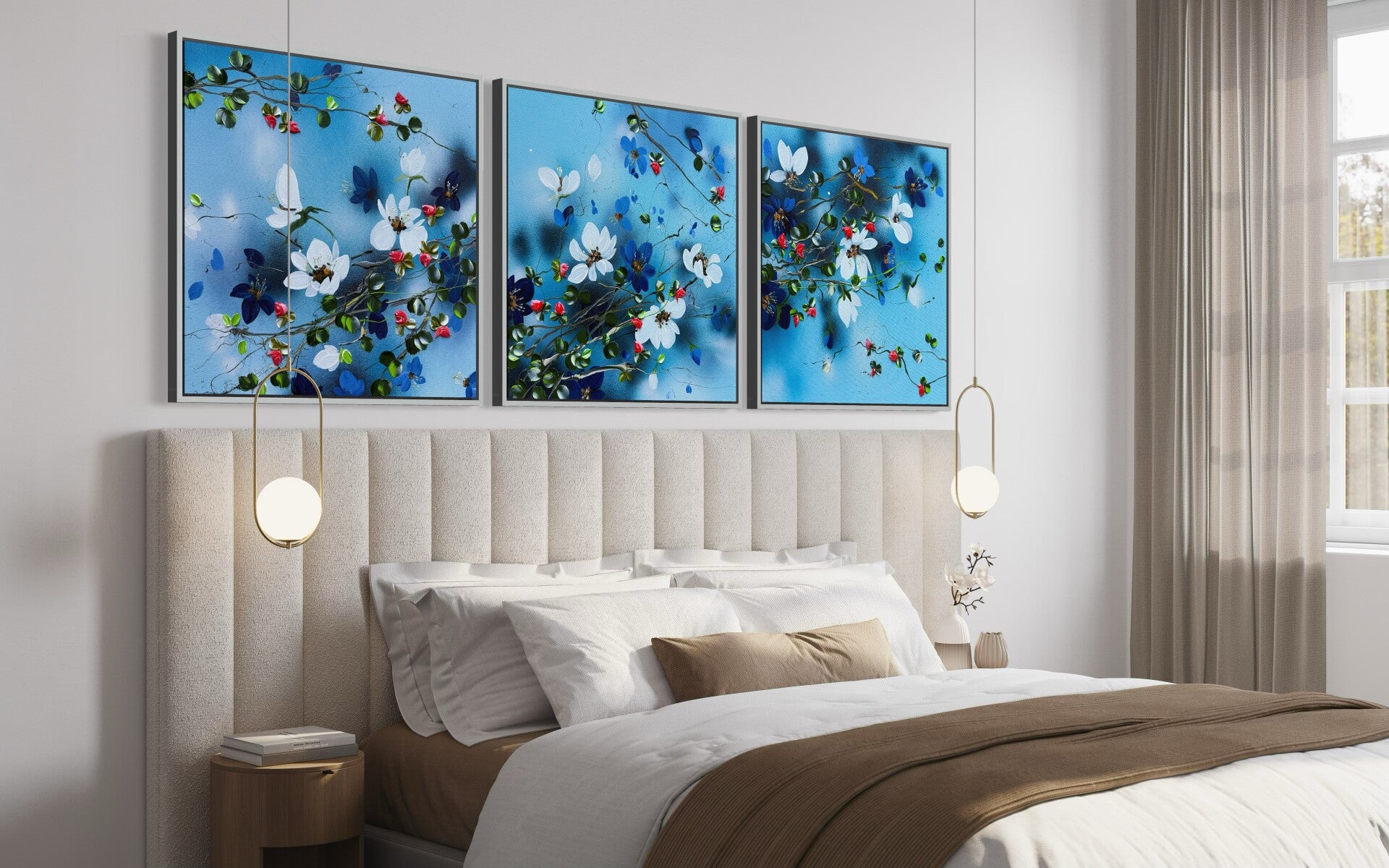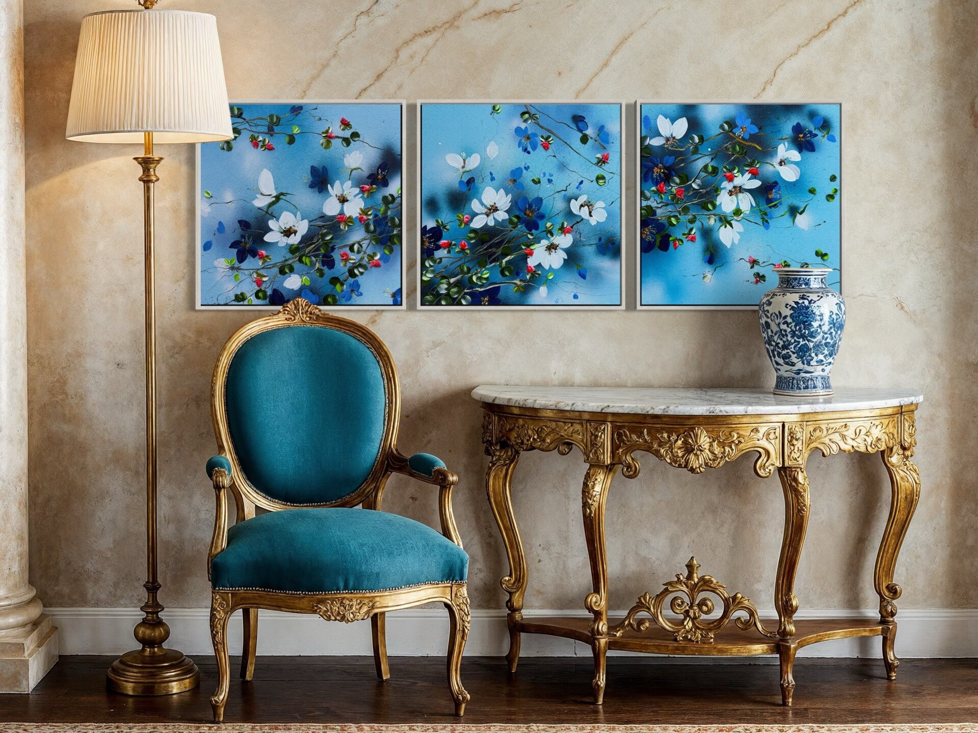 This artwork can be displayed as a standalone piece or acquired together with two other paintings from the same series and arranged as a triptych. When presented as a set of three, the works form a continuous visual flow and evoke the feeling of an unfolding floral landscape.