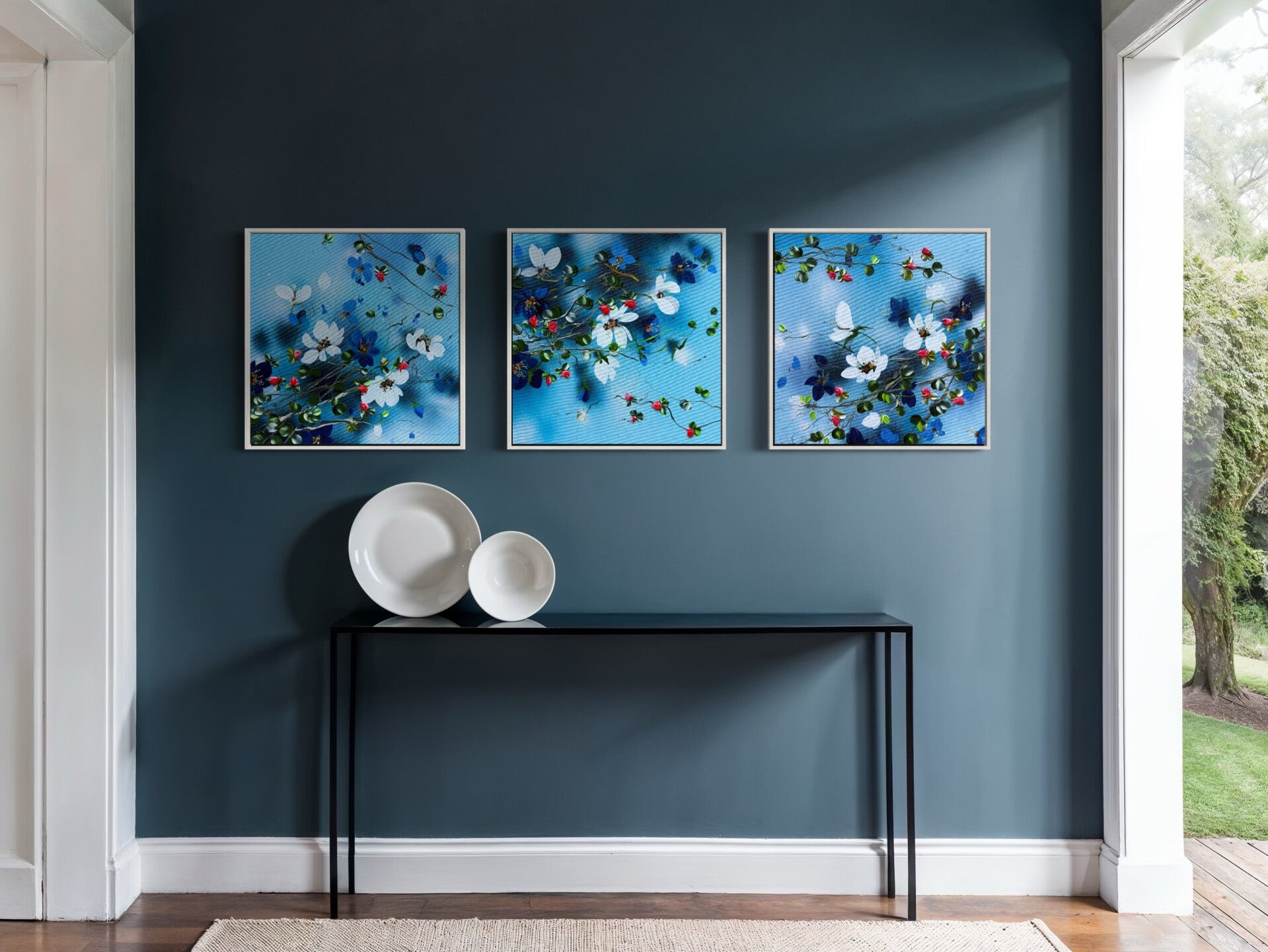 Blue Flow Triptych - deep green floral art on linen, 60 × 60 × 2 cm | 23.6 × 23.6 × 0.8 in