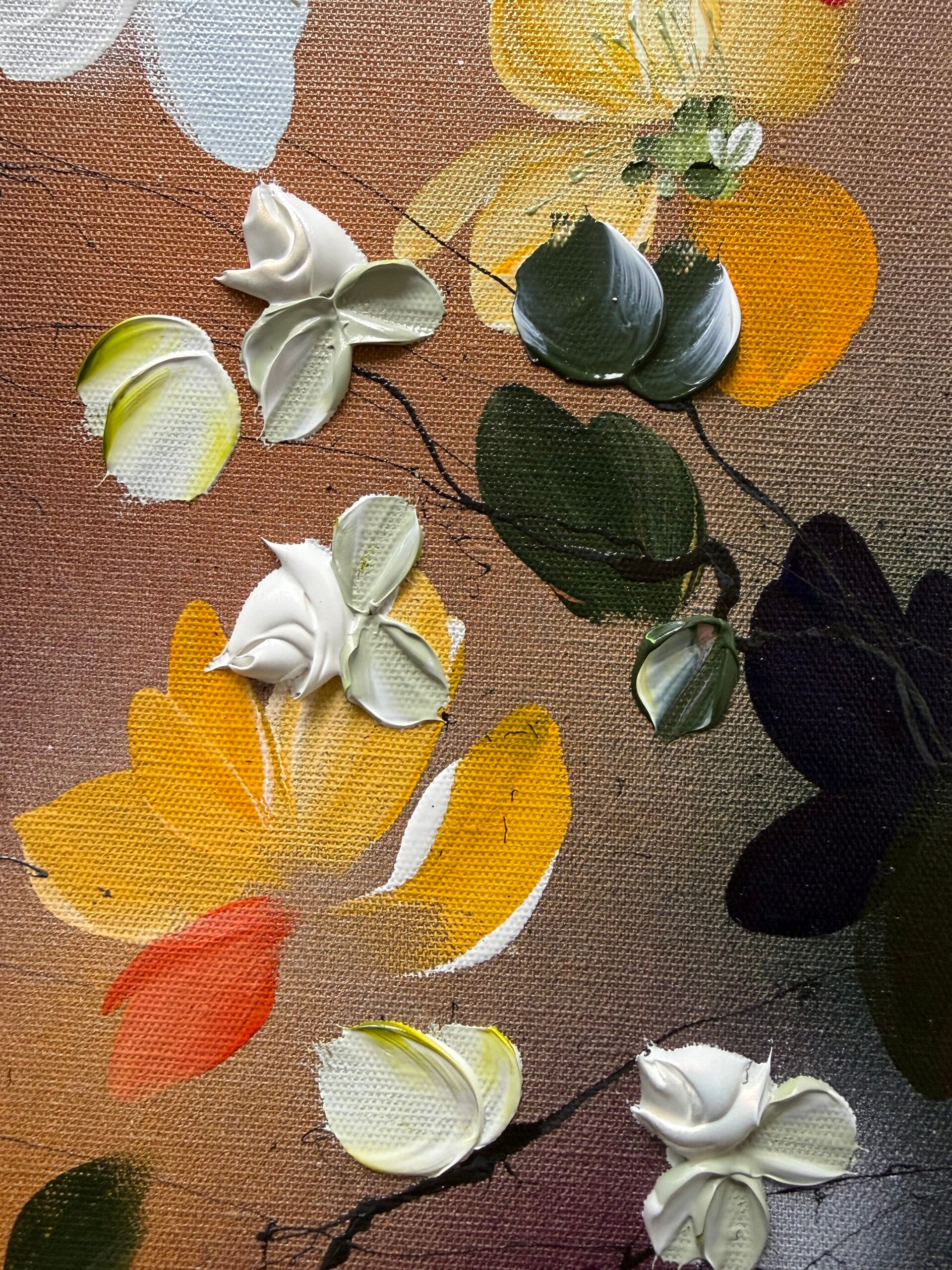 This panoramic composition unfolds like a warm breath of late-season light. Soft golden tones glow through layered blossoms while delicate white impasto buds rise from the surface, adding sculptural depth and gentle movement. Fine branches weave across the canvas, creating a sense of flow that feels both grounded and airy.