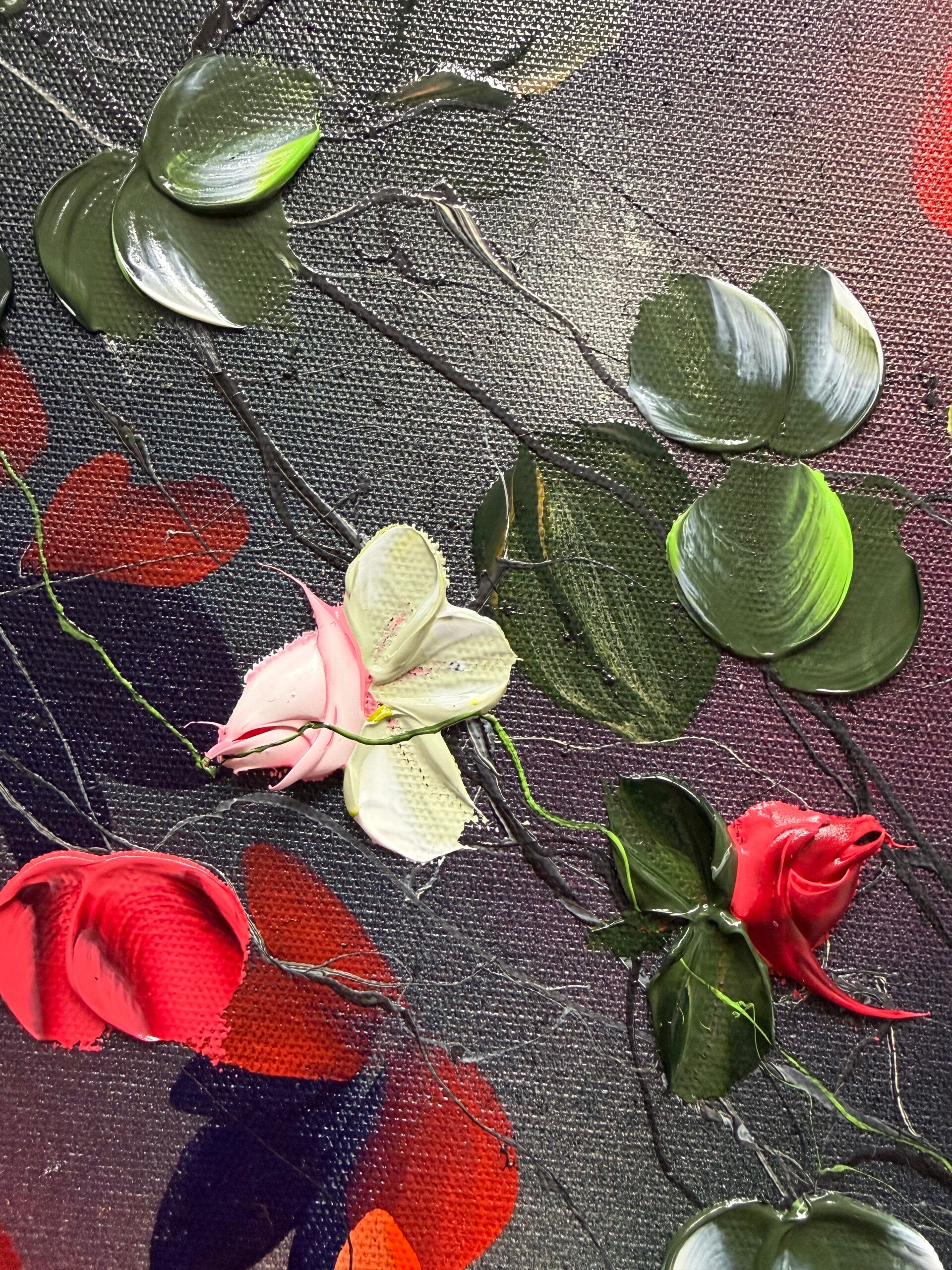 Technique and style: mixed media on linen using acrylic paint, gel medium, and textured impasto application. The work blends floral abstraction with expressive surface detail, inviting close viewing while maintaining harmony from a distance.