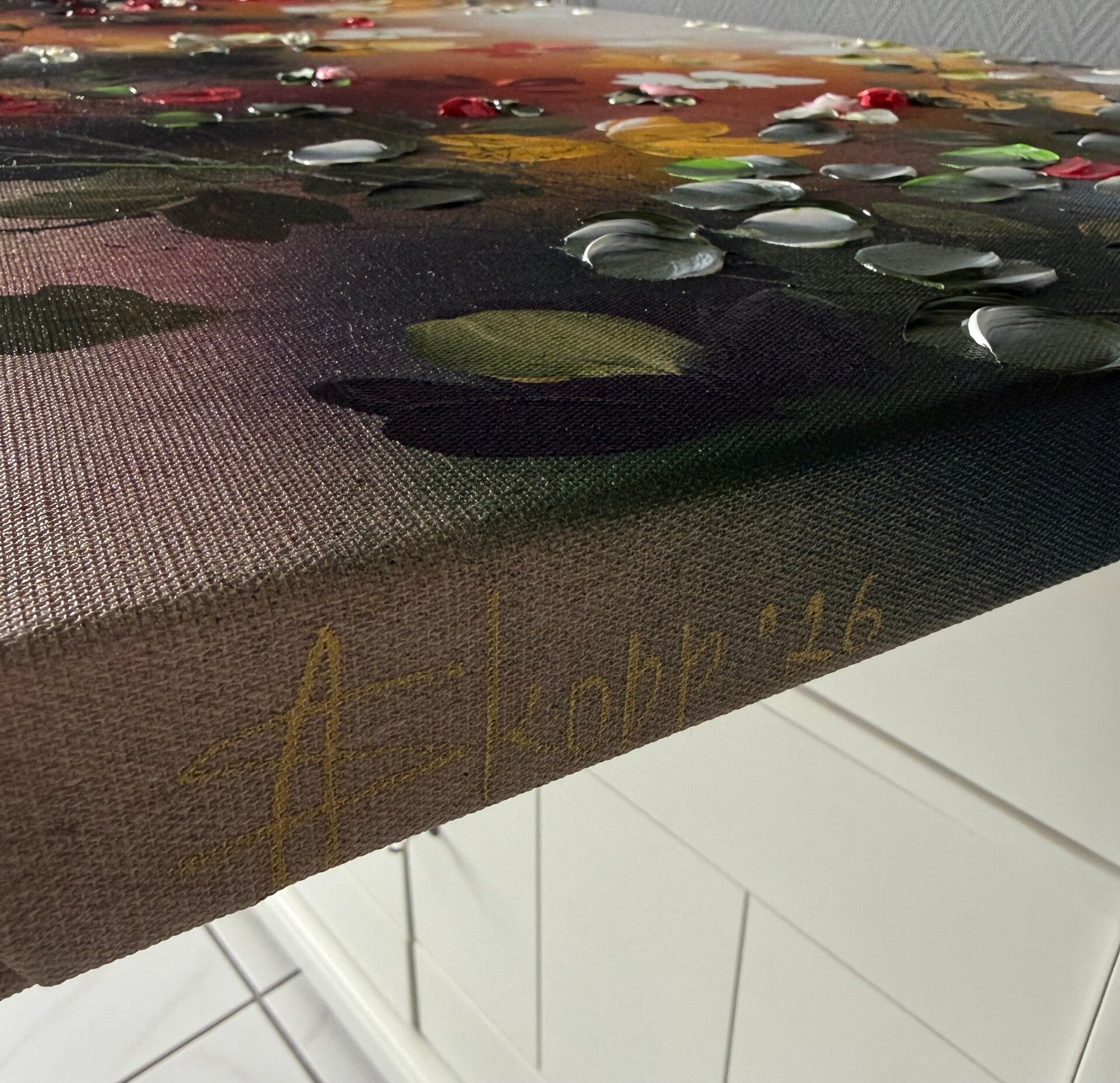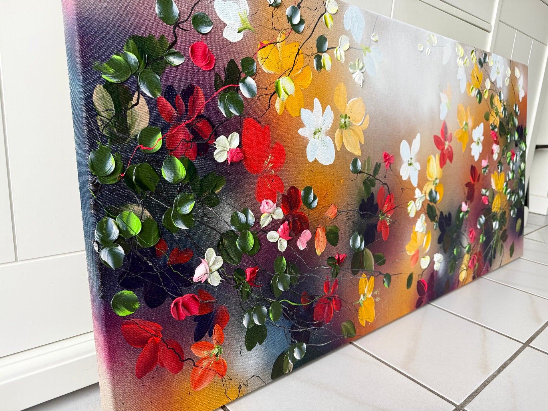 Original textured floral painting on 100% linen canvas, size 60 × 130 × 4 cm (23.6 × 51.2 × 1.6 inches). The artwork is stretched on deep gallery bars, the sides are painted, and it is ready to hang without framing. The piece is signed and comes with a Certificate of Authenticity.