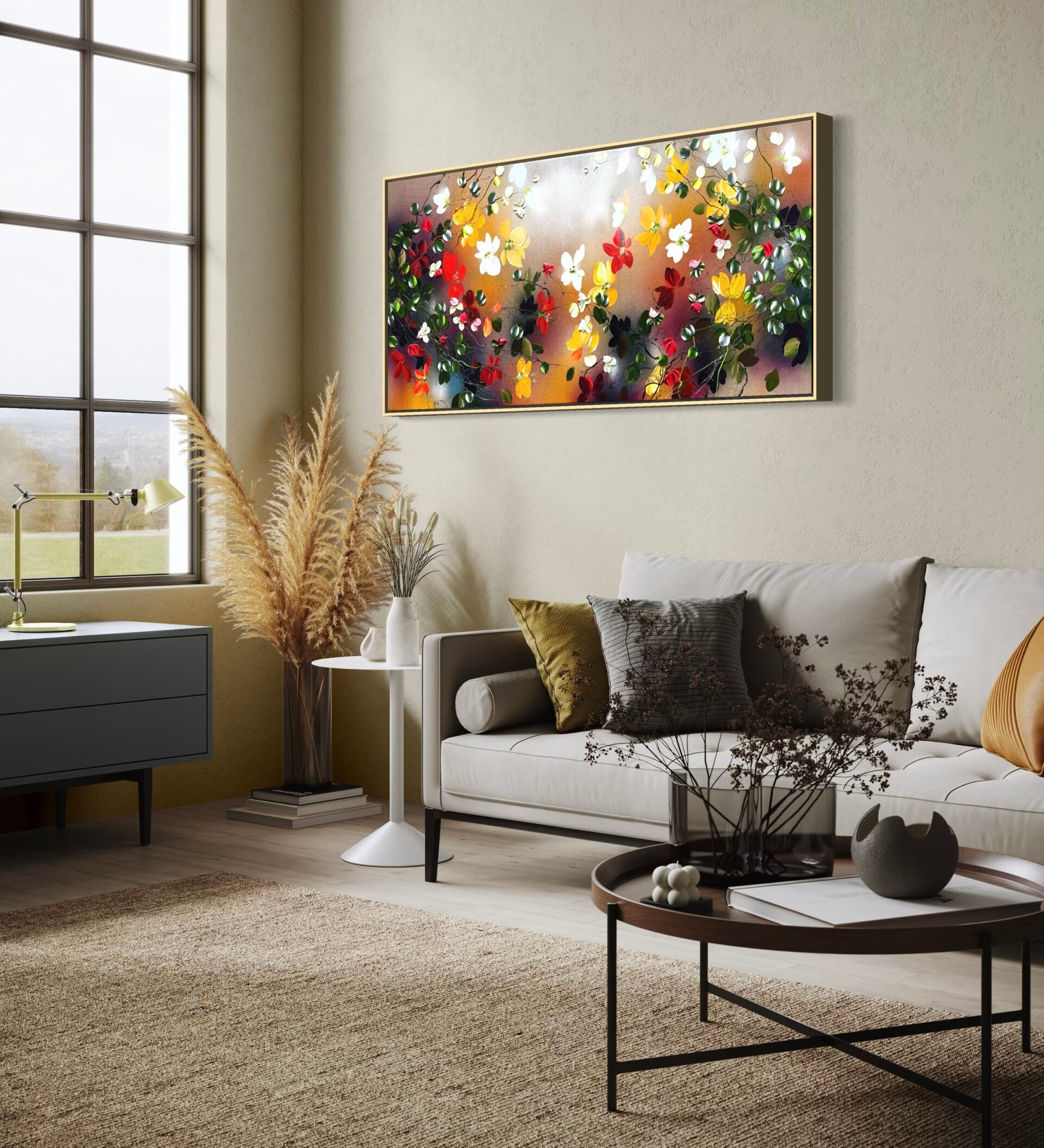 Autumn Light in Bloom - panoramic acrylic painting on linen, 60 × 130 × 4 cm (23.6 × 51.2 × 1.6 inches)
